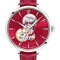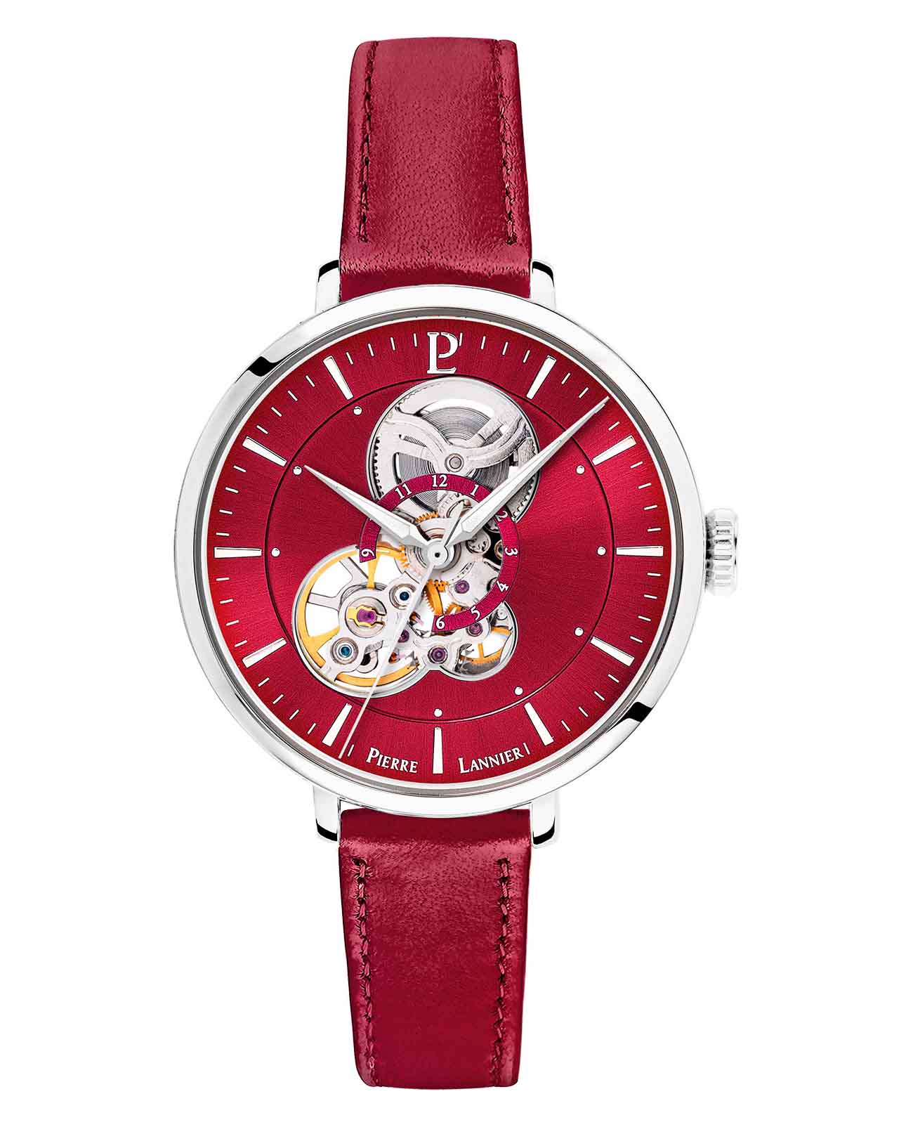 Женские механические часы с автоподзаводом Pierre Lannier Melodie 348A655. Минеральное стеклоМинеральное стеклоМинеральное стекло представляет собой искусственно выращенный минерал кварца. Такое стекло отличается особой устойчивостью к повреждениям и царапинам. Уступает по некоторым качествам сапфировому стеклу. устойчивое к мелким механическим повреждениям. Корпус выполнен из нержавеющей стали. Центральные часовая, минутная и секундная стрелки. Красный скелетонизированный циферблат. Стрелки с люминесцентным покрытиемЛюминесцентное покрытиеПозволяет считывать показания времени в темноте. Производители наносят на стрелки, часовые индексы, безель или поверхность циферблата светонакопительный состав, дающий холодное свечение.. Класс водозащиты: 30 метров, позволит защитить корпус от случайных брызг или капель дождя. Кожаный ремешок на стандартной застёжке.