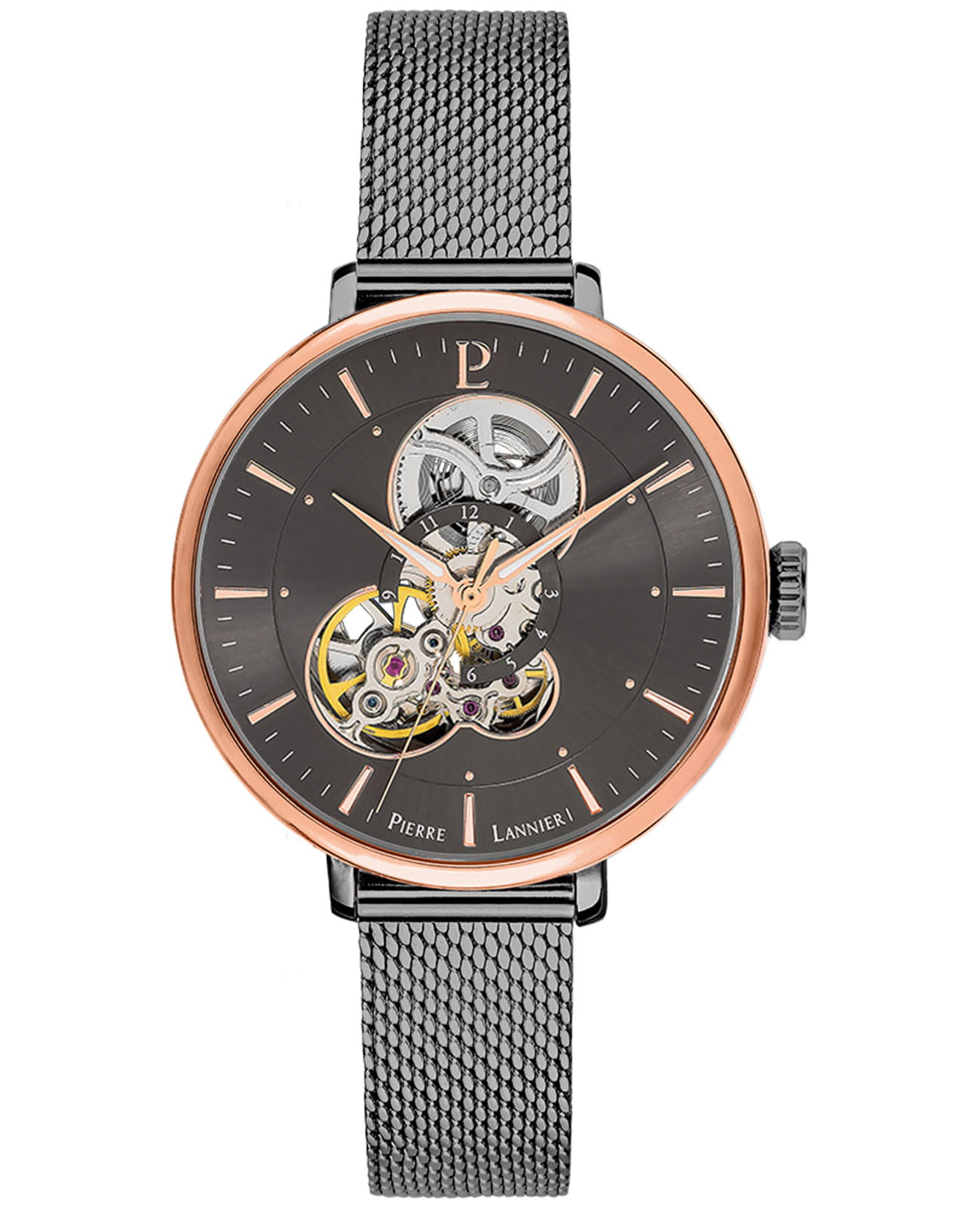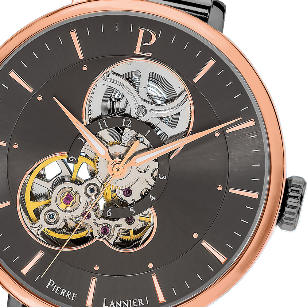 Женские механические часы с автоподзаводом Pierre Lannier Melodie 349A739. Минеральное стеклоМинеральное стеклоМинеральное стекло представляет собой искусственно выращенный минерал кварца. Такое стекло отличается особой устойчивостью к повреждениям и царапинам. Уступает по некоторым качествам сапфировому стеклу. устойчивое к мелким механическим повреждениям. Центральные часовая, минутная и секундная стрелки. Корпус и браслет выполнен из нержавеющей стали с IP-покрытиемIP-покрытиеМетод ионного напыления. Демонстрирует повышенную устойчивость к истиранию, окислению и химическим веществам. Под воздействием высокого давления и температуры около 1500°C молекулы металла надёжно соединяются с частицами корпуса часов.. Стрелки с люминесцентным покрытиемЛюминесцентное покрытиеПозволяет считывать показания времени в темноте. Производители наносят на стрелки, часовые индексы, безель или поверхность циферблата светонакопительный состав, дающий холодное свечение.. Водостойкость: 30 метров, позволит защитить корпус от случайных брызг или капель дождя. Браслет миланского плетения шириной 14 мм с раскладной застёжкойРаскладная застёжкаТакой тип застёжки используется только на браслетах из металла. Она никогда не раскрывается полностью, происходит разделение на 2 и более частей. Раскладывающая застёжка снизит вероятность потери часов к минимуму.. Серый скелетонизированный циферблат. Неподвижный безельБезельВнешний ободок, закрепляющий стекло. В спортивных часах так называется поворотное кольцо с делениями на циферблате, выполняет роль таймера – замеряет отрезки времени на шкале. Неподвижный безель – элемент декора. Однонаправленно вращающийся безель на дайверских часах позволяет фиксировать моменты погружения и выныривания на поверхность. с розовым IP-покрытиемIP-покрытиеМетод ионного напыления. Демонстрирует повышенную устойчивость к истиранию, окислению и химическим веществам. Под воздействием высокого давления и температуры около 1500°C молекулы металла надёжно соединяются с частицами корпуса часов..