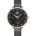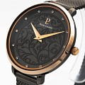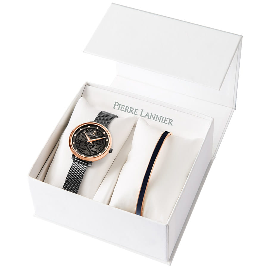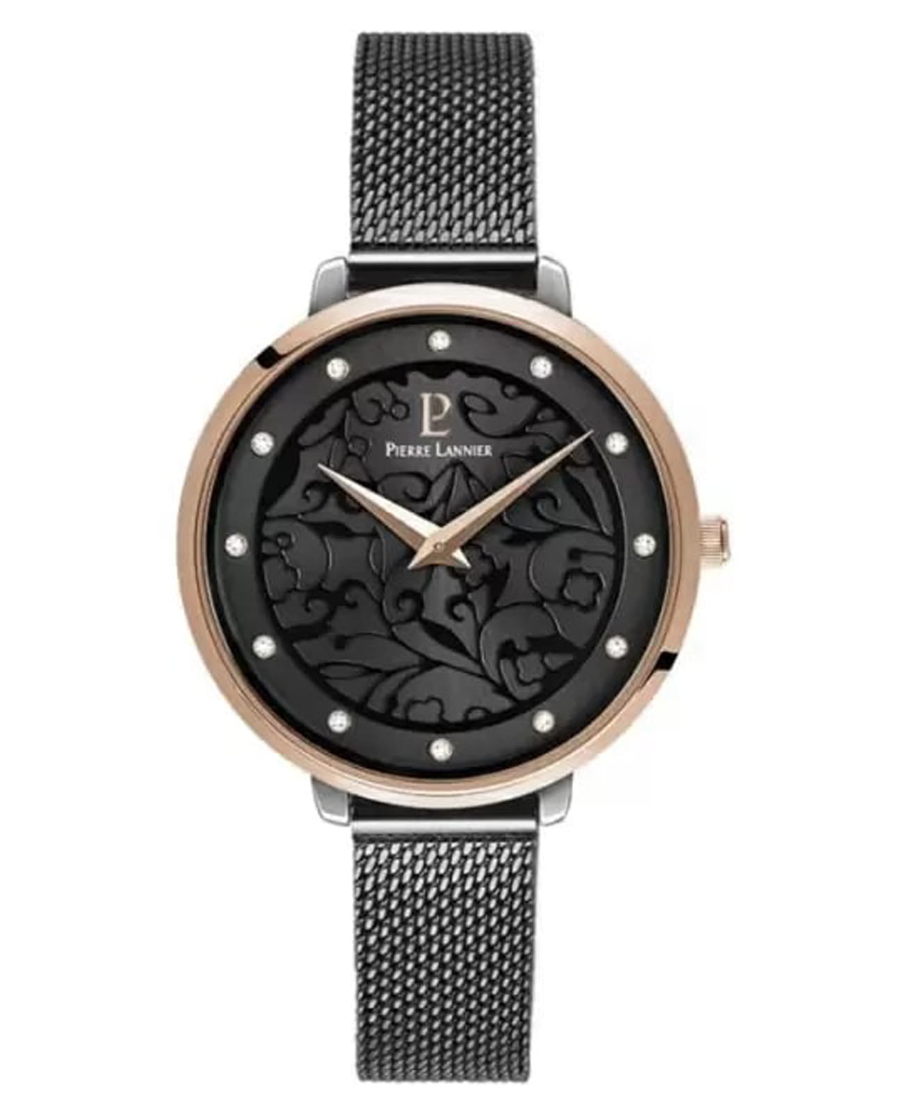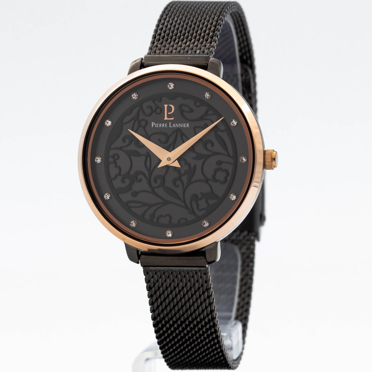 Женские кварцевые часы Pierre Lannier Eolia 358G988. Минеральное стеклоМинеральное стеклоМинеральное стекло представляет собой искусственно выращенный минерал кварца. Такое стекло отличается особой устойчивостью к повреждениям и царапинам. Уступает по некоторым качествам сапфировому стеклу. устойчивое к мелким механическим повреждениям. Центральные часовая и минутная стрелки. Черный циферблат с часовыми индексами в виде точек. Круглый корпус выполнен из нержавеющей стали с IP-покрытиемIP-покрытиеМетод ионного напыления. Демонстрирует повышенную устойчивость к истиранию, окислению и химическим веществам. Под воздействием высокого давления и температуры около 1500°C молекулы металла надёжно соединяются с частицами корпуса часов. цвета розового золота. Диаметр корпуса составляет 33 мм. Стальной браслет с IP-покрытиемIP-покрытиеМетод ионного напыления. Демонстрирует повышенную устойчивость к истиранию, окислению и химическим веществам. Под воздействием высокого давления и температуры около 1500°C молекулы металла надёжно соединяются с частицами корпуса часов., раскладная застёжкаРаскладная застёжкаТакой тип застёжки используется только на браслетах из металла. Она никогда не раскрывается полностью, происходит разделение на 2 и более частей. Раскладывающая застёжка снизит вероятность потери часов к минимуму.. Водостойкость WR 30. Часы украшены кристаллами. Браслет в комплекте.