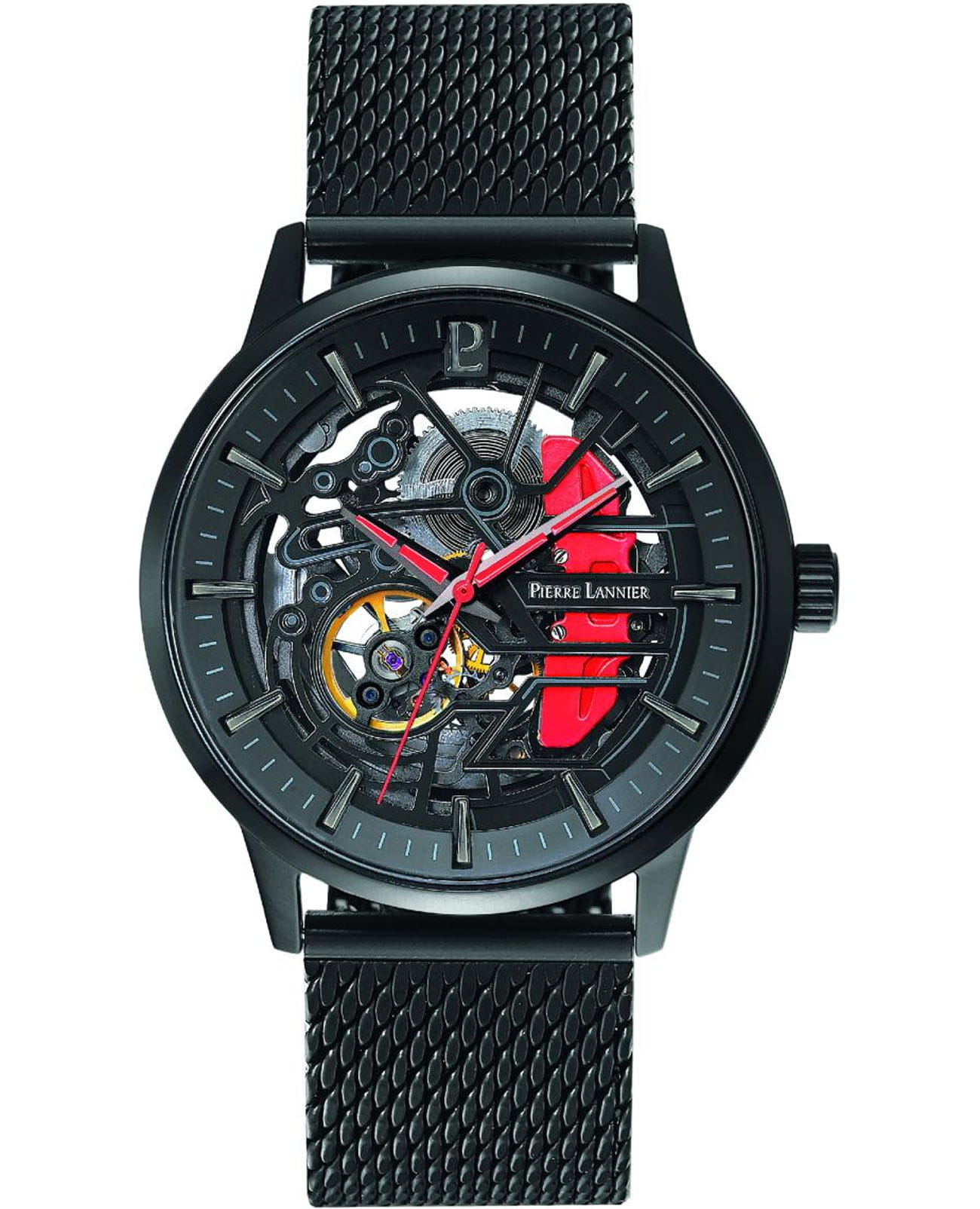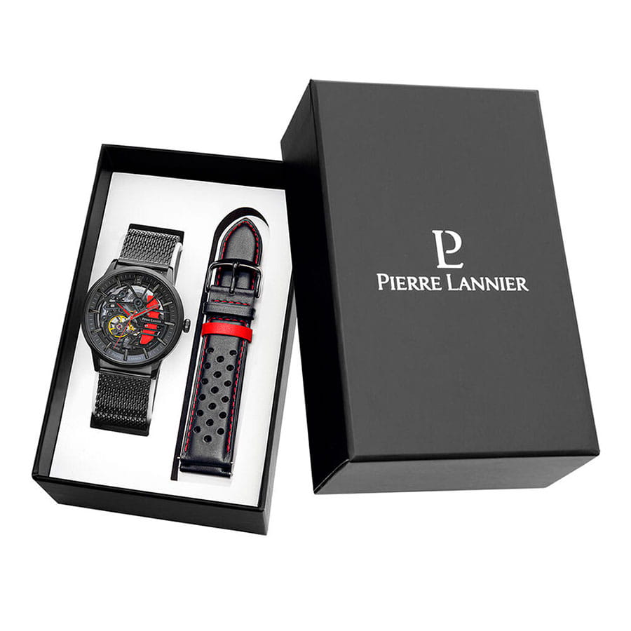 Мужские механические часы с автоподзаводом Pierre Lannier Paddock 385C439. Минеральное стеклоМинеральное стеклоМинеральное стекло представляет собой искусственно выращенный минерал кварца. Такое стекло отличается особой устойчивостью к повреждениям и царапинам. Уступает по некоторым качествам сапфировому стеклу. устойчивое к мелким механическим повреждениям. Центральные часовая, минутная и секундная стрелки. Корпус выполнен из нержавеющей стали с IP-покрытиемIP-покрытиеМетод ионного напыления. Демонстрирует повышенную устойчивость к истиранию, окислению и химическим веществам. Под воздействием высокого давления и температуры около 1500°C молекулы металла надёжно соединяются с частицами корпуса часов.. Водостойкость: 50 метров, позволит защитить корпус от случайных брызг или капель дождя. Стальной браслет миланского плетения с раскладной застёжкойРаскладная застёжкаТакой тип застёжки используется только на браслетах из металла. Она никогда не раскрывается полностью, происходит разделение на 2 и более частей. Раскладывающая застёжка снизит вероятность потери часов к минимуму.. Черный скелетонизированный циферблат. В комплекте черный кожаный ремешок с перфорацией.