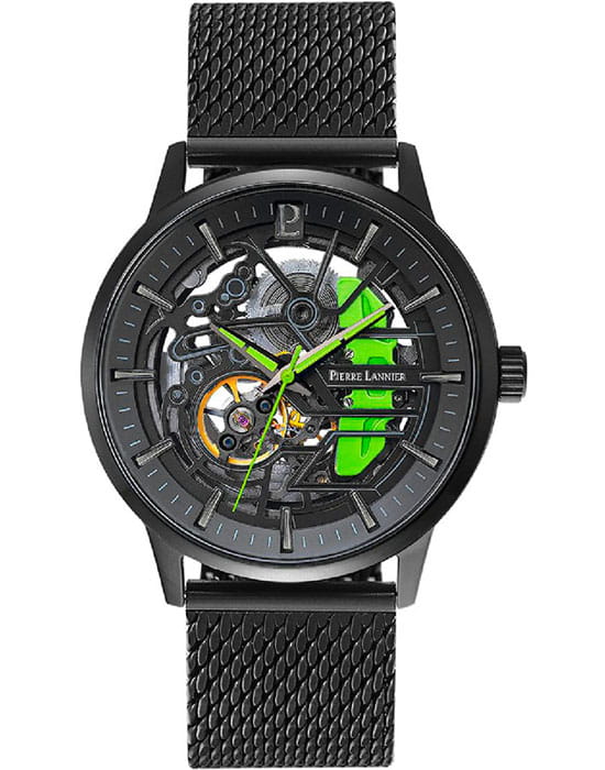 Pierre Lannier Paddock 385C479 — выразительная мужская модель с акцентом на динамику, контраст и механическое превосходство. Корпус диаметром 43 мм выполнен из нержавеющей стали с глубоким матовым PVD-покрытиемPVDУльтратонкое покрытие наносится в технике вакуумного напыления, сочетает в себе нитрид титана особой прочности со слоем золота или оксида хрома. Несёт в себе декоративную или защитную функцию., придающим часам современный спортивный облик. Циферблат скелетонизирован частично — сквозь его структуру открывается вид на баланс и элементы механизма, что подчёркивает технический характер часов. Акценты зелёного цвета на стрелках и внутреннем кольце создают эффект свежести и подчёркивают гоночную эстетику. Циферблат защищён прочным минеральным стекломМинеральное стеклоМинеральное стекло представляет собой искусственно выращенный минерал кварца. Такое стекло отличается особой устойчивостью к повреждениям и царапинам. Уступает по некоторым качествам сапфировому стеклу., устойчивым к повседневным повреждениям и царапинам. В основе — автоматический механизм с автоподзаводом и запасом хода около 42 часов. В комплекте: миланский браслет из стали. Оснащён надёжной на раскладном замкеРаскладной замокДанный вариант застежки используется только на часах с металлическим браслетом. Отличительная особенность такого крепления в том, что длина браслета становится универсальной и вы можете самостоятельно отрегулировать нужный вам размер – застежка просто двигается по браслету часов., что обеспечивает удобство смены и комфорт в носке. Водонепроницаемость до 5 ATM делает модель пригодной для ежедневной носки, включая защите от брызг и дождя. 385C479 Paddock — это часы с характером: стильные, мощные, технически выразительные, подойдут тем, кто ищет баланс между инженерной эстетикой и городским стилем.