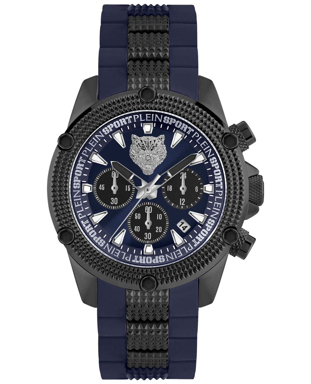 Немецкие кварцевые унисекс часы-хронографХронографФункция позволяет измерять отрезки времени с особой точностью: часы, минуты, секунды. Верным признаком хронографа является наличие на циферблате 3 дополнительных окошек-счётчиков. с секундомеромСекундомерСекундоме́р — прибор, способный измерять интервалы времени с точностью до долей секунды. Plein Sport Hurricane PSDBA0123, кварцевый механизм с высокой точностью. Класс водозащиты: 50 метров, позволит защитить корпус от случайных брызг или капель дождя. Корпус выполнен из стали с IP-покрытиемIP-покрытиеМетод ионного напыления. Демонстрирует повышенную устойчивость к истиранию, окислению и химическим веществам. Под воздействием высокого давления и температуры около 1500°C молекулы металла надёжно соединяются с частицами корпуса часов.. Стрелки и метки с люминесцентным покрытиемЛюминесцентное покрытиеПозволяет считывать показания времени в темноте. Производители наносят на стрелки, часовые индексы, безель или поверхность циферблата светонакопительный состав, дающий холодное свечение.. Силиконовый браслет на стандартной застежке. Минеральное стеклоМинеральное стеклоМинеральное стекло представляет собой искусственно выращенный минерал кварца. Такое стекло отличается особой устойчивостью к повреждениям и царапинам. Уступает по некоторым качествам сапфировому стеклу. устойчивое к мелким механическим повреждениям. Окошко даты находится в положении между 4 и 5 часов.
