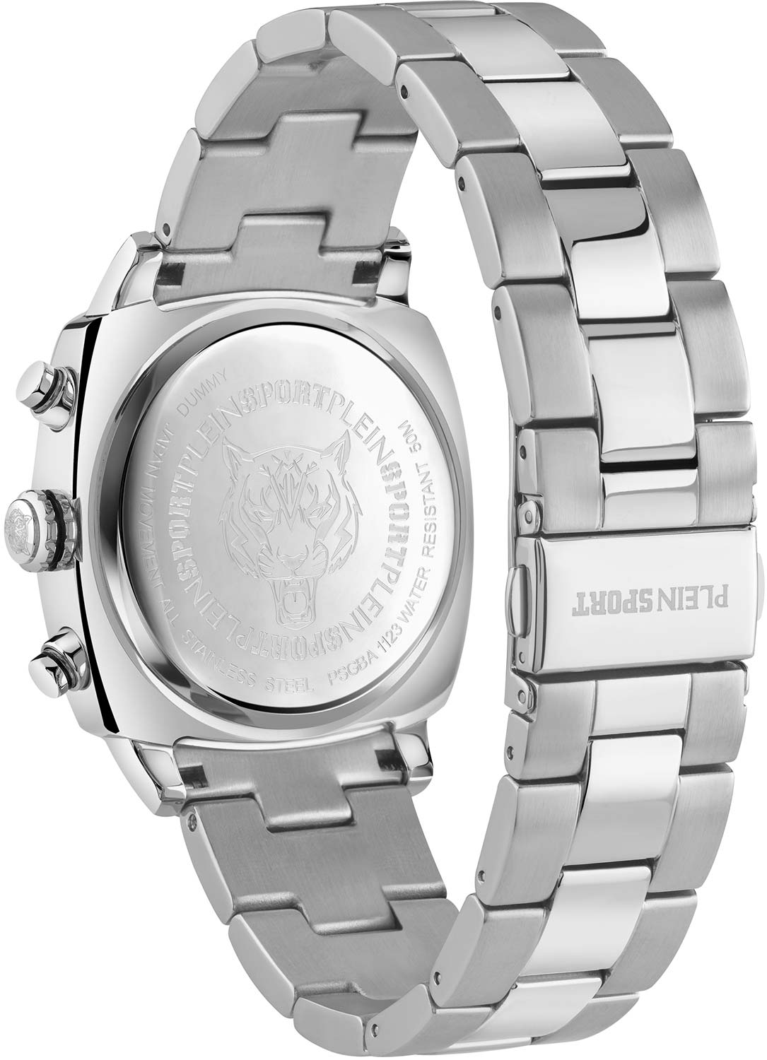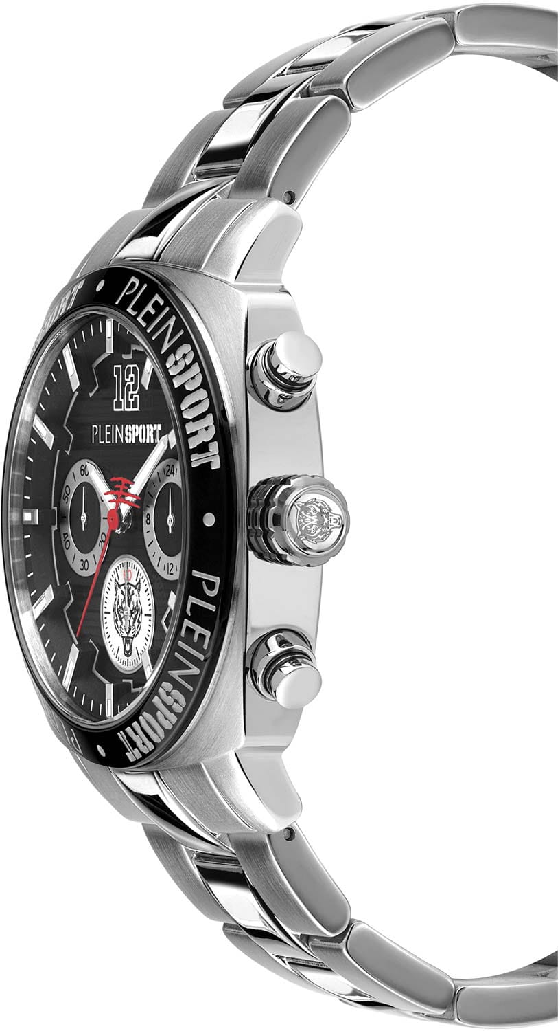 Немецкие мужские кварцевые часы-хронографХронографФункция позволяет измерять отрезки времени с особой точностью: часы, минуты, секунды. Верным признаком хронографа является наличие на циферблате 3 дополнительных окошек-счётчиков. с секундомеромСекундомерСекундоме́р — прибор, способный измерять интервалы времени с точностью до долей секунды. Plein Sport Wildcat PSGBA1123, кварцевый механизм с высокой точностью. Класс водозащиты: 50 метров, позволит защитить корпус от случайных брызг или капель дождя. Корпус часов изготовлен из нержавеюещей стали. Стрелки и метки с люминесцентным покрытиемЛюминесцентное покрытиеПозволяет считывать показания времени в темноте. Производители наносят на стрелки, часовые индексы, безель или поверхность циферблата светонакопительный состав, дающий холодное свечение.. Стальной браслет на раскладной застёжкеРаскладная застёжкаТакой тип застёжки используется только на браслетах из металла. Она никогда не раскрывается полностью, происходит разделение на 2 и более частей. Раскладывающая застёжка снизит вероятность потери часов к минимуму.. Окошко даты находится в положении между 4 и 5 часов. БезельБезельВнешний ободок, закрепляющий стекло. В спортивных часах так называется поворотное кольцо с делениями на циферблате, выполняет роль таймера – замеряет отрезки времени на шкале. Неподвижный безель – элемент декора. Однонаправленно вращающийся безель на дайверских часах позволяет фиксировать моменты погружения и выныривания на поверхность. с IP-покрытиемIP-покрытиеМетод ионного напыления. Демонстрирует повышенную устойчивость к истиранию, окислению и химическим веществам. Под воздействием высокого давления и температуры около 1500°C молекулы металла надёжно соединяются с частицами корпуса часов..