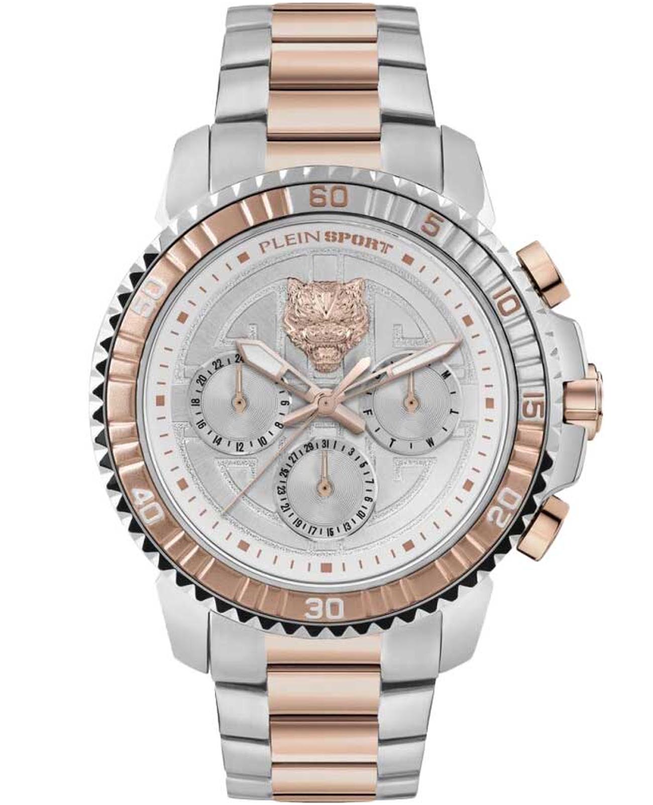 Немецкие мужские кварцевые часы Plein Sport Powerlift PSPBA1023, кварцевый механизм с высокой точностью. Класс водозащиты: 50 метров, позволит защитить корпус от случайных брызг или капель дождя. Корпус и браслет часов изготовлен из нержавеющей стали. Стальной браслет с частичным IP-покрытиемIP-покрытиеМетод ионного напыления. Демонстрирует повышенную устойчивость к истиранию, окислению и химическим веществам. Под воздействием высокого давления и температуры около 1500°C молекулы металла надёжно соединяются с частицами корпуса часов. на раскладной застёжкеРаскладная застёжкаТакой тип застёжки используется только на браслетах из металла. Она никогда не раскрывается полностью, происходит разделение на 2 и более частей. Раскладывающая застёжка снизит вероятность потери часов к минимуму.. Время в 24-х часовом формате, дата и день недели вынесены на отдельные циферблаты. Стрелки и метки с люминесцентным покрытиемЛюминесцентное покрытиеПозволяет считывать показания времени в темноте. Производители наносят на стрелки, часовые индексы, безель или поверхность циферблата светонакопительный состав, дающий холодное свечение.. БезельБезельВнешний ободок, закрепляющий стекло. В спортивных часах так называется поворотное кольцо с делениями на циферблате, выполняет роль таймера – замеряет отрезки времени на шкале. Неподвижный безель – элемент декора. Однонаправленно вращающийся безель на дайверских часах позволяет фиксировать моменты погружения и выныривания на поверхность. с IP-покрытиемIP-покрытиеМетод ионного напыления. Демонстрирует повышенную устойчивость к истиранию, окислению и химическим веществам. Под воздействием высокого давления и температуры около 1500°C молекулы металла надёжно соединяются с частицами корпуса часов..