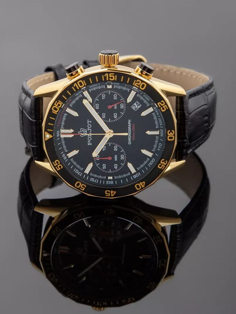 Poljot 6S21.186251 — яркие мужские часы с выразительным спортивным характером и акцентом на функциональность. Корпус из нержавеющей стали с PVD-покрытиемPVDУльтратонкое покрытие наносится в технике вакуумного напыления, сочетает в себе нитрид титана особой прочности со слоем золота или оксида хрома. Несёт в себе декоративную или защитную функцию. придаёт модели надёжность и солидность, а насыщенный циферблат с контрастными счётчиками хронографаХронографФункция позволяет измерять отрезки времени с особой точностью: часы, минуты, секунды. Верным признаком хронографа является наличие на циферблате 3 дополнительных окошек-счётчиков. создаёт динамичный и энергичный облик. БезельБезельВнешний ободок, закрепляющий стекло. В спортивных часах так называется поворотное кольцо с делениями на циферблате, выполняет роль таймера – замеряет отрезки времени на шкале. Неподвижный безель – элемент декора. Однонаправленно вращающийся безель на дайверских часах позволяет фиксировать моменты погружения и выныривания на поверхность. с PVD-покрытиемPVDУльтратонкое покрытие наносится в технике вакуумного напыления, сочетает в себе нитрид титана особой прочности со слоем золота или оксида хрома. Несёт в себе декоративную или защитную функцию.. Широкие стрелки и метки с люминесцентным покрытиемЛюминесцентное покрытиеПозволяет считывать показания времени в темноте. Производители наносят на стрелки, часовые индексы, безель или поверхность циферблата светонакопительный состав, дающий холодное свечение. обеспечивают отличную читаемость в любых условиях, а внешний обод с минутной шкалой подчёркивает спортивный стиль. Окно даты добавляет практичности. Прочное минеральное стеклоМинеральное стеклоМинеральное стекло представляет собой искусственно выращенный минерал кварца. Такое стекло отличается особой устойчивостью к повреждениям и царапинам. Уступает по некоторым качествам сапфировому стеклу. надёжно защищает циферблат от повреждений, а ремешок из натуральной кожи гармонично дополняет контрастную цветовую палитру. Poljot — это смелое сочетание спортивной энергии, точности и современного дизайна для активного и уверенного мужчины.