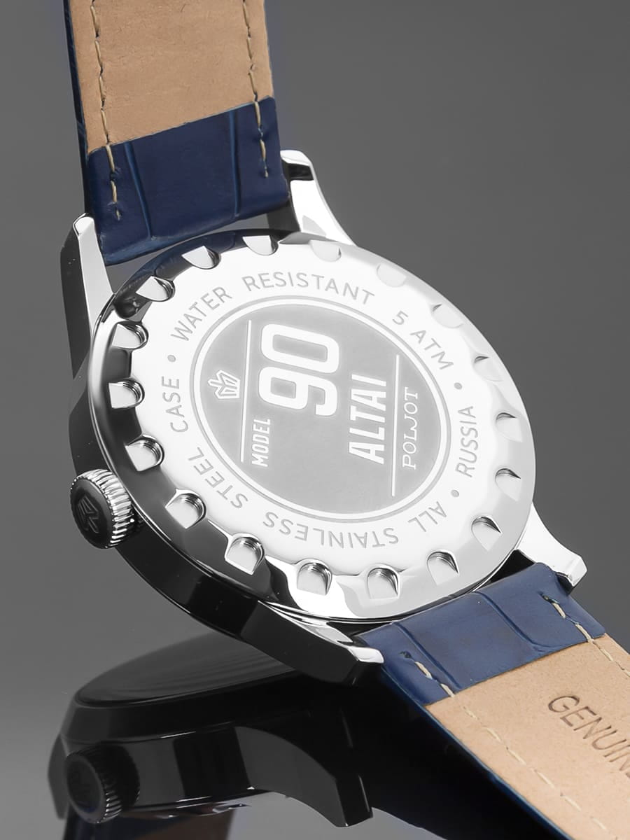 Poljot 8215.901220 — классические механические мужские часы с автоподзаводом, сочетающие сдержанный дизайн и надёжность российского часового производства. Корпус из нержавеющей стали подчёркивает строгость и универсальность модели, а циферблат с крупными арабскими цифрами и аккуратным окном даты на позиции «3 часов» обеспечивает превосходную читаемость. Стрелки и метки с люминесцентным покрытиемЛюминесцентное покрытиеПозволяет считывать показания времени в темноте. Производители наносят на стрелки, часовые индексы, безель или поверхность циферблата светонакопительный состав, дающий холодное свечение.. Механизм с автоподзаводом гарантирует стабильную работу и плавный ход стрелок. Прочное минеральное стеклоМинеральное стеклоМинеральное стекло представляет собой искусственно выращенный минерал кварца. Такое стекло отличается особой устойчивостью к повреждениям и царапинам. Уступает по некоторым качествам сапфировому стеклу. защищает циферблат от царапин, а ремешок из натуральной кожи глубокого синего цвета придаёт часам современное и элегантное звучание. Poljot — это воплощение надёжности, классики и уверенного стиля, созданное для мужчин, предпочитающих традиционную механику и безупречный внешний вид.