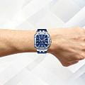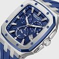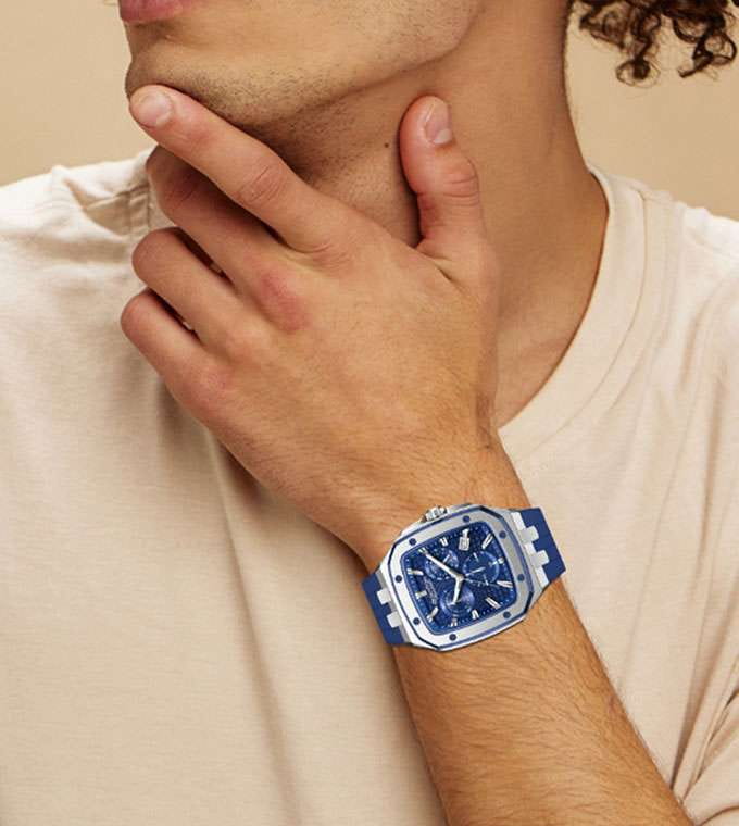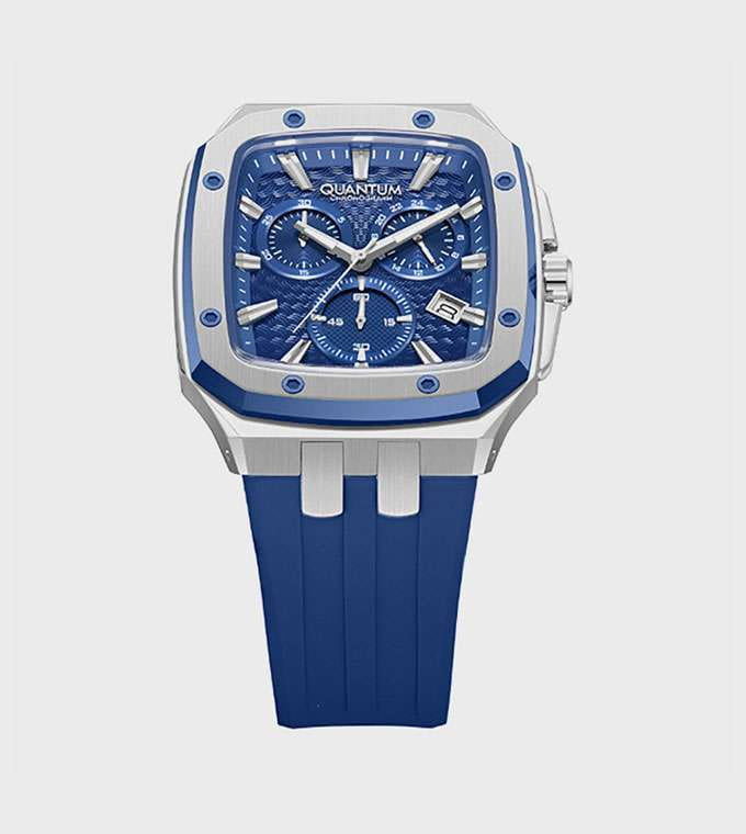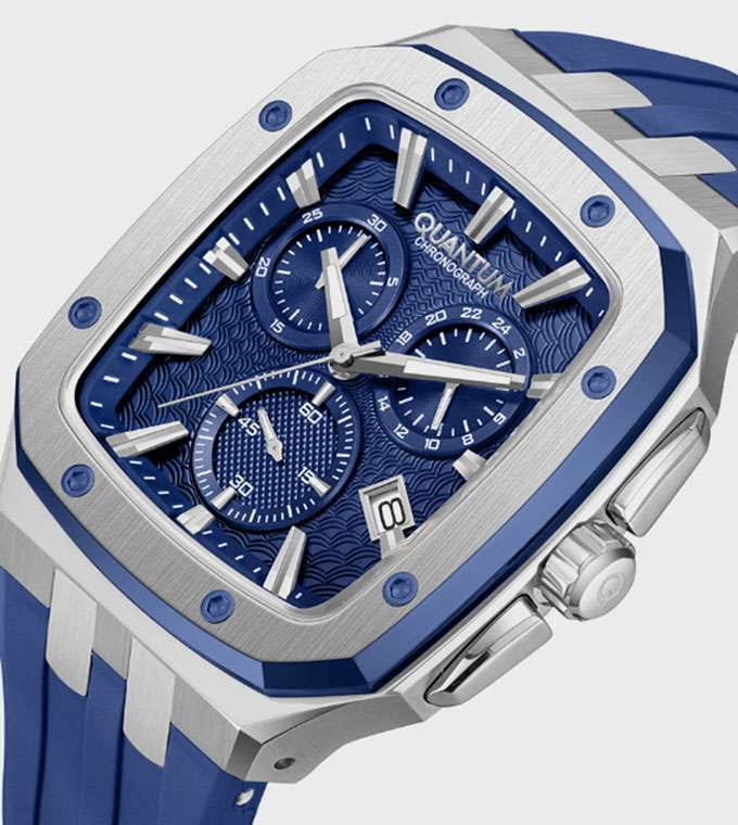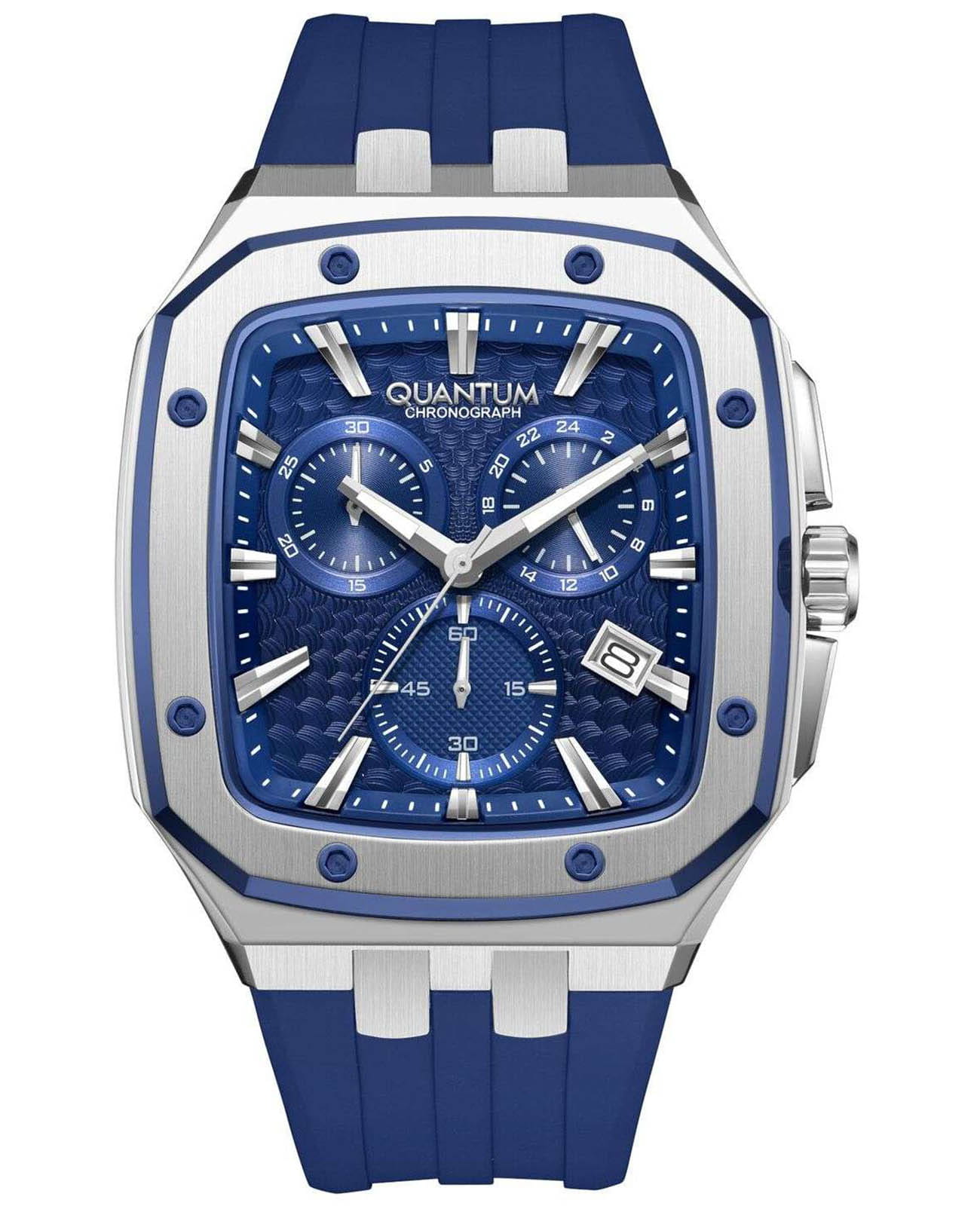 Мужские кварцевые часы Quantum из коллекции Hunter — крупные прямоугольные часы с ярким синим акцентом и функциональным хронографом. Корпус прямоугольный, из нержавеющей стали, размером 44 мм. БезельБезельВнешний ободок, закрепляющий стекло. В спортивных часах так называется поворотное кольцо с делениями на циферблате, выполняет роль таймера – замеряет отрезки времени на шкале. Неподвижный безель – элемент декора. Однонаправленно вращающийся безель на дайверских часах позволяет фиксировать моменты погружения и выныривания на поверхность. из нержавеющей стали с частичным PVD-покрытиемPVDУльтратонкое покрытие наносится в технике вакуумного напыления, сочетает в себе нитрид титана особой прочности со слоем золота или оксида хрома. Несёт в себе декоративную или защитную функцию.. Циферблат — синий с функциями хронографаХронографФункция позволяет измерять отрезки времени с особой точностью: часы, минуты, секунды. Верным признаком хронографа является наличие на циферблате 3 дополнительных окошек-счётчиков. и окошком даты. Стекло — минеральноеМинеральное стеклоМинеральное стекло представляет собой искусственно выращенный минерал кварца. Такое стекло отличается особой устойчивостью к повреждениям и царапинам. Уступает по некоторым качествам сапфировому стеклу. с антибликовым покрытием. Механизм — японский кварцевый Seiko. Водонепроницаемость 100 м. Ремешок — синий силиконовый на стандартной застёжке. Идеальный выбор для тех, кто ценит турецкий дизайн и спортивный стиль.