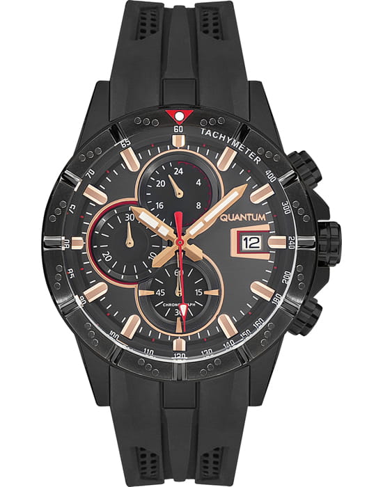 Мужские наручные часы-хронографХронографФункция позволяет измерять отрезки времени с особой точностью: часы, минуты, секунды. Верным признаком хронографа является наличие на циферблате 3 дополнительных окошек-счётчиков. Quantum HNG893.851, кварцевый механизм с высокой точностью. Минеральное стеклоМинеральное стеклоМинеральное стекло представляет собой искусственно выращенный минерал кварца. Такое стекло отличается особой устойчивостью к повреждениям и царапинам. Уступает по некоторым качествам сапфировому стеклу. устойчивое к появлению царапин, обладающее высокой прозрачностью. Класс водозащиты: 50 метров, позволит защитить корпус от случайных брызг или капель дождя. Стрелки с люминесцентным покрытиемЛюминесцентное покрытиеПозволяет считывать показания времени в темноте. Производители наносят на стрелки, часовые индексы, безель или поверхность циферблата светонакопительный состав, дающий холодное свечение.. Корпус часов изготовлен из стали с IP-покрытиемIP-покрытиеМетод ионного напыления. Демонстрирует повышенную устойчивость к истиранию, окислению и химическим веществам. Под воздействием высокого давления и температуры около 1500°C молекулы металла надёжно соединяются с частицами корпуса часов.. Каучуковый ремешок.