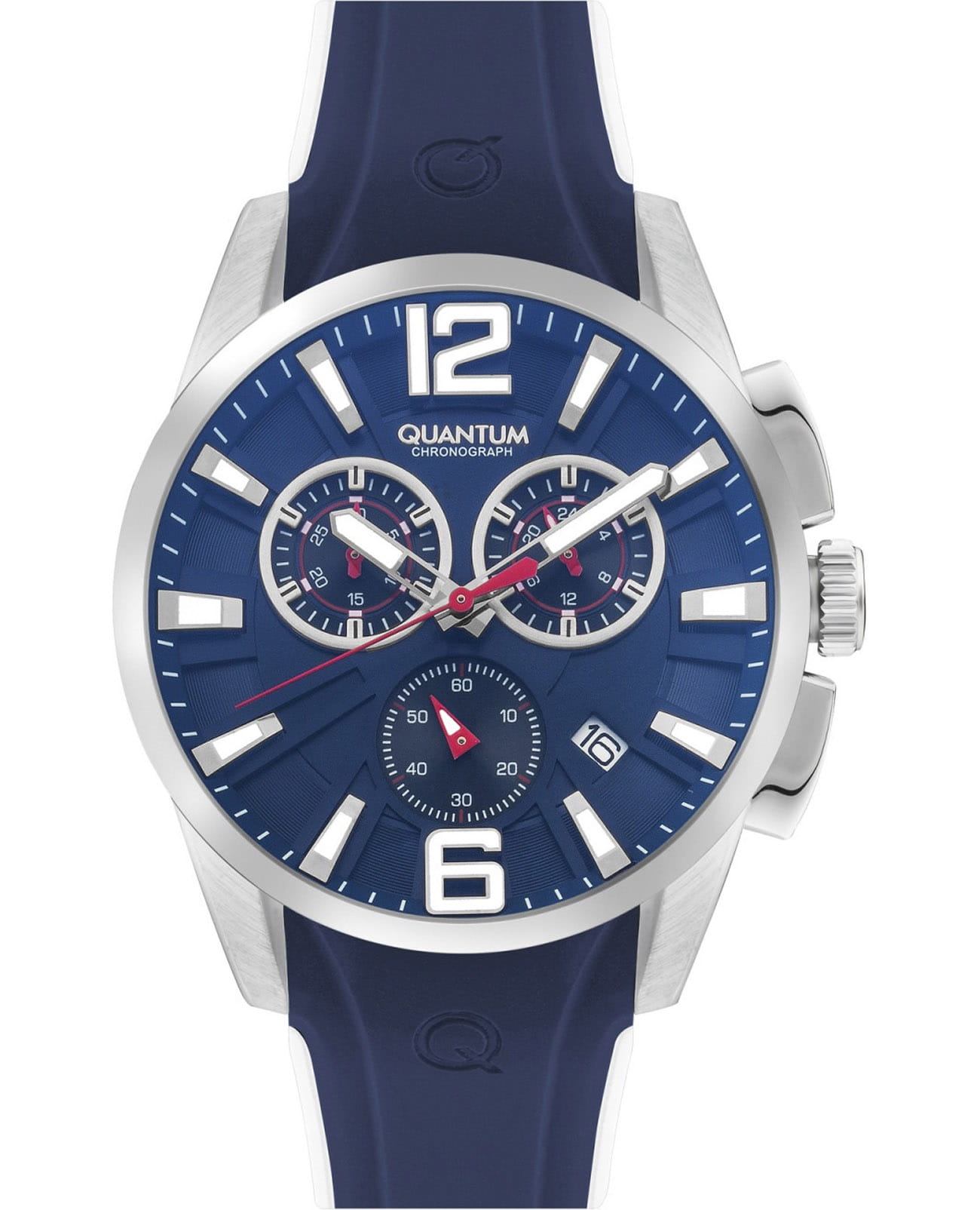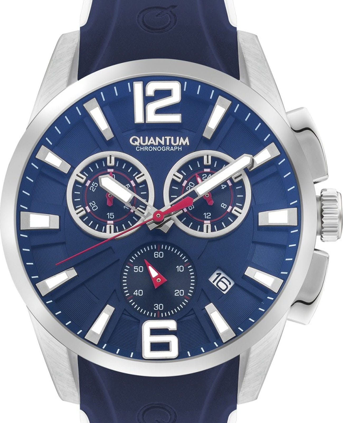 Мужские наручные часы-хронографХронографФункция позволяет измерять отрезки времени с особой точностью: часы, минуты, секунды. Верным признаком хронографа является наличие на циферблате 3 дополнительных окошек-счётчиков. Quantum PWG1076.399, кварцевый механизм с высокой точностью. Минеральное стеклоМинеральное стеклоМинеральное стекло представляет собой искусственно выращенный минерал кварца. Такое стекло отличается особой устойчивостью к повреждениям и царапинам. Уступает по некоторым качествам сапфировому стеклу. устойчивое к появлению царапин, обладающее высокой прозрачностью. Класс водозащиты: 100 метров, позволит плавать, нырять и заниматься другими водными видами спорта. Корпус часов изготовлен из нержавеющей стали. Стрелки и метки с люминесцентным покрытиемЛюминесцентное покрытиеПозволяет считывать показания времени в темноте. Производители наносят на стрелки, часовые индексы, безель или поверхность циферблата светонакопительный состав, дающий холодное свечение..Браслет из каучука на стандартной застежке.