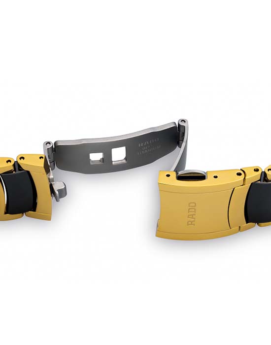 Круглый циферблат чёрного цвета выполнен в стиле минимализм. Он инкрустирован 4 бриллиантами весом в 0,011 карат, переливающиеся сияющие грани придают модели роскоши и великолепие. Оригинальный браслет из нержавеющей стали 316L имеет вставки из высокотехнологичной керамикиВысокотехнологичная керамикаИнновационный запатентованный Rado материал с гладкой или матовой поверхностью. Керамика за счёт кристаллической структуры обладает повышенной устойчивостью от возникновения царапин. Материал способен принимать температуру тела человека, обеспечивая невероятный комфорт при ношении.. Наручные часы оснащены кварцевым механизмом ETA 955.112 с высокой точностью хода. Надёжное стекло из сапфира. PVD-покрытиеPVDУльтратонкое покрытие наносится в технике вакуумного напыления, сочетает в себе нитрид титана особой прочности со слоем золота или оксида хрома. Несёт в себе декоративную или защитную функцию. золотистого цвета. Апертура даты. Диаметр корпуса: 38 мм.