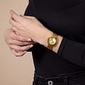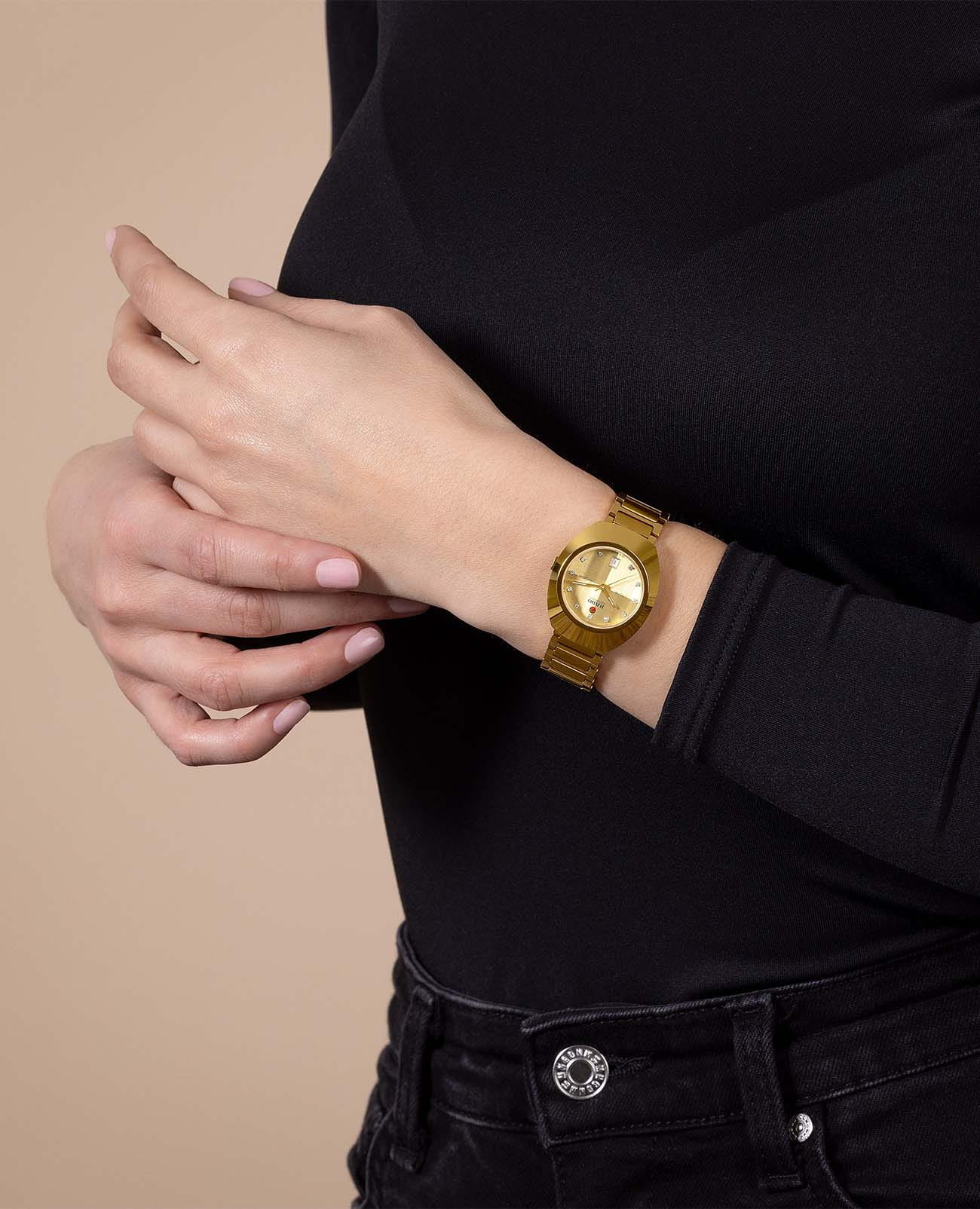 Женские механические часы с автоподзаводом Rado из коллекции Diastar Original — это икона швейцарского мастерства и инноваций. Корпус диаметром 30 мм и толщиной 11 мм выполнен из нержавеющей стали с PVD-покрытиемPVDУльтратонкое покрытие наносится в технике вакуумного напыления, сочетает в себе нитрид титана особой прочности со слоем золота или оксида хрома. Несёт в себе декоративную или защитную функцию. жёлтого золота. БезельБезельВнешний ободок, закрепляющий стекло. В спортивных часах так называется поворотное кольцо с делениями на циферблате, выполняет роль таймера – замеряет отрезки времени на шкале. Неподвижный безель – элемент декора. Однонаправленно вращающийся безель на дайверских часах позволяет фиксировать моменты погружения и выныривания на поверхность. изготовлен из Ceramos™CeramosМатериал являет собой инновационное сочетание высокотехнологичной керамики и сплава металла. Он объединяет керамическую устойчивость к царапинам и металлический роскошный блеск. с покрытием жёлтого золота. Циферблат жёлтого цвета с двунаправленной шлифовкой украшен 11 бриллиантами и центральным подвижным якорем — фирменным элементом дизайна. Циферблат защищён фасетированным сапфировым стекломСапфировое стеклоПрочный и надёжный материал из кристалла сапфира синтетического происхождения, характеризующийся особой твёрдостью и устойчивостью к царапинам и повреждениям. с антибликовым покрытиемАнтибликовое покрытиеСлой оксида металла в 0,13-0,3 микрон, благодаря которому стекло часов не бликует и не отражает свет. Антибликовое покрытие уменьшает отражение света в 10 раз, обеспечивая отличную читаемость показателей циферблата. на внутренней стороне. Стрелки золотистого цвета с люминесцентным покрытиемЛюминесцентное покрытиеПозволяет считывать показания времени в темноте. Производители наносят на стрелки, часовые индексы, безель или поверхность циферблата светонакопительный состав, дающий холодное свечение. Super-Luminova®, обеспечивающим отличную читаемость в любых условиях. Механизм — автоматический калибр R586 с пружиной Nivachron™Nivachron™Специально разработанный инновационный сплав Nivachron™ повышает устойчивость часов к воздействию магнитных полей., отрегулированный в пяти положениях, с запасом хода 48 часов. Окошко даты расположено в положении 6 часов. Часы оснащены стальным браслетом с PVD-покрытиемPVDУльтратонкое покрытие наносится в технике вакуумного напыления, сочетает в себе нитрид титана особой прочности со слоем золота или оксида хрома. Несёт в себе декоративную или защитную функцию. жёлтого золота и застёжкой «бабочка» с кнопкамиЗастёжка "бабочка"Такой вид застёжки дополняется предохранителями, помогающими избежать случайного раскрытия браслета. Обладают изящным исполнением. из стали с PVD-покрытиемPVDУльтратонкое покрытие наносится в технике вакуумного напыления, сочетает в себе нитрид титана особой прочности со слоем золота или оксида хрома. Несёт в себе декоративную или защитную функцию.. Водонепроницаемость 100 м позволяет использовать часы для плавания. Идеальный выбор для тех, кто ценит роскошь, точность и смелый дизайн.
