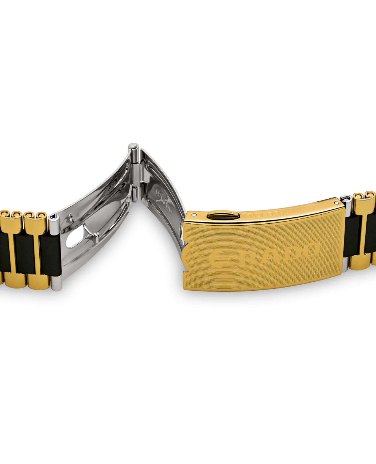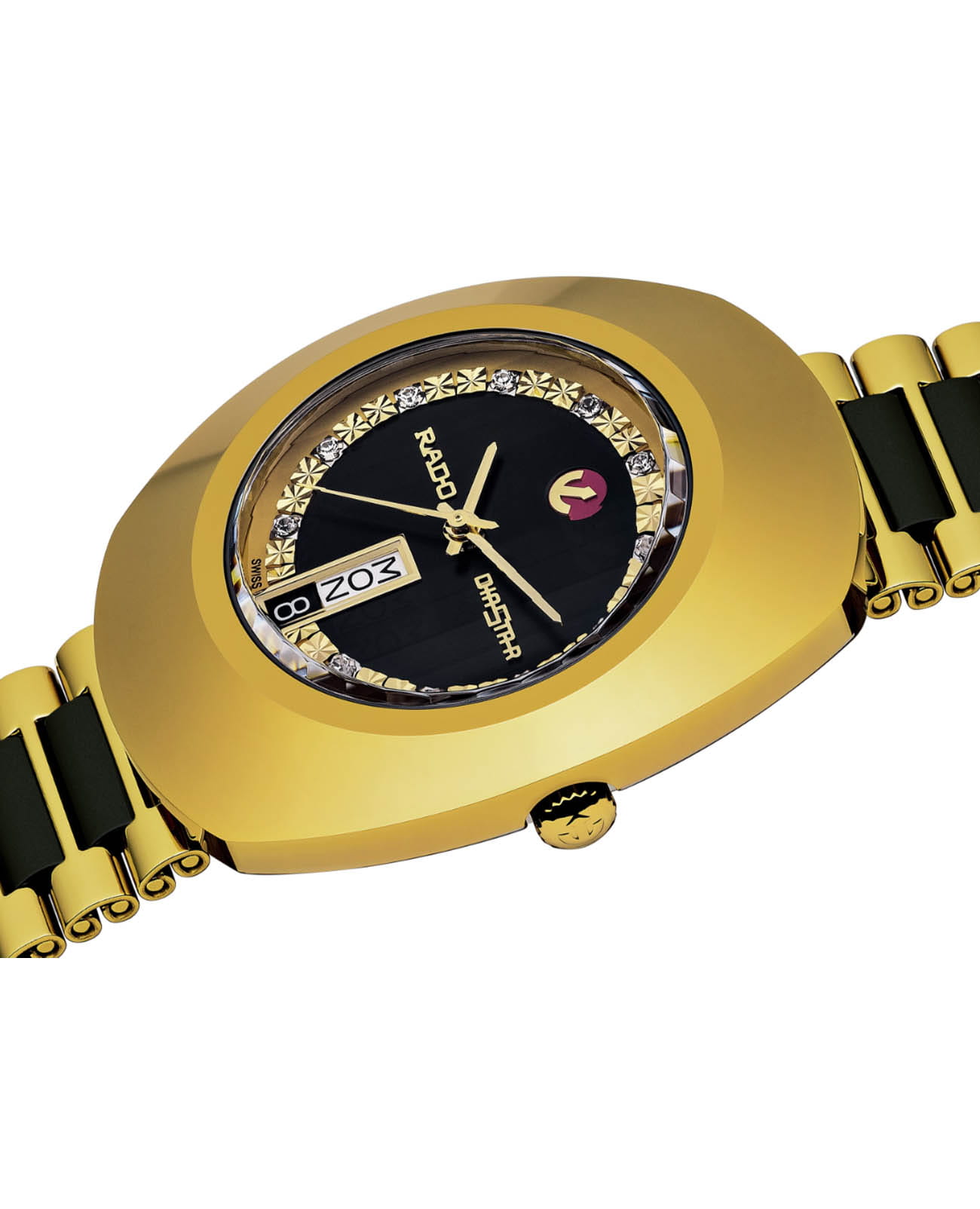 Мужские часы Rado The Original Automatic R12413584 с надёжным автоматическим механизмом. Корпус и браслет часов выполнены из нержавеющей стали c PVD-покрытиемPVDУльтратонкое покрытие наносится в технике вакуумного напыления, сочетает в себе нитрид титана особой прочности со слоем золота или оксида хрома. Несёт в себе декоративную или защитную функцию.. Стальной браслет на раскладной застёжкеРаскладная застёжкаТакой тип застёжки используется только на браслетах из металла. Она никогда не раскрывается полностью, происходит разделение на 2 и более частей. Раскладывающая застёжка снизит вероятность потери часов к минимуму.. Класс водозащиты: 30 метров, позволит защитить корпус от случайных брызг или капель дождя. Циферблат инкрустирован сапфирами. Окошко даты и дня недели находится в положении 6 часов.