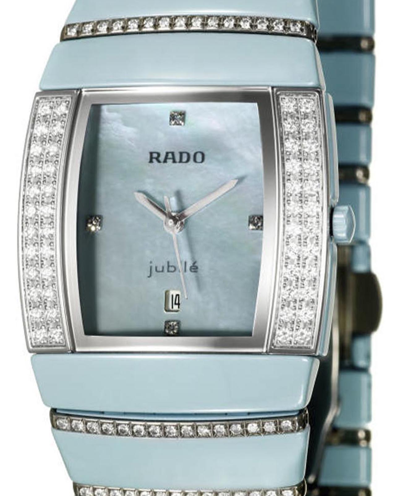 Часы Rado Sintra R13666919, произведение искусства и технологическое чудо, станут прекрасным дополнением к коллекции. Эти швейцарские часы оснащены кварцевым механизмом с указателем даты и тремя стрелками, заключенным в корпус из нержавеющей стали. Браслет с раскладной застёжкойРаскладная застёжкаТакой тип застёжки используется только на браслетах из металла. Она никогда не раскрывается полностью, происходит разделение на 2 и более частей. Раскладывающая застёжка снизит вероятность потери часов к минимуму.. изготовлен из высокотехнологичной керамикиВысокотехнологичная керамикаИнновационный запатентованный Rado материал с гладкой или матовой поверхностью. Керамика за счёт кристаллической структуры обладает повышенной устойчивостью от возникновения царапин. Материал способен принимать температуру тела человека, обеспечивая невероятный комфорт при ношении.. Корпус украшен 48 бриллиантами, циферблат 4 бриллианта, браслет 102 бриллианта. Сапфировое стеклоСапфировое стеклоПрочный и надёжный материал из кристалла сапфира синтетического происхождения, характеризующийся особой твёрдостью и устойчивостью к царапинам и повреждениям. устойчивое к появлению царапин, обладающее высокой прозрачностью. Класс водозащиты: 30 метров, позволит защитить корпус от случайных брызг или капель дождя.