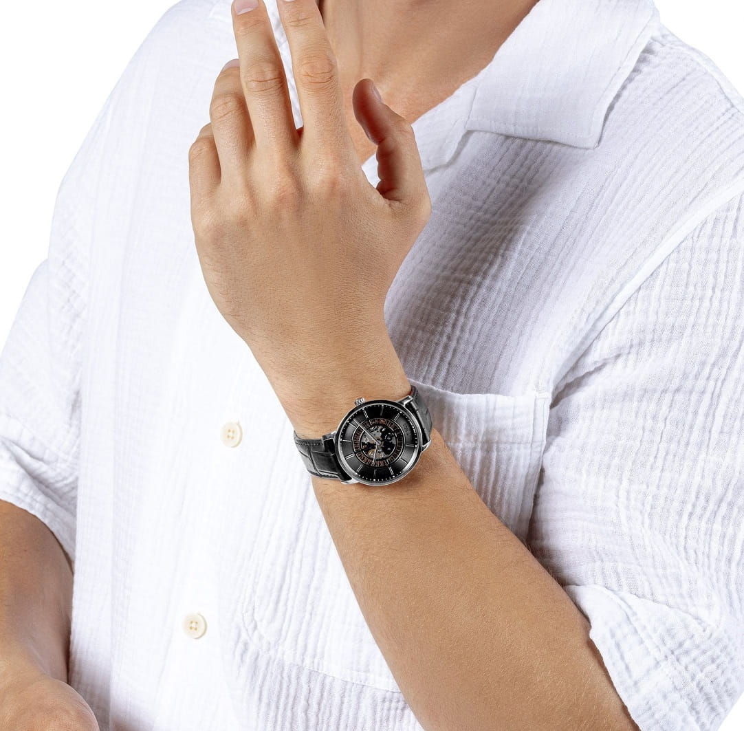 Несмотря на общее классическое исполнение, наручные часы выглядят ярко и эффектно, лучше всего гармонируя с брендовыми деловыми костюмами. Скелетонизированный циферблат выполнен с метками в виде штрихов, украшенных черным шпоном. Оригинальное окошко даты в положении 6 часа. Корпус выполнен из керамики и металла. Ремешок из натуральной кожи. Сапфировое стеклоСапфировое стеклоПрочный и надёжный материал из кристалла сапфира синтетического происхождения, характеризующийся особой твёрдостью и устойчивостью к царапинам и повреждениям. с покрытием «антиблик». Кожаный ремешок с раскладной застёжкойРаскладная застёжкаТакой тип застёжки используется только на браслетах из металла. Она никогда не раскрывается полностью, происходит разделение на 2 и более частей. Раскладывающая застёжка снизит вероятность потери часов к минимуму.. Прозрачная задняя крышка открывает обзор на слаженную работу механизма. Диаметр корпуса: 40,7 мм.