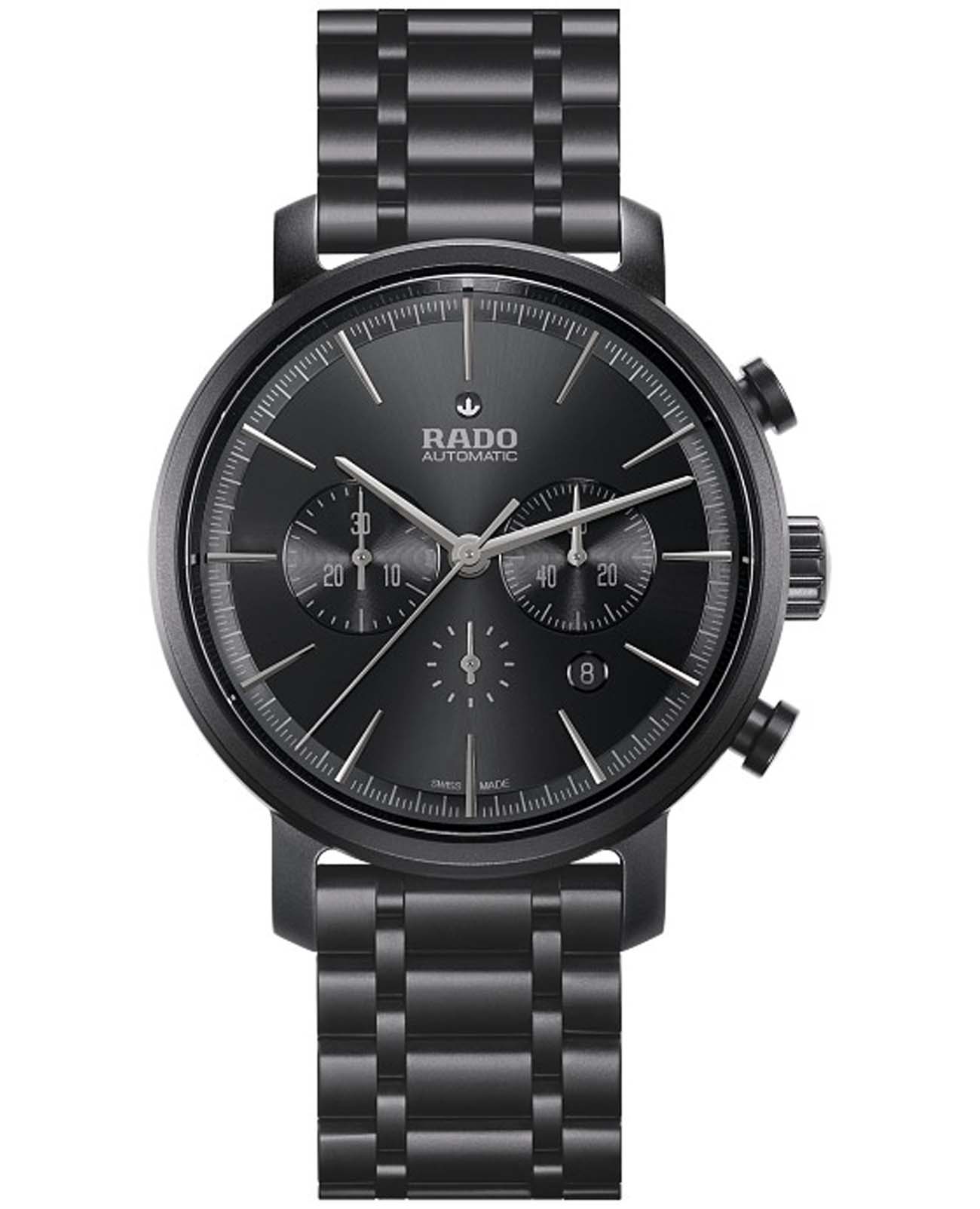 Мужские швейцарские часы-хронографХронографФункция позволяет измерять отрезки времени с особой точностью: часы, минуты, секунды. Верным признаком хронографа является наличие на циферблате 3 дополнительных окошек-счётчиков. Rado HyperChrome Automatic Chronograph R14090192. Корпус часов изготовлен из высокотехнологичной керамикиВысокотехнологичная керамикаИнновационный запатентованный Rado материал с гладкой или матовой поверхностью. Керамика за счёт кристаллической структуры обладает повышенной устойчивостью от возникновения царапин. Материал способен принимать температуру тела человека, обеспечивая невероятный комфорт при ношении.. Сапфировое стеклоСапфировое стеклоПрочный и надёжный материал из кристалла сапфира синтетического происхождения, характеризующийся особой твёрдостью и устойчивостью к царапинам и повреждениям. устойчивое к мелким механическим повреждениям. Окошко даты находится в положении между 4 и 5 часов. Класс водозащиты: 100 метров, позволит плавать, нырять и заниматься другими водными видами спорта. Браслет из высокотехнологичной керамикиВысокотехнологичная керамикаИнновационный запатентованный Rado материал с гладкой или матовой поверхностью. Керамика за счёт кристаллической структуры обладает повышенной устойчивостью от возникновения царапин. Материал способен принимать температуру тела человека, обеспечивая невероятный комфорт при ношении. на раскладной застёжкеРаскладная застёжкаТакой тип застёжки используется только на браслетах из металла. Она никогда не раскрывается полностью, происходит разделение на 2 и более частей. Раскладывающая застёжка снизит вероятность потери часов к минимуму..