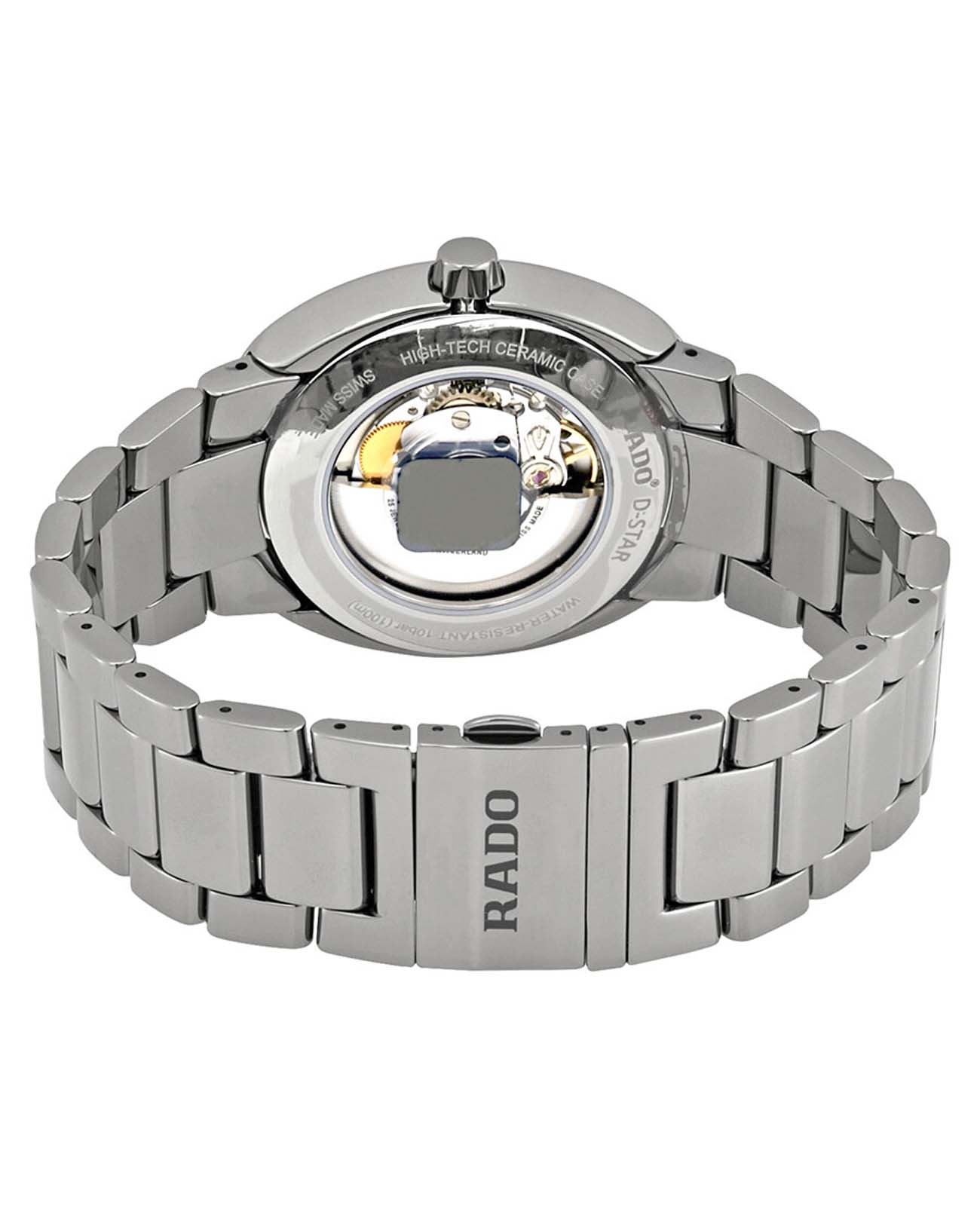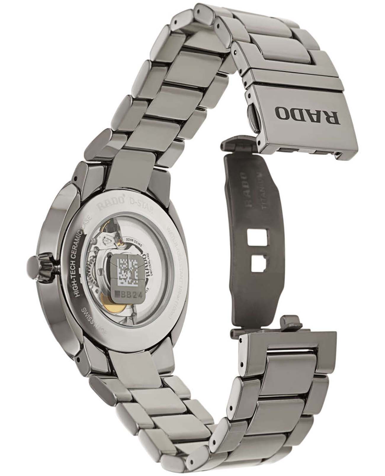 Мужские механические швейцарские часы Rado D-Star R15760102. Сапфировое стеклоСапфировое стеклоПрочный и надёжный материал из кристалла сапфира синтетического происхождения, характеризующийся особой твёрдостью и устойчивостью к царапинам и повреждениям. устойчивое к мелким механическим повреждениям. Корпус часов изготовлен из высокотехнологичной керамикиВысокотехнологичная керамикаИнновационный запатентованный Rado материал с гладкой или матовой поверхностью. Керамика за счёт кристаллической структуры обладает повышенной устойчивостью от возникновения царапин. Материал способен принимать температуру тела человека, обеспечивая невероятный комфорт при ношении.. Окошко даты находится в положении 6 часов.  Класс водозащиты: 100 метров, позволит плавать, нырять и заниматься другими водными видами спорта. Браслет из высокотехнологичной керамикиВысокотехнологичная керамикаИнновационный запатентованный Rado материал с гладкой или матовой поверхностью. Керамика за счёт кристаллической структуры обладает повышенной устойчивостью от возникновения царапин. Материал способен принимать температуру тела человека, обеспечивая невероятный комфорт при ношении.  на раскладной застёжкеРаскладная застёжкаТакой тип застёжки используется только на браслетах из металла. Она никогда не раскрывается полностью, происходит разделение на 2 и более частей. Раскладывающая застёжка снизит вероятность потери часов к минимуму..