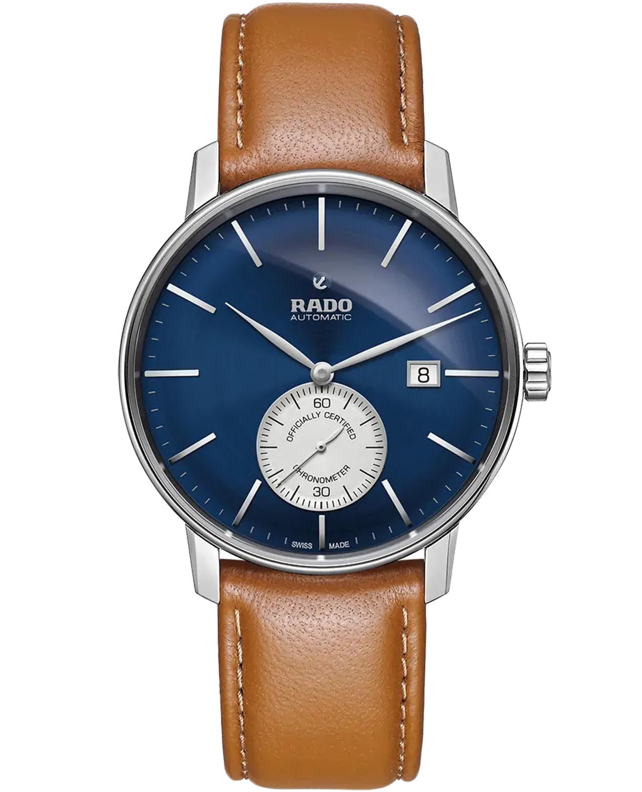 Мужские швейцарские механические часы-хронометр с автоподзаводом Rado Coupole R22880205. Корпус часов изготовлен из нержавеющей стали. Сапфировое стеклоСапфировое стеклоПрочный и надёжный материал из кристалла сапфира синтетического происхождения, характеризующийся особой твёрдостью и устойчивостью к царапинам и повреждениям. устойчивое к мелким механическим повреждениям. Кожаный ремешок с раскладной застёжкойРаскладная застёжкаТакой тип застёжки используется только на браслетах из металла. Она никогда не раскрывается полностью, происходит разделение на 2 и более частей. Раскладывающая застёжка снизит вероятность потери часов к минимуму.. Класс водозащиты: 50 метров, позволит защитить корпус от случайных брызг или капель дождя. Окошко даты находится в положении 3 часа. Часы имеют сертификат COSCСертификат COSCОфициальный сертификат, подтверждающий то, что часы ходят с особо высокой точностью. Для получения документа часы подвергаются тестовым испытаниям, разработанным швейцарским институтом тестирования хронометров COSC. Допустимая норма для механических часов -4/+6 секунд в день, для кварцевых моделей +/- 0,07 секунд в день..