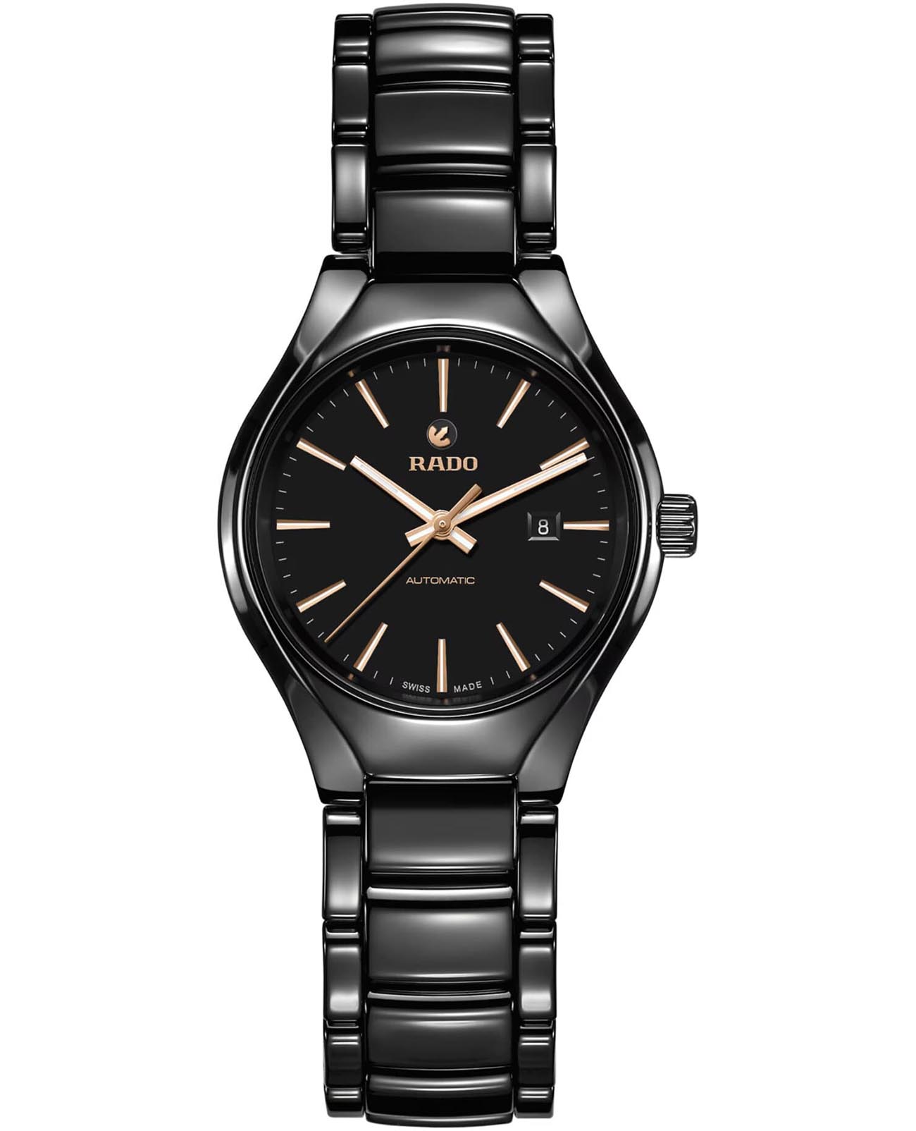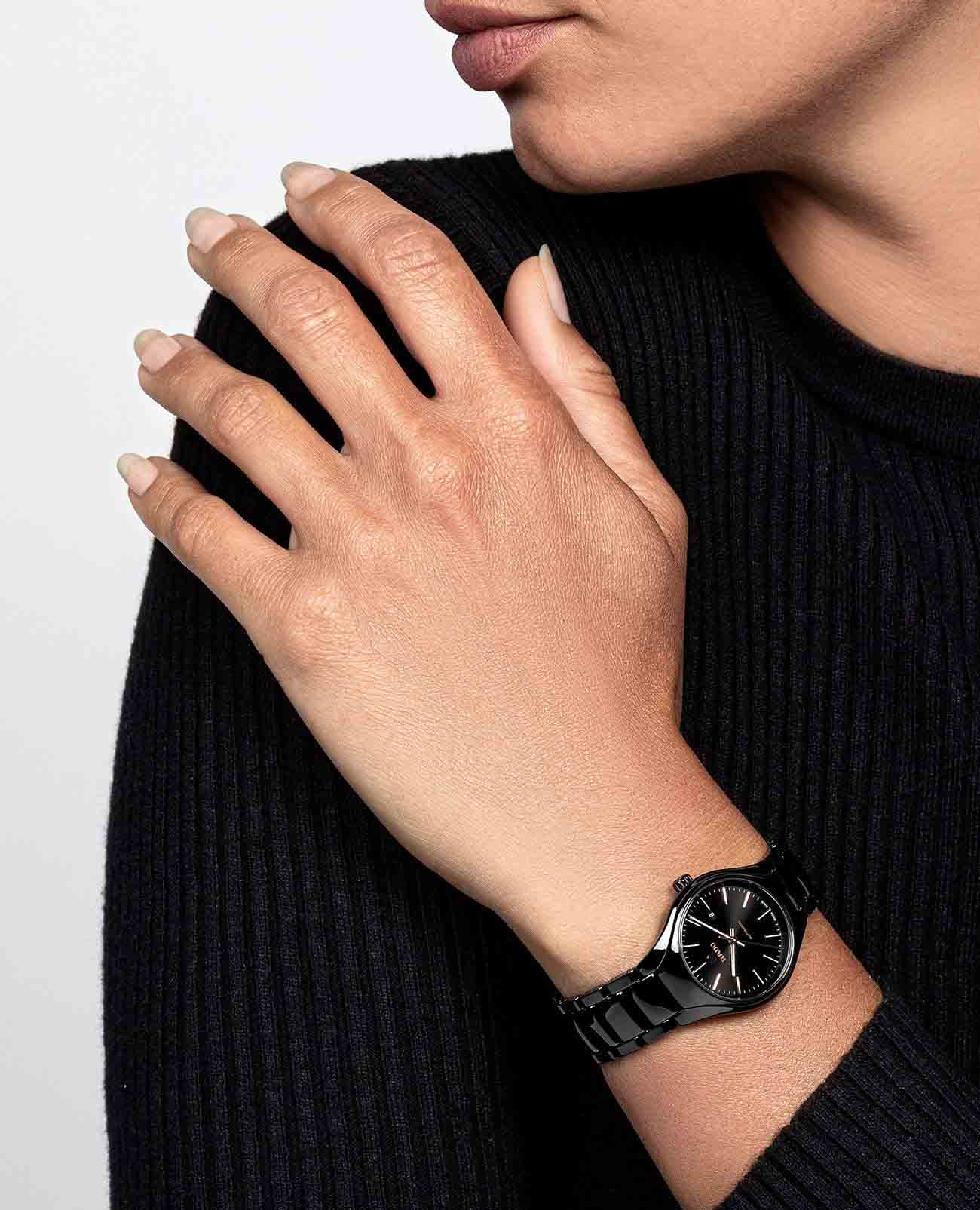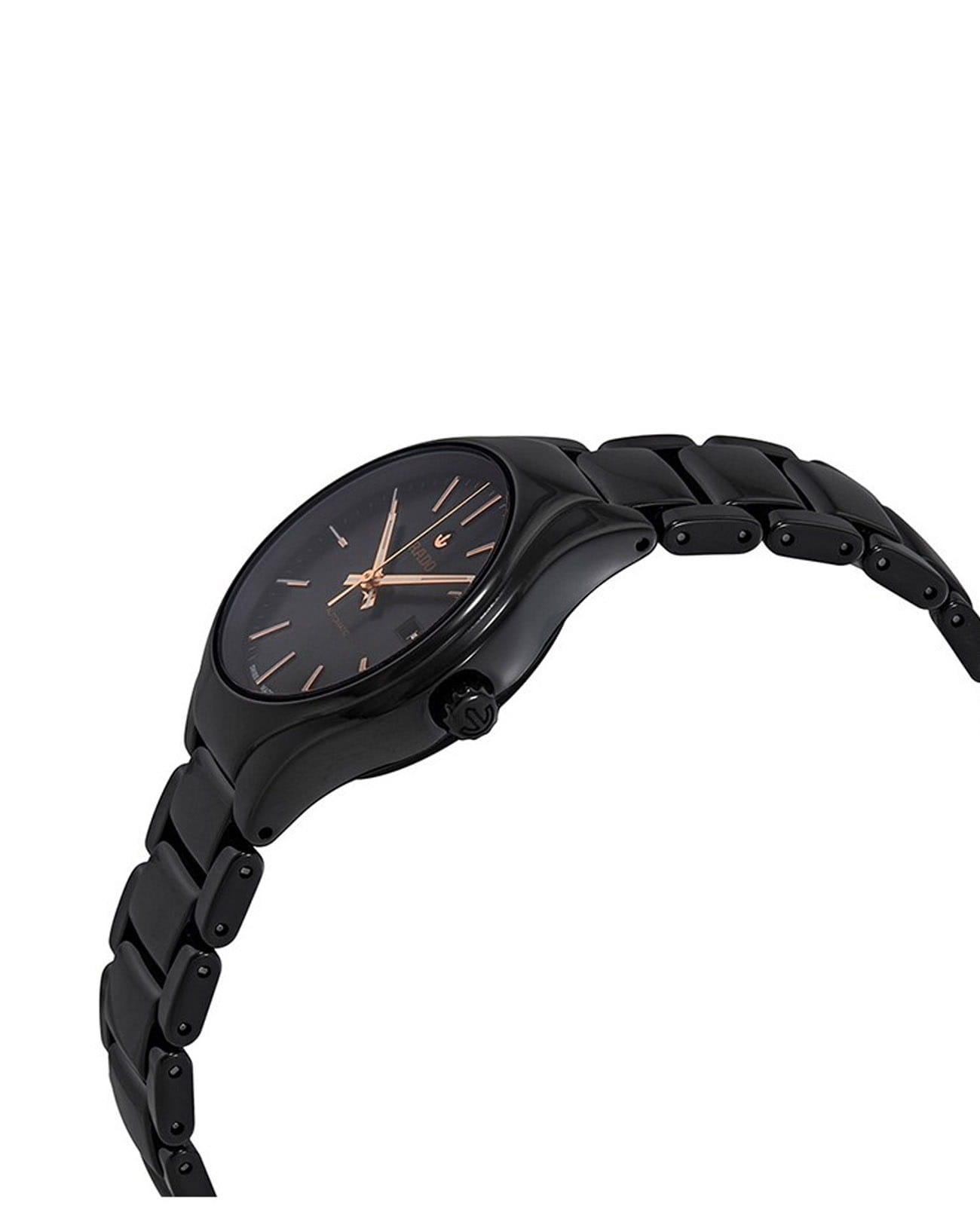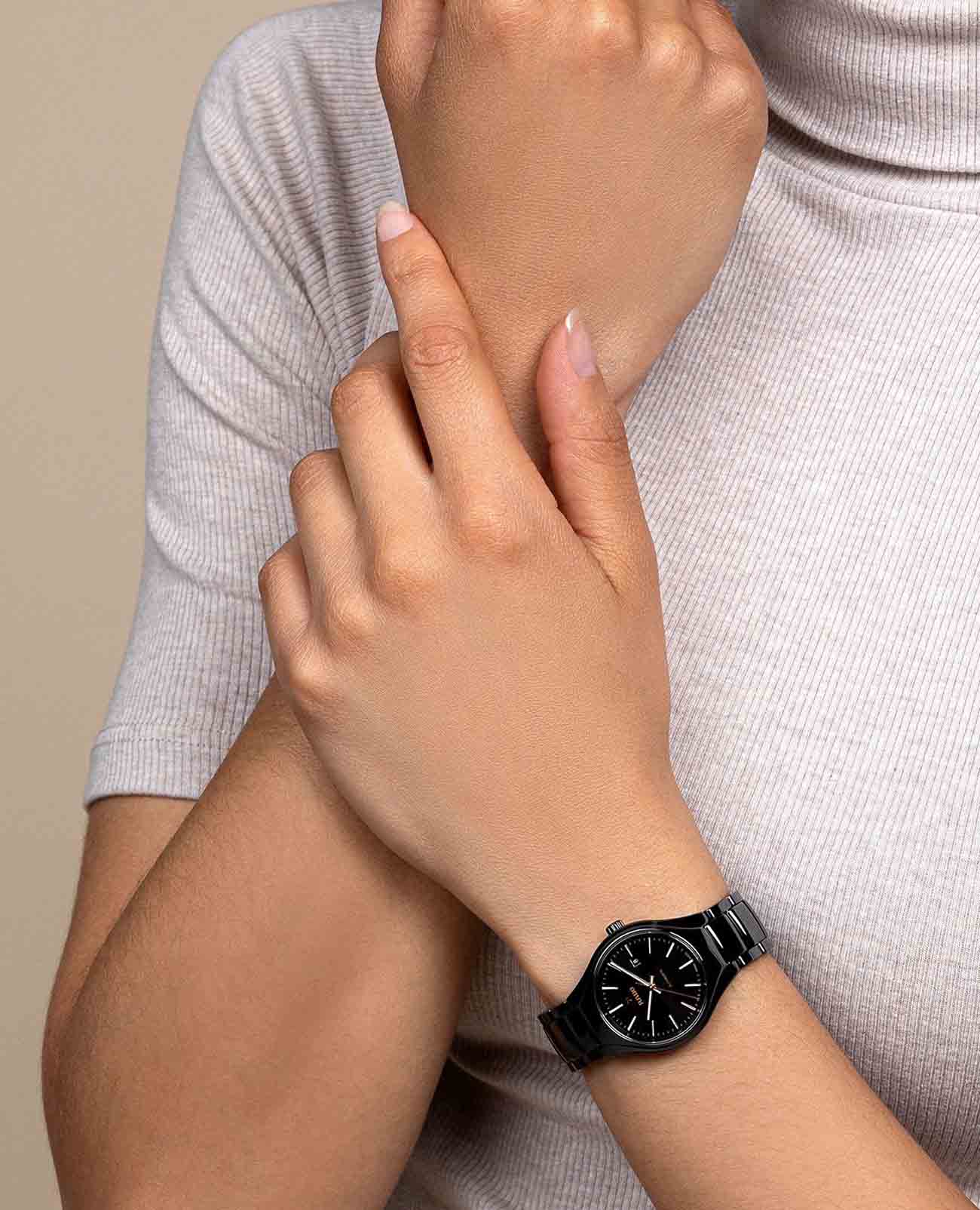 Женские механические швейцарские часы с автоподзаводом Rado True R27242162. Сапфировое стеклоСапфировое стеклоПрочный и надёжный материал из кристалла сапфира синтетического происхождения, характеризующийся особой твёрдостью и устойчивостью к царапинам и повреждениям. устойчивое к появлению царапин, обладающее высокой прозрачностью. Корпус часов из титана с PVD-покрытиемPVDУльтратонкое покрытие наносится в технике вакуумного напыления, сочетает в себе нитрид титана особой прочности со слоем золота или оксида хрома. Несёт в себе декоративную или защитную функцию. и высокотехнологичной керамикиВысокотехнологичная керамикаИнновационный запатентованный Rado материал с гладкой или матовой поверхностью. Керамика за счёт кристаллической структуры обладает повышенной устойчивостью от возникновения царапин. Материал способен принимать температуру тела человека, обеспечивая невероятный комфорт при ношении.. Окошко даты находится в положении 3 часа. Стрелки с люминесцентным покрытиемЛюминесцентное покрытиеПозволяет считывать показания времени в темноте. Производители наносят на стрелки, часовые индексы, безель или поверхность циферблата светонакопительный состав, дающий холодное свечение.. Класс водозащиты: 50 метров, позволит защитить корпус от случайных брызг или капель дождя. Браслет из титана и высокотехнологичной плазменной керамикиВысокотехнологичная плазменная керамикаИнновационный материал, технология запатентована. Выплавление керамики осуществляется в печи при 20 000 °C, белоснежный материал под воздействием ультравысокой температуры приобретает уникальный блеск, присущий металлам. на застёжке «бабочка» с кнопкамиЗастёжка "бабочка"Такой вид застёжки дополняется предохранителями, помогающими избежать случайного раскрытия браслета. Обладают изящным исполнением. .