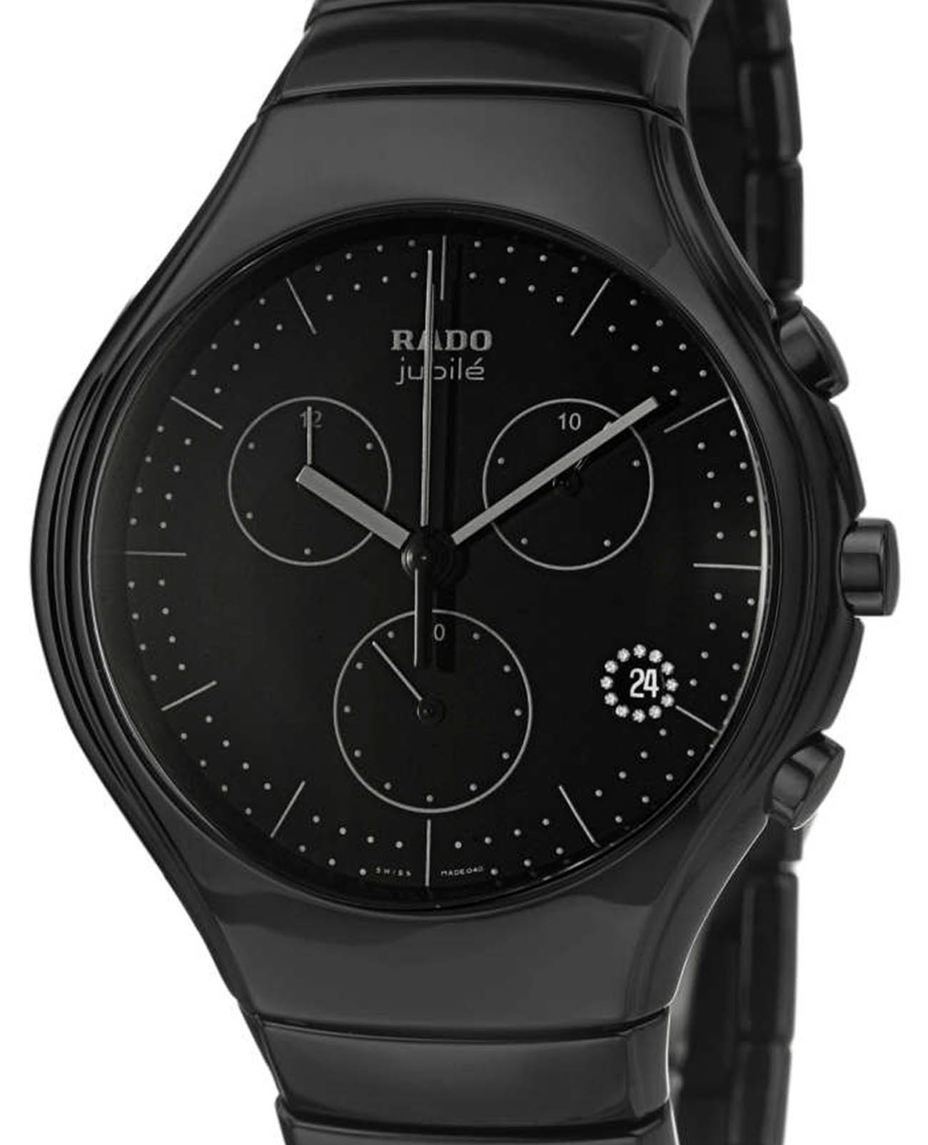 Мужские швейцарские часы-хронографХронографФункция позволяет измерять отрезки времени с особой точностью: часы, минуты, секунды. Верным признаком хронографа является наличие на циферблате 3 дополнительных окошек-счётчиков. Rado True R27814402. Сапфировое стеклоСапфировое стеклоПрочный и надёжный материал из кристалла сапфира синтетического происхождения, характеризующийся особой твёрдостью и устойчивостью к царапинам и повреждениям. устойчивое к мелким механическим повреждениям. Корпус часов изготовлен из высокотехнологичной керамикиВысокотехнологичная керамикаИнновационный запатентованный Rado материал с гладкой или матовой поверхностью. Керамика за счёт кристаллической структуры обладает повышенной устойчивостью от возникновения царапин. Материал способен принимать температуру тела человека, обеспечивая невероятный комфорт при ношении.. Класс водозащиты: 30 метров, позволит защитить корпус от случайных брызг или капель дождя. Браслет из высокотехнологичной керамикиВысокотехнологичная керамикаИнновационный запатентованный Rado материал с гладкой или матовой поверхностью. Керамика за счёт кристаллической структуры обладает повышенной устойчивостью от возникновения царапин. Материал способен принимать температуру тела человека, обеспечивая невероятный комфорт при ношении. на застёжке-бабочке с кнопкамиЗастёжка "бабочка"Такой вид застёжки дополняется предохранителями, помогающими избежать случайного раскрытия браслета. Обладают изящным исполнением. .