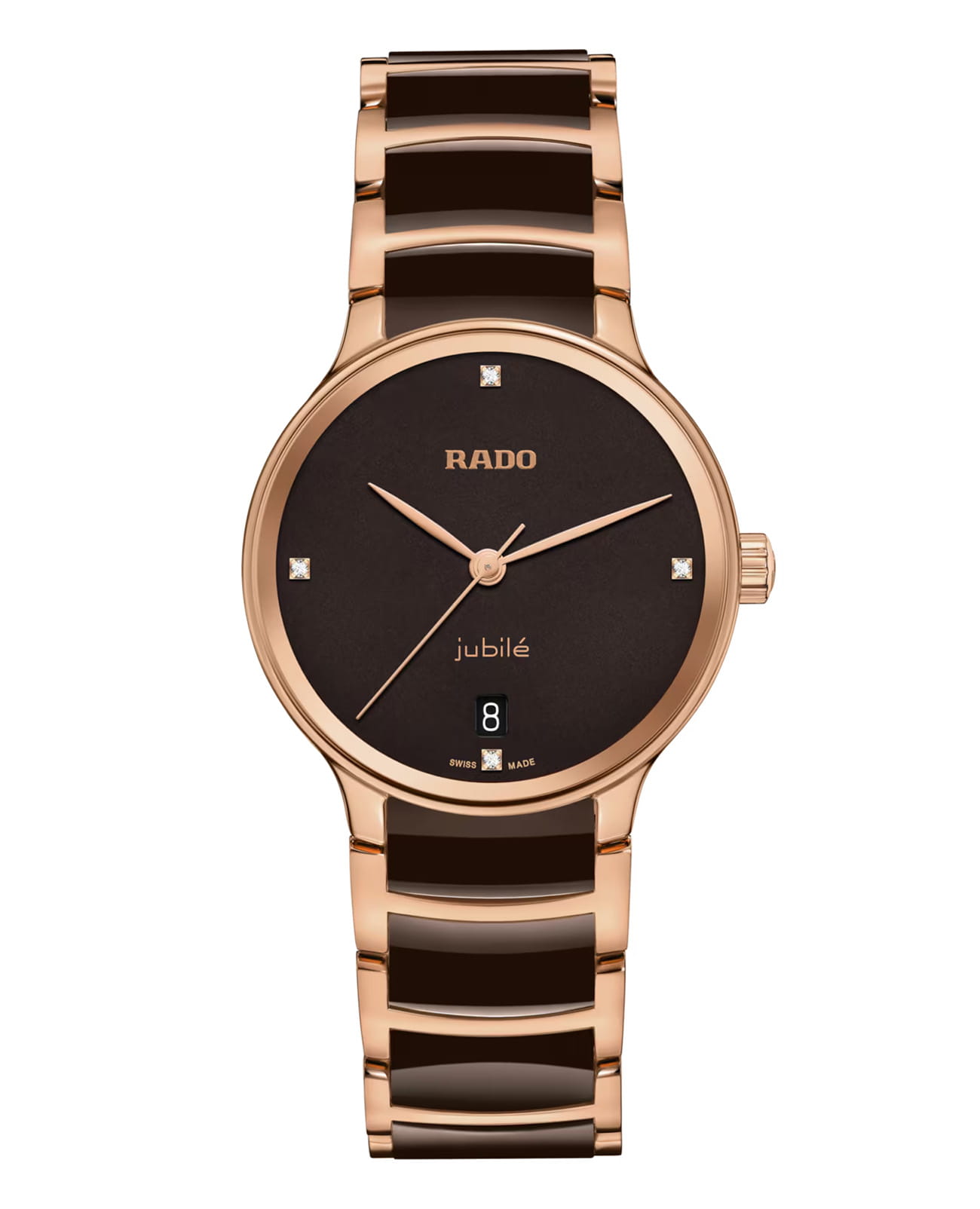 Женские кварцевые часы Rado из коллекции Centrix — это элегантный аксессуар, сочетающий швейцарское качество и современный дизайн. Корпус диаметром 35 мм и толщиной 9,5 мм выполнен из нержавеющей стали 316L с PVD-покрытиемPVDУльтратонкое покрытие наносится в технике вакуумного напыления, сочетает в себе нитрид титана особой прочности со слоем золота или оксида хрома. Несёт в себе декоративную или защитную функцию.. Циферблат коричневого цвета украшен 4 бриллиантами и логотипом «jubilé». Циферблат защищён выпуклым сапфировым стекломСапфировое стеклоПрочный и надёжный материал из кристалла сапфира синтетического происхождения, характеризующийся особой твёрдостью и устойчивостью к царапинам и повреждениям. с антибликовым покрытиемАнтибликовое покрытиеСлой оксида металла в 0,13-0,3 микрон, благодаря которому стекло часов не бликует и не отражает свет. Антибликовое покрытие уменьшает отражение света в 10 раз, обеспечивая отличную читаемость показателей циферблата.. Механизм — кварцевый калибр R073 с технологиями PreciDrive и HeavyDrive, обеспечивающими высокую точность и устойчивость к ударам. Часы оснащены комбинированным браслетом: из полированной нержавеющей стали с PVD-покрытиемPVDУльтратонкое покрытие наносится в технике вакуумного напыления, сочетает в себе нитрид титана особой прочности со слоем золота или оксида хрома. Несёт в себе декоративную или защитную функцию. и вставками из высокотехнологичной керамикиВысокотехнологичная керамикаИнновационный запатентованный Rado материал с гладкой или матовой поверхностью. Керамика за счёт кристаллической структуры обладает повышенной устойчивостью от возникновения царапин. Материал способен принимать температуру тела человека, обеспечивая невероятный комфорт при ношении.. Браслет на застёжке «бабочка» с кнопкамиЗастёжка "бабочка"Такой вид застёжки дополняется предохранителями, помогающими избежать случайного раскрытия браслета. Обладают изящным исполнением. . Водонепроницаемость 50 м позволяет использовать часы в повседневных условиях. Гарантия — 5 лет. Идеальный выбор для тех, кто ценит стиль, точность и долговечность.