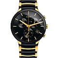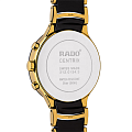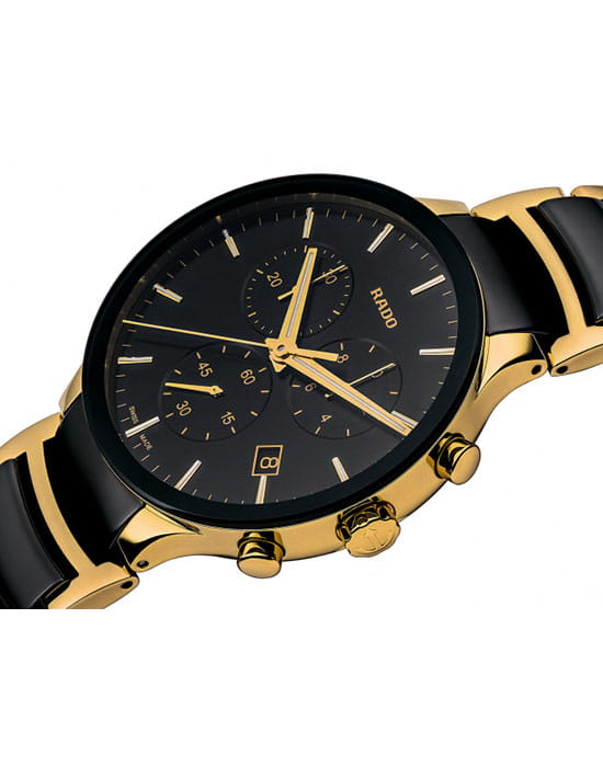 Премиальный хронографХронографФункция позволяет измерять отрезки времени с особой точностью: часы, минуты, секунды. Верным признаком хронографа является наличие на циферблате 3 дополнительных окошек-счётчиков. отличается лаконичным оформлением и использованием сдержанных оттенков. Такое исполнение позволяет носить часы с деловым, повседневным образом, костюмом на торжественный случай. Внутри надёжного корпуса из высокотехнологичной керамикиВысокотехнологичная керамикаИнновационный запатентованный Rado материал с гладкой или матовой поверхностью. Керамика за счёт кристаллической структуры обладает повышенной устойчивостью от возникновения царапин. Материал способен принимать температуру тела человека, обеспечивая невероятный комфорт при ношении. находится кварцевый механизм ETA 251.274 с 22 камнями. Браслет из нержавеющей стали 316L с керамическими вставками и золотистым PVD-покрытиемPVDУльтратонкое покрытие наносится в технике вакуумного напыления, сочетает в себе нитрид титана особой прочности со слоем золота или оксида хрома. Несёт в себе декоративную или защитную функцию.. Сапфировое стекло. Люминесцентная подсветкаЛюминесцентное покрытиеПозволяет считывать показания времени в темноте. Производители наносят на стрелки, часовые индексы, безель или поверхность циферблата светонакопительный состав, дающий холодное свечение.. Апертура даты. Диаметр корпуса: 40 мм.