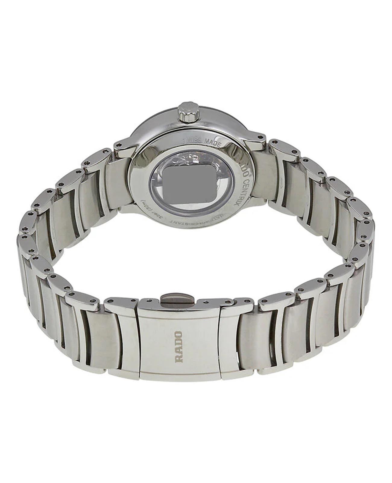 Швейцарские женские механические часы с автоподзаводом Rado Centrix R30940163. Корпус часов изготовлен из нержавеющей стали. Сапфировое стеклоСапфировое стеклоПрочный и надёжный материал из кристалла сапфира синтетического происхождения, характеризующийся особой твёрдостью и устойчивостью к царапинам и повреждениям. устойчивое к мелким механическим повреждениям. Окошко даты находится в положении 3 часа. Стрелки с люминесцентным покрытиемЛюминесцентное покрытиеПозволяет считывать показания времени в темноте. Производители наносят на стрелки, часовые индексы, безель или поверхность циферблата светонакопительный состав, дающий холодное свечение.. Класс водозащиты: 30 метров, позволит защитить корпус от случайных брызг или капель дождя. Браслет нержавеющей стали на раскладной застёжкеРаскладная застёжкаТакой тип застёжки используется только на браслетах из металла. Она никогда не раскрывается полностью, происходит разделение на 2 и более частей. Раскладывающая застёжка снизит вероятность потери часов к минимуму..