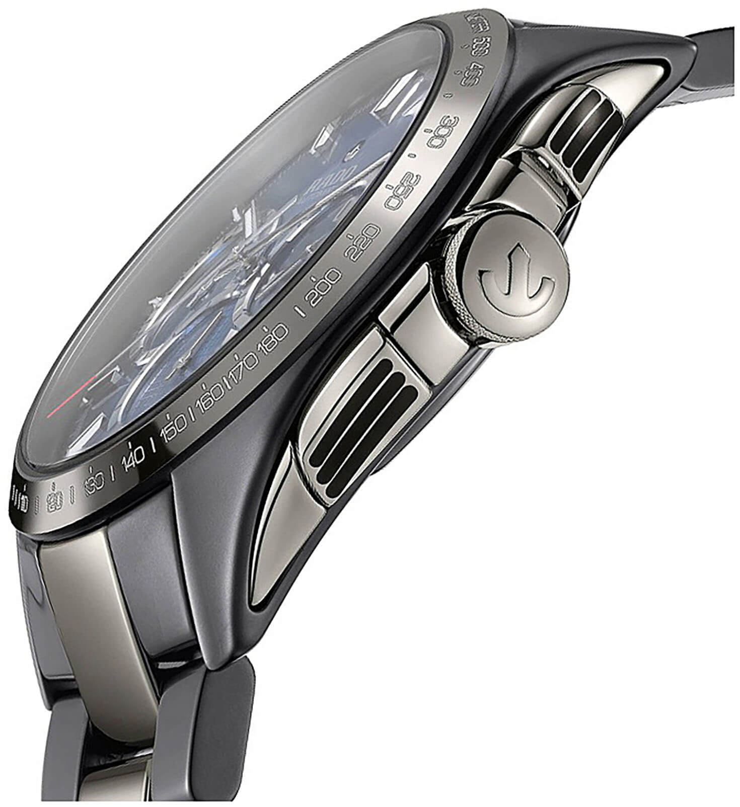 Наручные часы с синим циферблата дополнены счётчиками хронографаХронографФункция позволяет измерять отрезки времени с особой точностью: часы, минуты, секунды. Верным признаком хронографа является наличие на циферблате 3 дополнительных окошек-счётчиков. в контрастном исполнении, секундная стрелка имеет красный наконечник. Корпус модели сделан из революционной плазменной керамикиВысокотехнологичная плазменная керамикаИнновационный материал, технология запатентована. Выплавление керамики осуществляется в печи при 20 000 °C, белоснежный материал под воздействием ультравысокой температуры приобретает уникальный блеск, присущий металлам. и нержавеющей стали 316L, браслет объединяет плазменную керамику и материал CeramosCeramosМатериал являет собой инновационное сочетание высокотехнологичной керамики и сплава металла. Он объединяет керамическую устойчивость к царапинам и металлический роскошный блеск. . Высокая точность хода обеспечивается за счёт автоматического калибра ETA 2894-2 с резервом хода 45 часов, его работу можно понаблюдать через прозрачную заднюю крышку. Сапфировое стекло с антибликовой обработкой. Круглая апертура даты, секундомер, тахиметрТахиметрРазмеченная шкала, располагается на ободке или безеле часов. Тахиметр позволяет рассчитать скорость на определённом участке пути, расстояние измеряется в километрах или милях.. Водонепроницаемость до 10 бар. . Диаметр корпуса: 45 мм.