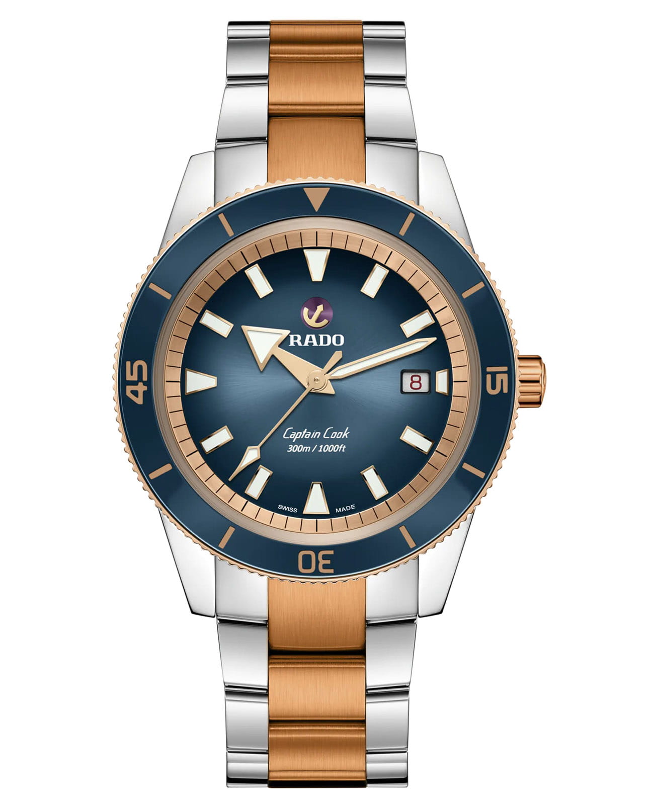 Эти 42-миллиметровые часы Captain Cook Automatic поставляются с лакированным сине-черным градиентным циферблатом, который идеально сочетается с браслетом из нержавеющей стали со средними звеньями цвета розового золота. Стрелки и индексы розово-золотого цвета с белым покрытием Super-LumiNova® обеспечивают отличную видимость. Для более высокой точности автоматическое перемещение Rado R763 внутри превышает стандартные требования к проверке точности с 3 до 5 позиций. Полированный корпус из нержавеющей стали с сапфировым стекломСапфировое стеклоПрочный и надёжный материал из кристалла сапфира синтетического происхождения, характеризующийся особой твёрдостью и устойчивостью к царапинам и повреждениям. в форме коробки обеспечивает уникальный эффект «пузыря» для выдающегося внешнего вида. Система EasyClip позволяет быстро и легко менять ремешки для настройки часов и персонализации стиля.
