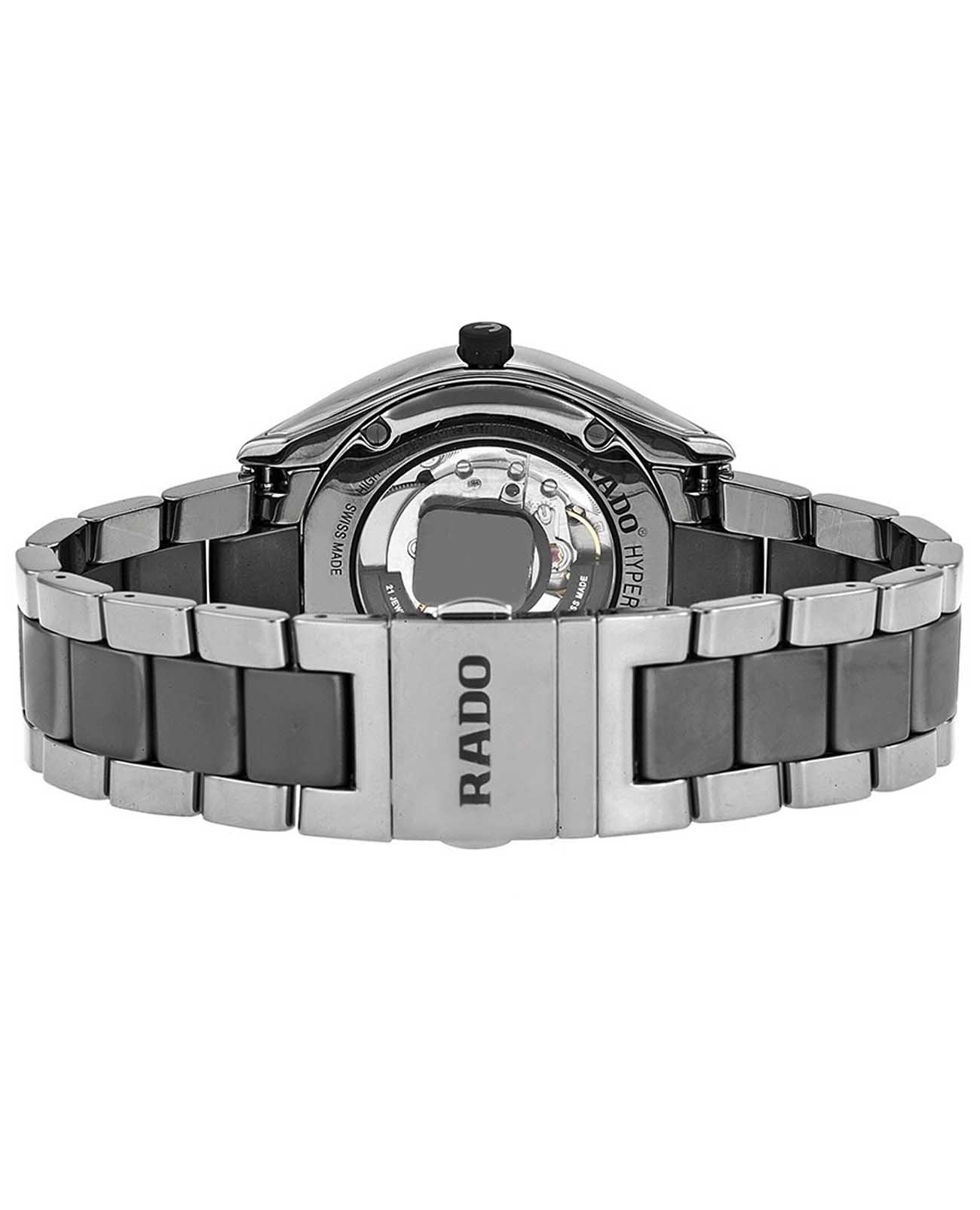 Мужские механические швейцарские часы с автоподзаводом Rado Hyperchrome R32165102. Сапфировое стеклоСапфировое стеклоПрочный и надёжный материал из кристалла сапфира синтетического происхождения, характеризующийся особой твёрдостью и устойчивостью к царапинам и повреждениям. устойчивое к мелким механическим повреждениям. Корпус часов изготовлен из нержавеющей стали и высокотехнологичной плазменной керамикиВысокотехнологичная плазменная керамикаИнновационный материал, технология запатентована. Выплавление керамики осуществляется в печи при 20 000 °C, белоснежный материал под воздействием ультравысокой температуры приобретает уникальный блеск, присущий металлам.. Окошко даты находится в положении 3 часа. Стрелки с люминесцентным покрытиемЛюминесцентное покрытиеПозволяет считывать показания времени в темноте. Производители наносят на стрелки, часовые индексы, безель или поверхность циферблата светонакопительный состав, дающий холодное свечение.. Класс водозащиты: 100 метров, позволит плавать, нырять и заниматься другими водными видами спорта. Браслет из высокотехнологичной керамикиВысокотехнологичная керамикаИнновационный запатентованный Rado материал с гладкой или матовой поверхностью. Керамика за счёт кристаллической структуры обладает повышенной устойчивостью от возникновения царапин. Материал способен принимать температуру тела человека, обеспечивая невероятный комфорт при ношении. на раскладной застёжкеРаскладная застёжкаТакой тип застёжки используется только на браслетах из металла. Она никогда не раскрывается полностью, происходит разделение на 2 и более частей. Раскладывающая застёжка снизит вероятность потери часов к минимуму..
