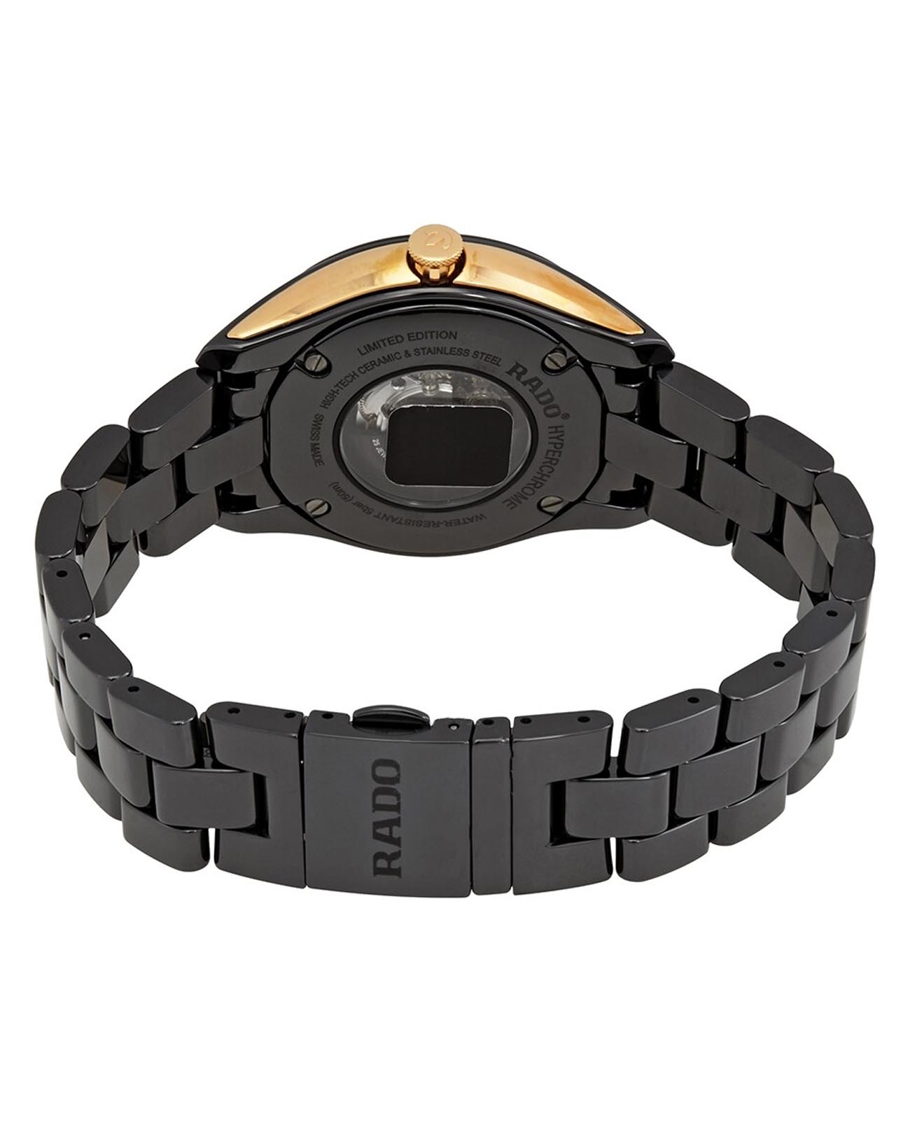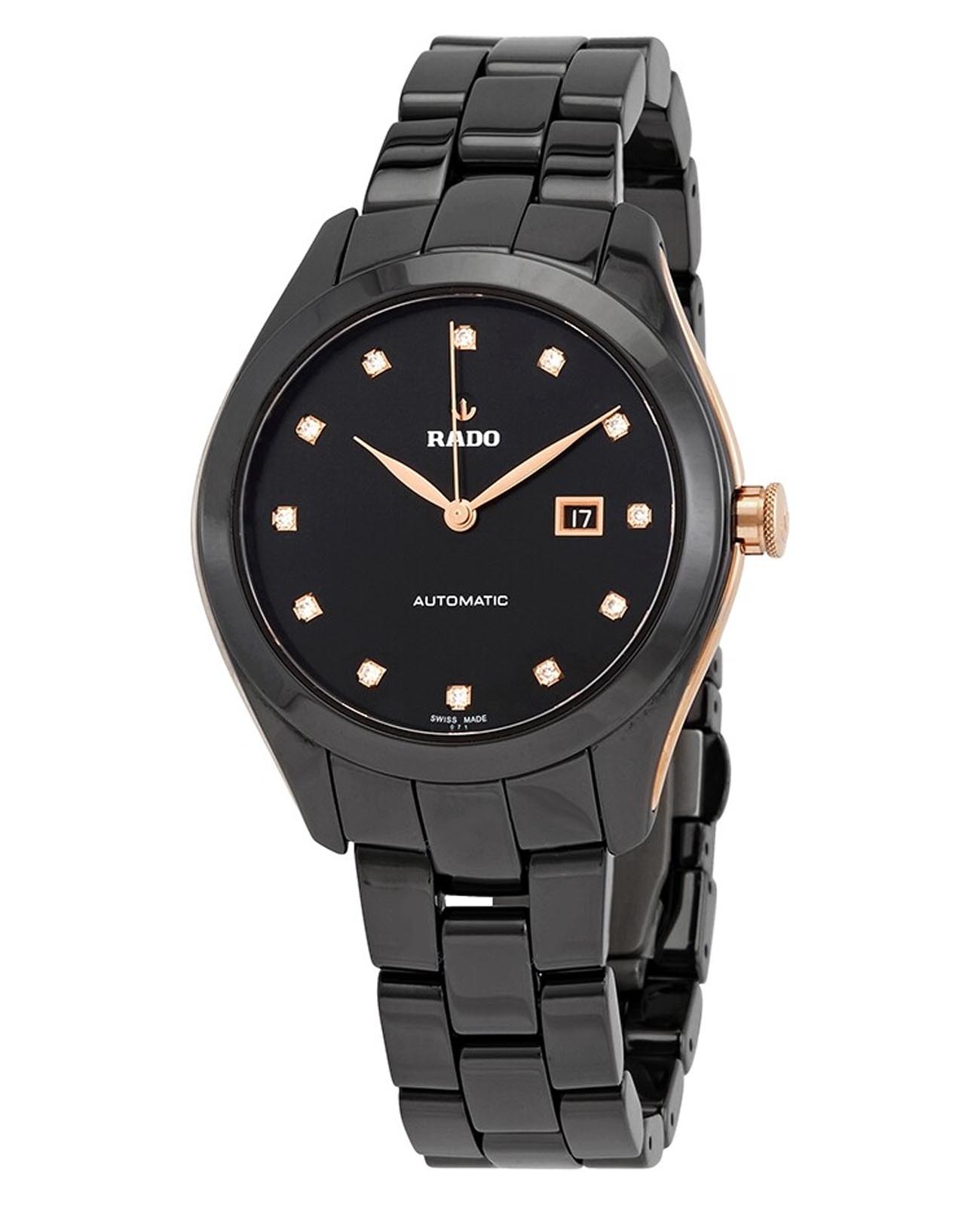 Женские механические швейцарские часы с автоподзаводом Rado Hyperchrome R32255712. Сапфировое стеклоСапфировое стеклоПрочный и надёжный материал из кристалла сапфира синтетического происхождения, характеризующийся особой твёрдостью и устойчивостью к царапинам и повреждениям. устойчивое к мелким механическим повреждениям. Корпус часов изготовлен из стали с PVD-покрытиемPVDУльтратонкое покрытие наносится в технике вакуумного напыления, сочетает в себе нитрид титана особой прочности со слоем золота или оксида хрома. Несёт в себе декоративную или защитную функцию. и высокотехнологичной керамикиВысокотехнологичная керамикаИнновационный запатентованный Rado материал с гладкой или матовой поверхностью. Керамика за счёт кристаллической структуры обладает повышенной устойчивостью от возникновения царапин. Материал способен принимать температуру тела человека, обеспечивая невероятный комфорт при ношении.. Окошко даты находится в положении 3 часа. Циферблат украшен бриллиантами. Класс водозащиты: 50 метров, позволит защитить корпус от случайных брызг или капель дождя. Браслет из высокотехнологичной керамикиВысокотехнологичная керамикаИнновационный запатентованный Rado материал с гладкой или матовой поверхностью. Керамика за счёт кристаллической структуры обладает повышенной устойчивостью от возникновения царапин. Материал способен принимать температуру тела человека, обеспечивая невероятный комфорт при ношении. на раскладной застёжкеРаскладная застёжкаТакой тип застёжки используется только на браслетах из металла. Она никогда не раскрывается полностью, происходит разделение на 2 и более частей. Раскладывающая застёжка снизит вероятность потери часов к минимуму..