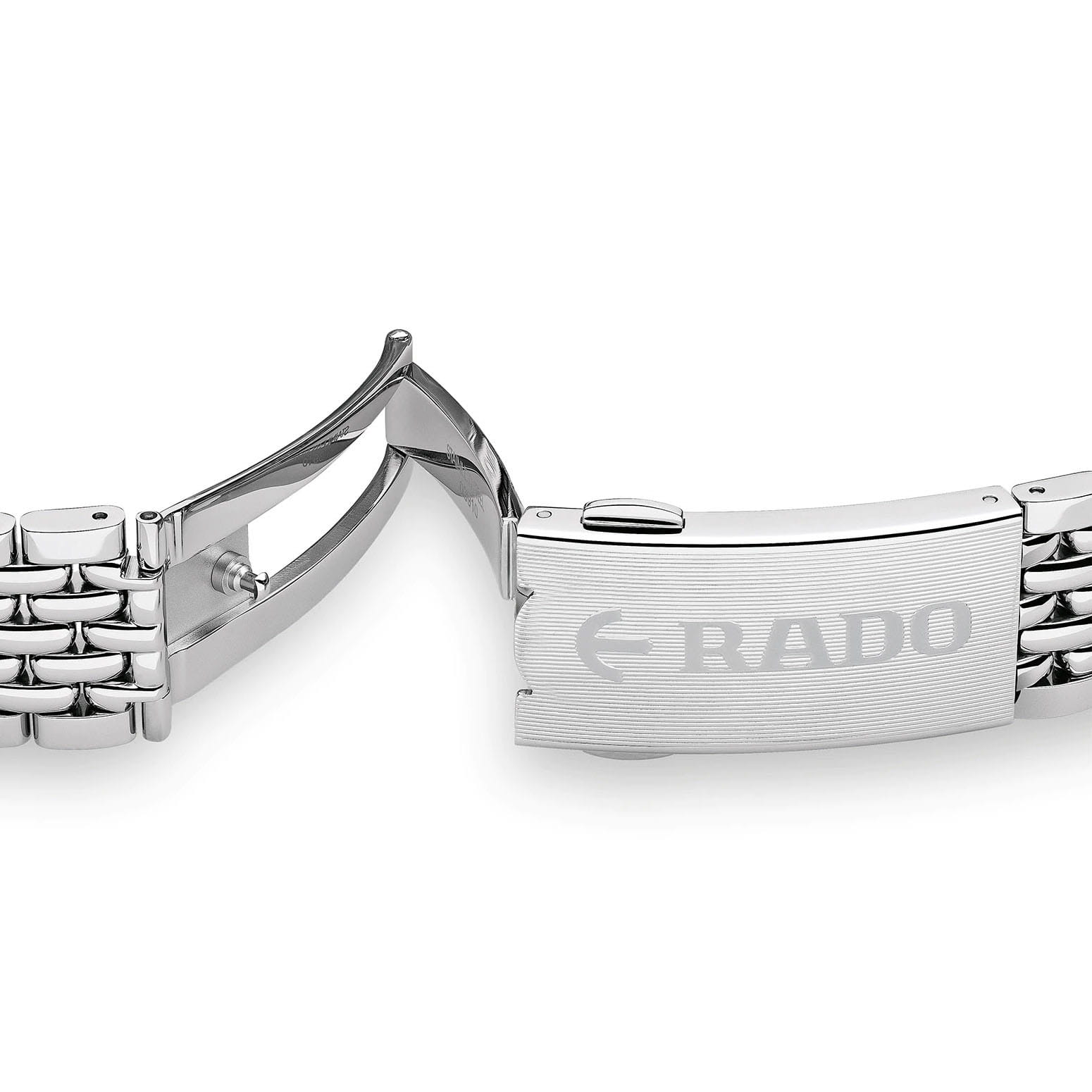 Брендовый аксессуар в серебристом исполнении дополнен винтажными деталями и оригинальными стрелками, выполненными в виде меча и стрелы. Премиальная модель с белым циферблатом идеальна для завершения образа солидного мужчины. Высокая точность хода обеспечивается за счёт швейцарского автоматического калибра ETA C07.611 с 80-часовым запасом хода. Завинчивающаяся задняя крышка. Антибликовое покрытие сапфирового стекла. Корпус и браслет из нержавеющей стали 316L, безельБезельВнешний ободок, закрепляющий стекло. В спортивных часах так называется поворотное кольцо с делениями на циферблате, выполняет роль таймера – замеряет отрезки времени на шкале. Неподвижный безель – элемент декора. Однонаправленно вращающийся безель на дайверских часах позволяет фиксировать моменты погружения и выныривания на поверхность. из высокотехнологичной керамикиВысокотехнологичная керамикаИнновационный запатентованный Rado материал с гладкой или матовой поверхностью. Керамика за счёт кристаллической структуры обладает повышенной устойчивостью от возникновения царапин. Материал способен принимать температуру тела человека, обеспечивая невероятный комфорт при ношении.. Водостойкость 100 метров. Люминесцентная подсветкаЛюминесцентное покрытиеПозволяет считывать показания времени в темноте. Производители наносят на стрелки, часовые индексы, безель или поверхность циферблата светонакопительный состав, дающий холодное свечение.. Отображение числа. Диаметр корпуса: 37 мм.