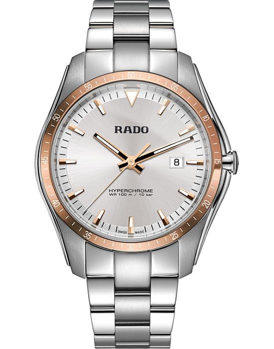 Швейцарские кварцевые часы Rado Hyperchrome R32502103. Сапфировое стеклоСапфировое стеклоПрочный и надёжный материал из кристалла сапфира синтетического происхождения, характеризующийся особой твёрдостью и устойчивостью к царапинам и повреждениям. устойчивое к мелким механическим повреждениям. Корпус изготовлен из нержавеющей стали. БезельБезельВнешний ободок, закрепляющий стекло. В спортивных часах так называется поворотное кольцо с делениями на циферблате, выполняет роль таймера – замеряет отрезки времени на шкале. Неподвижный безель – элемент декора. Однонаправленно вращающийся безель на дайверских часах позволяет фиксировать моменты погружения и выныривания на поверхность. из высокотехнологичной керамикиВысокотехнологичная керамикаИнновационный запатентованный Rado материал с гладкой или матовой поверхностью. Керамика за счёт кристаллической структуры обладает повышенной устойчивостью от возникновения царапин. Материал способен принимать температуру тела человека, обеспечивая невероятный комфорт при ношении.. Стрелки с люминесцентным покрытиемЛюминесцентное покрытиеПозволяет считывать показания времени в темноте. Производители наносят на стрелки, часовые индексы, безель или поверхность циферблата светонакопительный состав, дающий холодное свечение.. Класс водозащиты: 100 метров, позволит плавать, нырять и заниматься другими водными видами спорта. Браслет из стали на раскладной застёжкеРаскладная застёжкаТакой тип застёжки используется только на браслетах из металла. Она никогда не раскрывается полностью, происходит разделение на 2 и более частей. Раскладывающая застёжка снизит вероятность потери часов к минимуму..