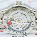 Циферблат оформлен по технологии Sunray (солнечные лучи) с уникальной спиральной отделкой. Накладные метки в виде штрихов и прямоугольные стрелки в стиле Baton добавляют строгий характер. Стрелки и метки имеют люминесцентное покрытиеЛюминесцентное покрытиеПозволяет считывать показания времени в темноте. Производители наносят на стрелки, часовые индексы, безель или поверхность циферблата светонакопительный состав, дающий холодное свечение., которое светится в темноте после небольшой зарядки на свету. Прозрачное окошко в положении 6 часов позволяет наблюдать за работой механизма часов.