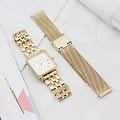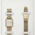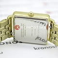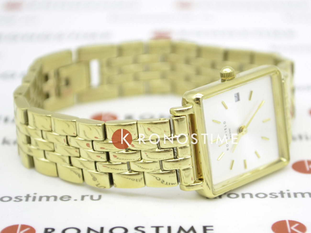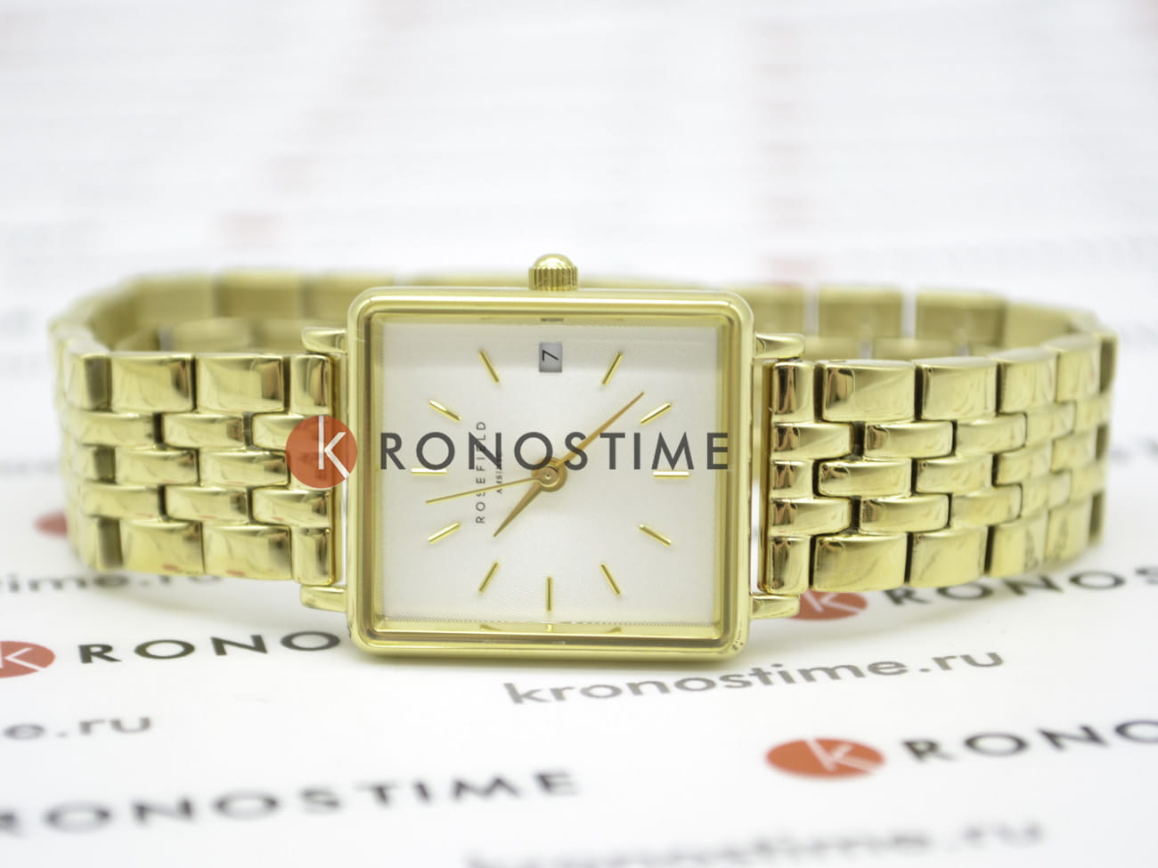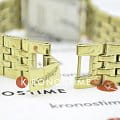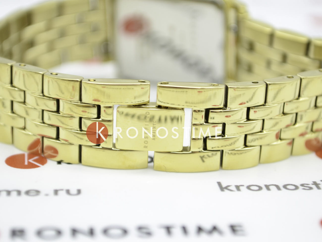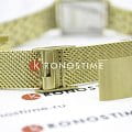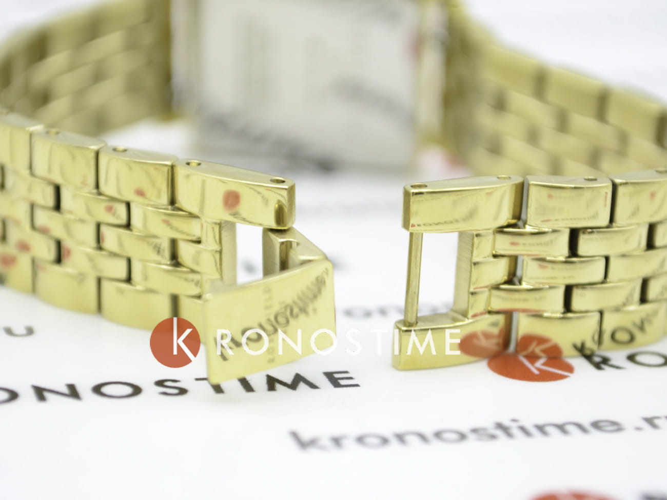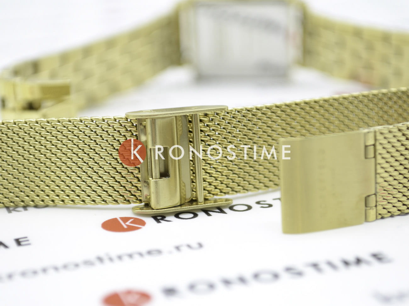 Женские кварцевые часы. Центральные часовая, минутная и секундная стрелки. Белый циферблат. Апертура даты в позиции 3 часов. Корпус выполнен из полированной нержавеющей стали с IP покрытием цвета желтого золота. Размер корпуса составляет 24х22 мм, толщина 6 мм. Стальной браслет с покрытием шириной 14 мм, ювелирная застежка. Прочное минеральное стекло устойчивое к мелким механическим повреждениям. Водостойкость WR 30 (брызги). В комплекте стальной браслет с покрытием выполненный в технике миланского плетения.