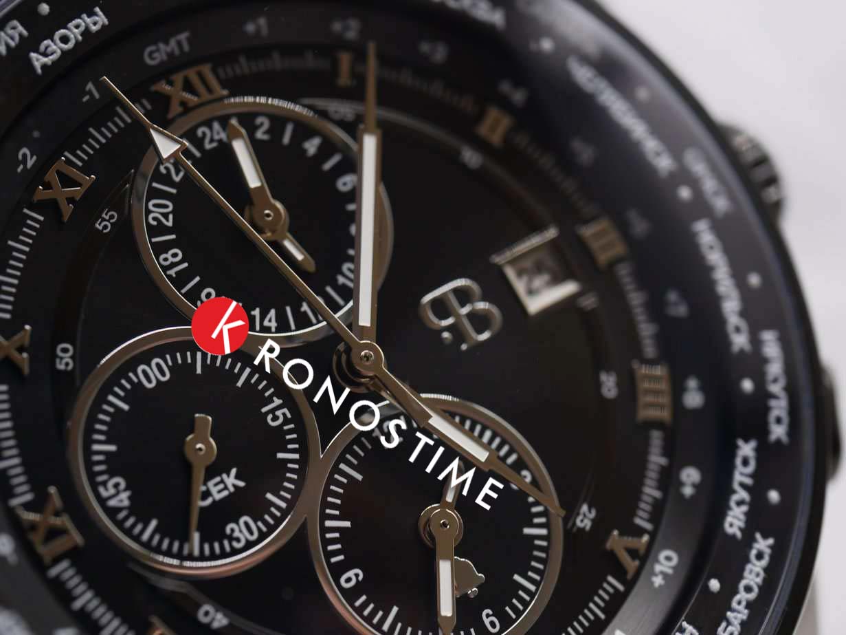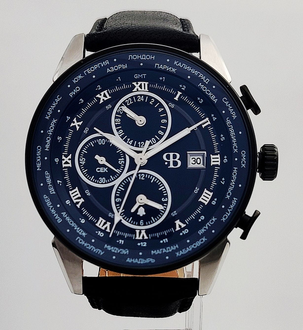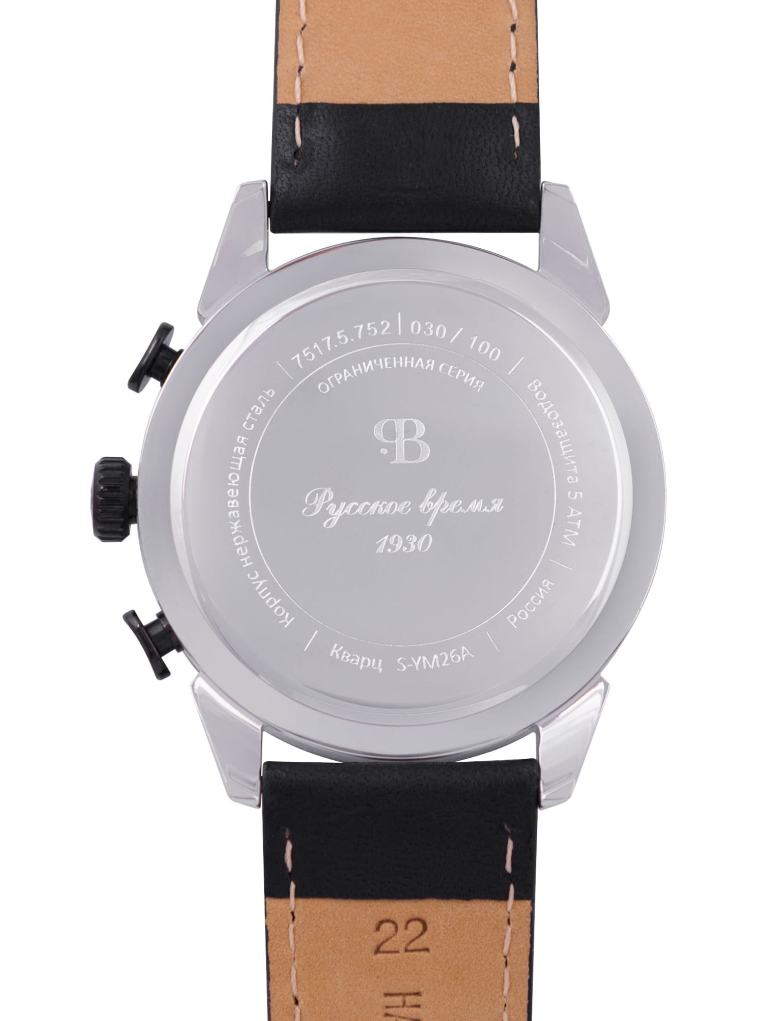 Российские часы Русское время c хронографомХронографФункция позволяет измерять отрезки времени с особой точностью: часы, минуты, секунды. Верным признаком хронографа является наличие на циферблате 3 дополнительных окошек-счётчиков. 75175752 оснащены кварцевый механизм, что обеспечивает исключительную надежность и точность хода. Корпус часов выполнен из стали, что придает ему долговечность и устойчивость к внешним воздействиям Минеральное стеклоМинеральное стеклоМинеральное стекло представляет собой искусственно выращенный минерал кварца. Такое стекло отличается особой устойчивостью к повреждениям и царапинам. Уступает по некоторым качествам сапфировому стеклу. устойчиво к мелким механическим повреждениям, что гарантирует долговечность и сохранение первоначального вида. БезельБезельВнешний ободок, закрепляющий стекло. В спортивных часах так называется поворотное кольцо с делениями на циферблате, выполняет роль таймера – замеряет отрезки времени на шкале. Неподвижный безель – элемент декора. Однонаправленно вращающийся безель на дайверских часах позволяет фиксировать моменты погружения и выныривания на поверхность. с PVD-покрытиемPVDУльтратонкое покрытие наносится в технике вакуумного напыления, сочетает в себе нитрид титана особой прочности со слоем золота или оксида хрома. Несёт в себе декоративную или защитную функцию.. Класс водозащиты часов составляет 50 метров, что позволяет защитить корпус от случайных брызг и капель дождя.Кожаный ремешок на стандартной застежке. Эти часы идеально подойдут для повседневного использования, сочетая в себе стиль, надежность и функциональность. Лимитированная серия.