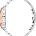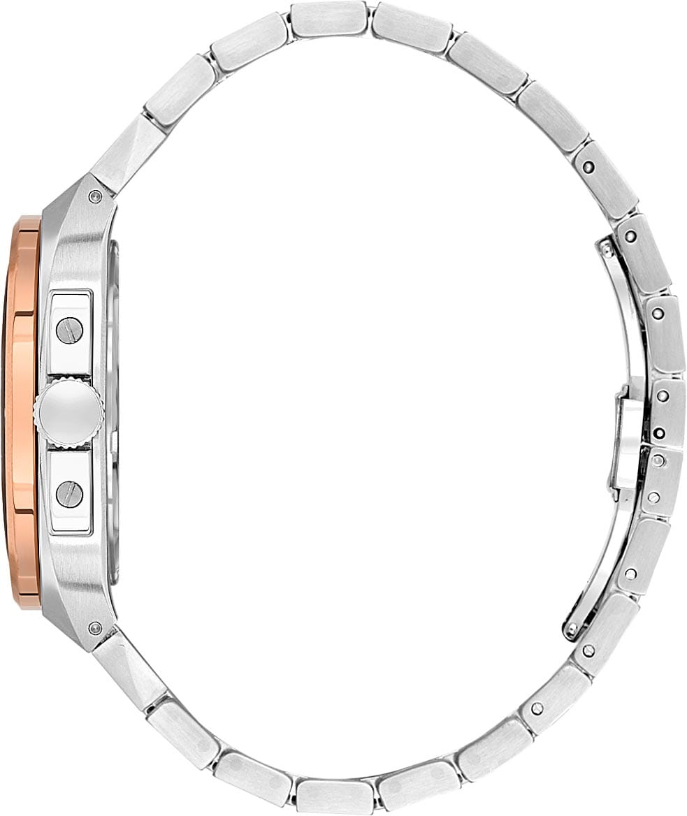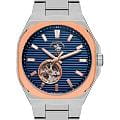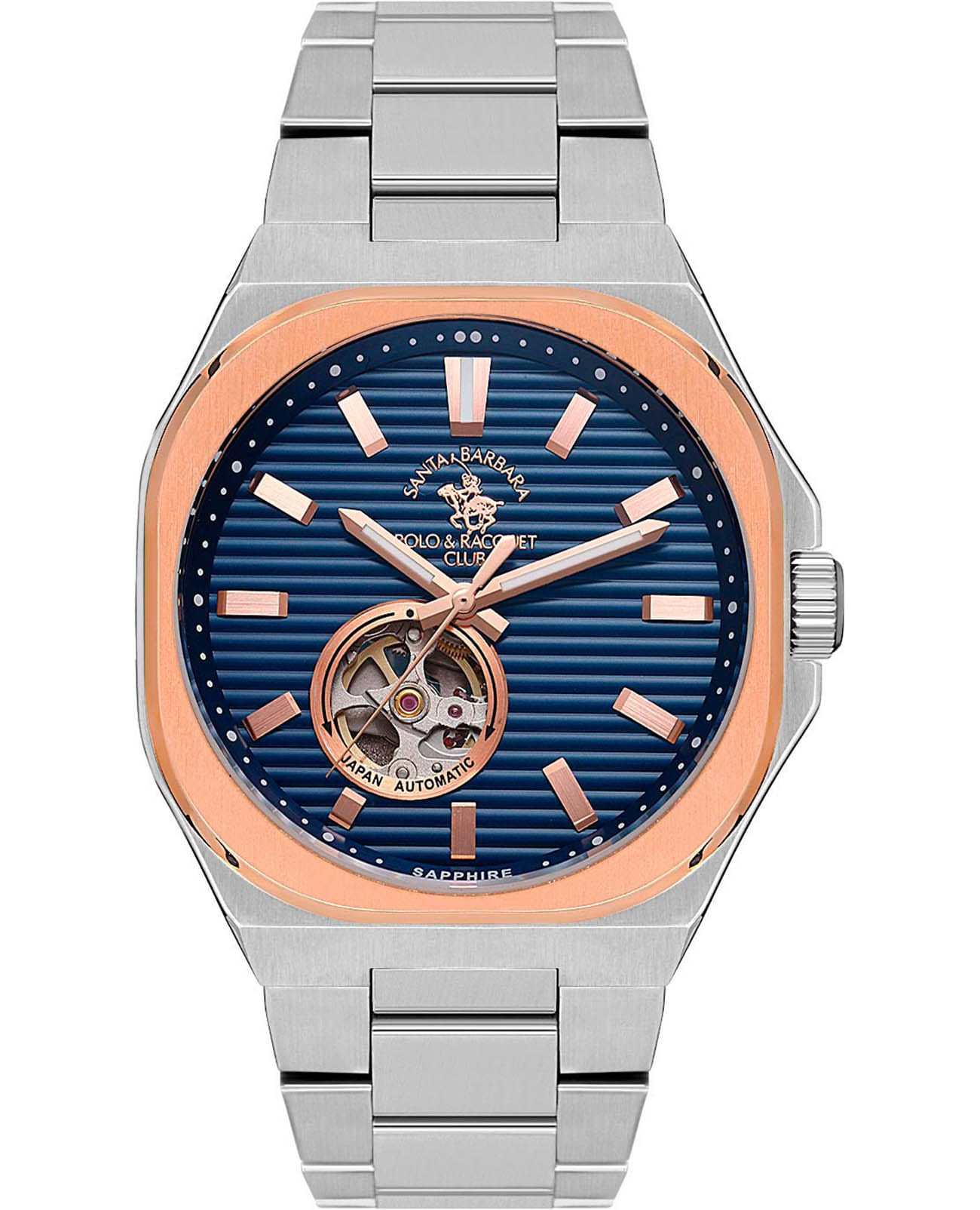 Мужские механические часы с автоподзаводом Santa Barbara Polo & Racquet Club — это сочетание практичности и сдержанного стиля. Корпус диаметром 40,5 мм выполнен из нержавеющей стали 316L. БезельБезельВнешний ободок, закрепляющий стекло. В спортивных часах так называется поворотное кольцо с делениями на циферблате, выполняет роль таймера – замеряет отрезки времени на шкале. Неподвижный безель – элемент декора. Однонаправленно вращающийся безель на дайверских часах позволяет фиксировать моменты погружения и выныривания на поверхность. с IP-покрытиемIP-покрытиеМетод ионного напыления. Демонстрирует повышенную устойчивость к истиранию, окислению и химическим веществам. Под воздействием высокого давления и температуры около 1500°C молекулы металла надёжно соединяются с частицами корпуса часов. розового золота, с матовой и полированной отделкой. Циферблат синего цвета фактурный, украшен фирменным логотипом и накладными метками в виде штрихов. Через прозрачное окошко на циферблате можно наблюдать за работой механизма. Стрелки прямоугольные, заострённые, в стиле Baton, с люминесцентным покрытиемЛюминесцентное покрытиеПозволяет считывать показания времени в темноте. Производители наносят на стрелки, часовые индексы, безель или поверхность циферблата светонакопительный состав, дающий холодное свечение., обеспечивающим хорошую читаемость в темноте. Циферблат защищён минеральным стеклом. Часы оснащены стальным браслетом с застёжкой «бабочка» с кнопкамиЗастёжка "бабочка"Такой вид застёжки дополняется предохранителями, помогающими избежать случайного раскрытия браслета. Обладают изящным исполнением. . Водонепроницаемость 50 м позволяет использовать часы в повседневных условиях. Идеальный выбор для тех, кто ценит качество, надёжность и утончённый дизайн.