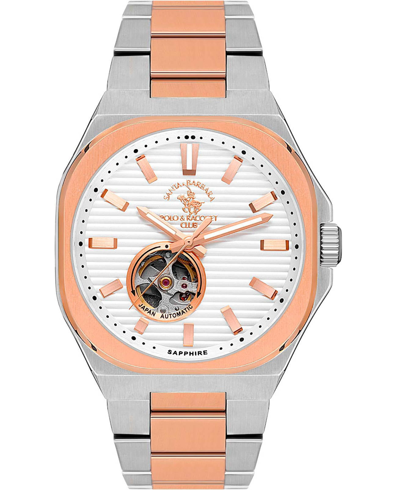 Мужские механические часы с автоподзаводом Santa Barbara Polo & Racquet Club — это сочетание практичности и сдержанного стиля. Корпус диаметром 40,5 мм выполнен из нержавеющей стали 316L. БезельБезельВнешний ободок, закрепляющий стекло. В спортивных часах так называется поворотное кольцо с делениями на циферблате, выполняет роль таймера – замеряет отрезки времени на шкале. Неподвижный безель – элемент декора. Однонаправленно вращающийся безель на дайверских часах позволяет фиксировать моменты погружения и выныривания на поверхность. с IP-покрытиемIP-покрытиеМетод ионного напыления. Демонстрирует повышенную устойчивость к истиранию, окислению и химическим веществам. Под воздействием высокого давления и температуры около 1500°C молекулы металла надёжно соединяются с частицами корпуса часов. розового золота, с матовой и полированной отделкой. Циферблат белого цвета фактурный, украшен фирменным логотипом и накладными метками в виде штрихов. Через прозрачное окошко на циферблате можно наблюдать за работой механизма. Стрелки прямоугольные, заострённые, в стиле Baton, с люминесцентным покрытиемЛюминесцентное покрытиеПозволяет считывать показания времени в темноте. Производители наносят на стрелки, часовые индексы, безель или поверхность циферблата светонакопительный состав, дающий холодное свечение., обеспечивающим хорошую читаемость в темноте. Циферблат защищён минеральным стеклом. Часы оснащены браслетом из стали с IP-покрытиемIP-покрытиеМетод ионного напыления. Демонстрирует повышенную устойчивость к истиранию, окислению и химическим веществам. Под воздействием высокого давления и температуры около 1500°C молекулы металла надёжно соединяются с частицами корпуса часов. на застёжке «бабочка» с кнопкамиЗастёжка "бабочка"Такой вид застёжки дополняется предохранителями, помогающими избежать случайного раскрытия браслета. Обладают изящным исполнением. . Водонепроницаемость 50 м позволяет использовать часы в повседневных условиях. Идеальный выбор для тех, кто ценит качество, надёжность и утончённый дизайн.