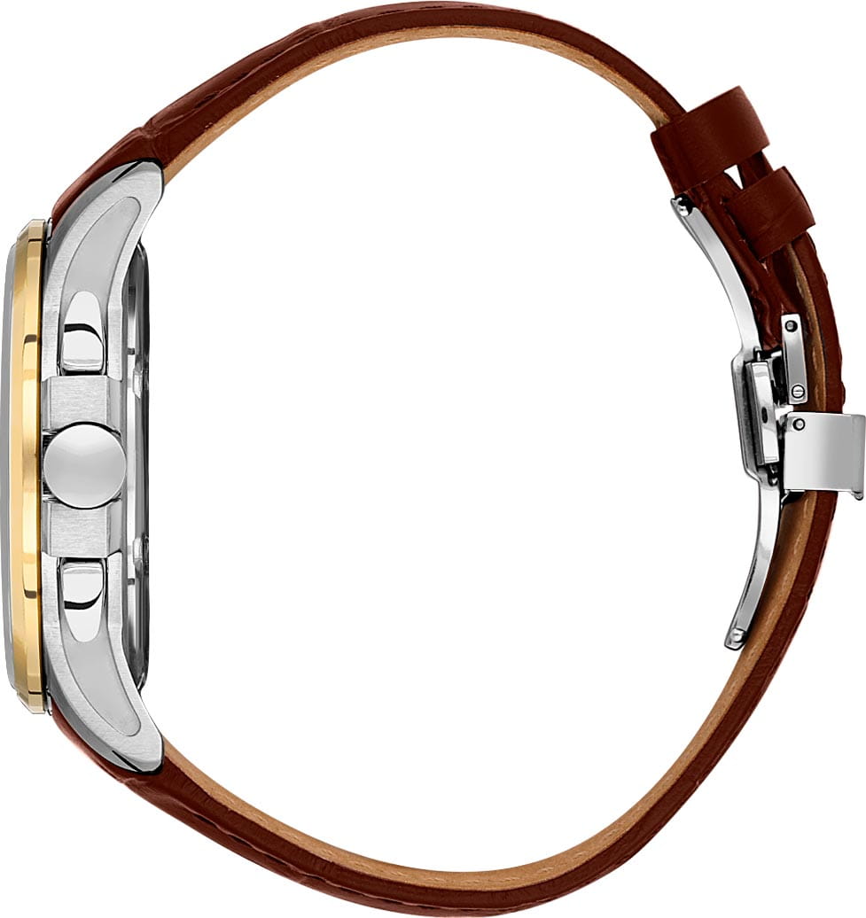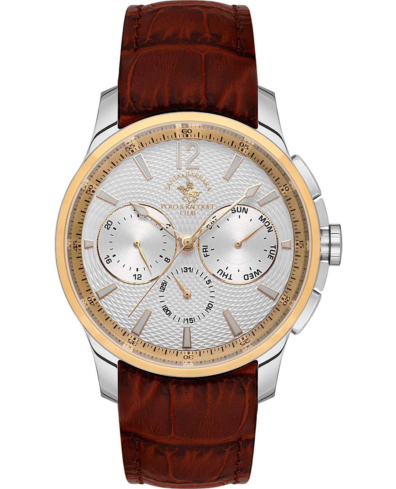 Мужские кварцевые часы Santa Barbara Polo & Racquet Club — это идеальный выбор для тех, кто ценит практичность и стиль. Корпус диаметром 43 мм выполнен из нержавеющей стали 316L с полированной отделкой. БезельБезельВнешний ободок, закрепляющий стекло. В спортивных часах так называется поворотное кольцо с делениями на циферблате, выполняет роль таймера – замеряет отрезки времени на шкале. Неподвижный безель – элемент декора. Однонаправленно вращающийся безель на дайверских часах позволяет фиксировать моменты погружения и выныривания на поверхность. из стали с IP-покрытиемIP-покрытиеМетод ионного напыления. Демонстрирует повышенную устойчивость к истиранию, окислению и химическим веществам. Под воздействием высокого давления и температуры около 1500°C молекулы металла надёжно соединяются с частицами корпуса часов.. Циферблат серебристого цвета украшен узором и фирменным логотипом, дополнен накладными метками в виде штрихов и арабской цифрой 12. Указатели дня недели и даты вынесены на отдельные субциферблаты, также присутствует индикация 24-часового формата времени. Стрелки и метки с люминесцентным покрытиемЛюминесцентное покрытиеПозволяет считывать показания времени в темноте. Производители наносят на стрелки, часовые индексы, безель или поверхность циферблата светонакопительный состав, дающий холодное свечение., обеспечивающим хорошую читаемость в темноте. Циферблат защищён минеральным стекломМинеральное стеклоМинеральное стекло представляет собой искусственно выращенный минерал кварца. Такое стекло отличается особой устойчивостью к повреждениям и царапинам. Уступает по некоторым качествам сапфировому стеклу.. Часы оснащены кожаным ремешком с застёжкой «бабочка» с кнопкамиЗастёжка "бабочка"Такой вид застёжки дополняется предохранителями, помогающими избежать случайного раскрытия браслета. Обладают изящным исполнением. . Водонепроницаемость 50 м позволяет использовать часы в повседневных условиях. Идеальный выбор для тех, кто ценит классический дизайн, точность и надёжность.