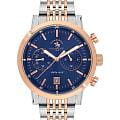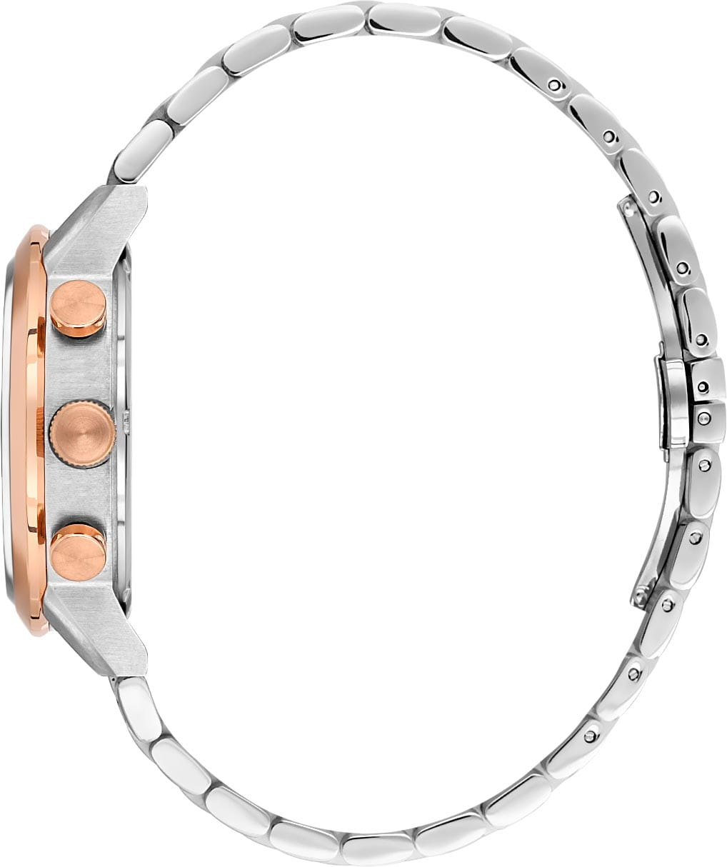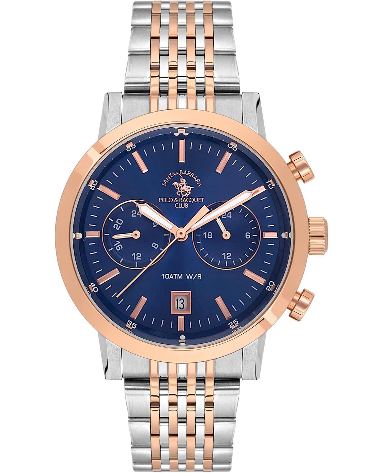 Santa Barbara Polo & Racquet Club Legend SB.1.10585-5 — стильные мужские часы, сочетающие спортивную динамику и функциональность. Крупный корпус выполнен из нержавеющей стали и гармонично дополнен стальным браслетом с частичным IP-покрытиемIP-покрытиеМетод ионного напыления. Демонстрирует повышенную устойчивость к истиранию, окислению и химическим веществам. Под воздействием высокого давления и температуры около 1500°C молекулы металла надёжно соединяются с частицами корпуса часов. на застёжке-бабочке с кнопкамиЗастёжка "бабочка"Такой вид застёжки дополняется предохранителями, помогающими избежать случайного раскрытия браслета. Обладают изящным исполнением. . Неподвижный безельБезельВнешний ободок, закрепляющий стекло. В спортивных часах так называется поворотное кольцо с делениями на циферблате, выполняет роль таймера – замеряет отрезки времени на шкале. Неподвижный безель – элемент декора. Однонаправленно вращающийся безель на дайверских часах позволяет фиксировать моменты погружения и выныривания на поверхность. с IP-покрытиемIP-покрытиеМетод ионного напыления. Демонстрирует повышенную устойчивость к истиранию, окислению и химическим веществам. Под воздействием высокого давления и температуры около 1500°C молекулы металла надёжно соединяются с частицами корпуса часов. цвета розового золота. Циферблат с акцентными стрелками с люминесцентным покрытиемЛюминесцентное покрытиеПозволяет считывать показания времени в темноте. Производители наносят на стрелки, часовые индексы, безель или поверхность циферблата светонакопительный состав, дающий холодное свечение. оформлен в многослойной структуре и оснащён вспомогательными индикаторами, включая 24-часовой формат времени, а также второй часовой поясВторой часовой поясФункция, позволяющая отображать время двух часовых поясов одновременно.. В нижней части расположено окошко даты, что делает модель ещё более практичной. Минеральное стеклоМинеральное стеклоМинеральное стекло представляет собой искусственно выращенный минерал кварца. Такое стекло отличается особой устойчивостью к повреждениям и царапинам. Уступает по некоторым качествам сапфировому стеклу. защищает циферблат от царапин, а кварцевый механизм обеспечивает высокую точность. Благодаря своей универсальной эстетике эти часы уместны и в деловой среде, и в повседневном образе.