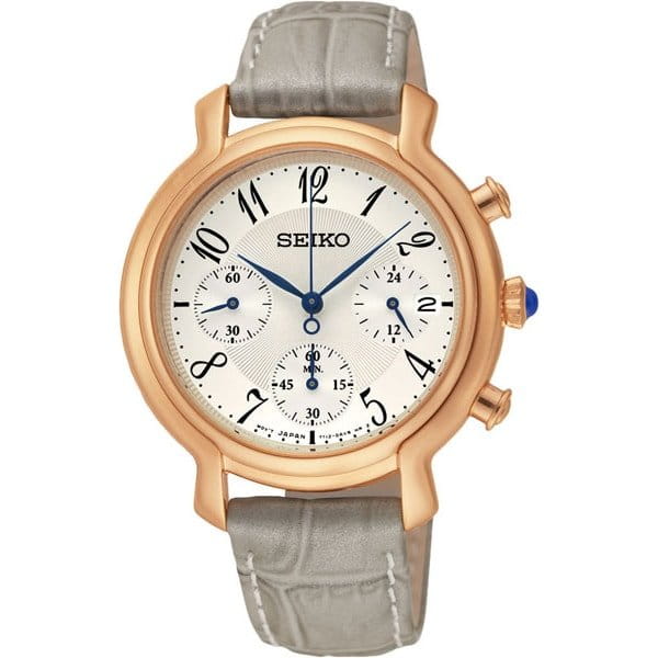 Роскошные японские женские часы. Кварцевый механизм, калибр Seiko 7T12. Круглый корпус часов выполнен из стали с PVD покрытием. Светлый фон циферблата с темными арабскими цифрами. Водонепроницаемость 5 ATM. Минеральное стекло повышенной прочности Hardlex, устойчивое к появлению царапин. Ремешок из натуральной кожи серого цвета. Часы оснащены хронографом. Современный и роскошный аксессуар.