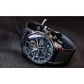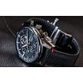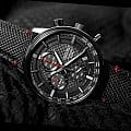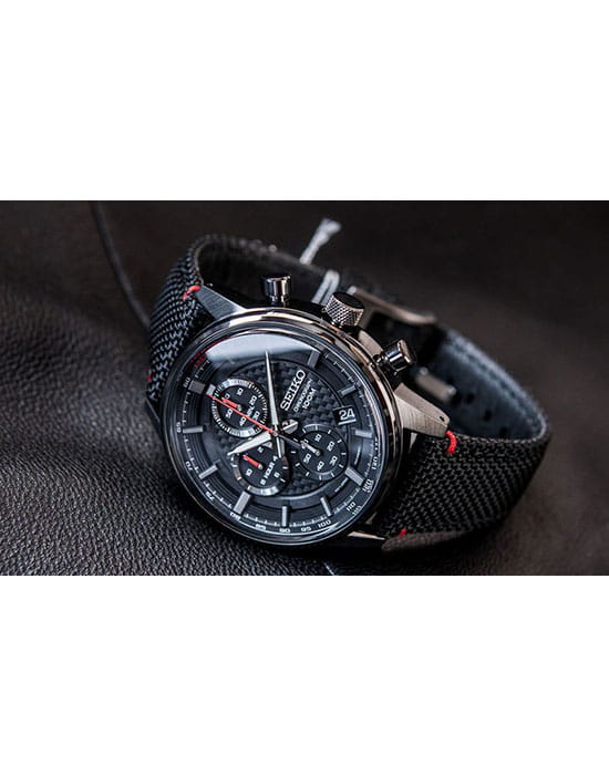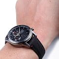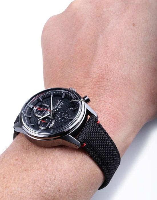 Аксессуар выполнен из нержавеющей стали 316L, материал устойчив к повреждениям. Кварцевый хронографХронографФункция позволяет измерять отрезки времени с особой точностью: часы, минуты, секунды. Верным признаком хронографа является наличие на циферблате 3 дополнительных окошек-счётчиков. оснащён японским механизмом Seiko 8T67 с точностью хода ±15 секунд в месяц. Калибр работает от батарейки, рассчитанной на 3 года. Функции: секундомер, календарь, тахиметрТахиметрРазмеченная шкала, располагается на ободке или безеле часов. Тахиметр позволяет рассчитать скорость на определённом участке пути, расстояние измеряется в километрах или милях.. Ремешок из нейлона имеет кожаную основу.