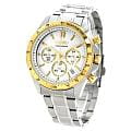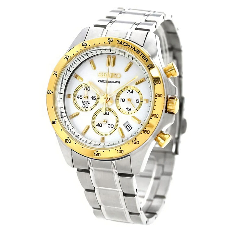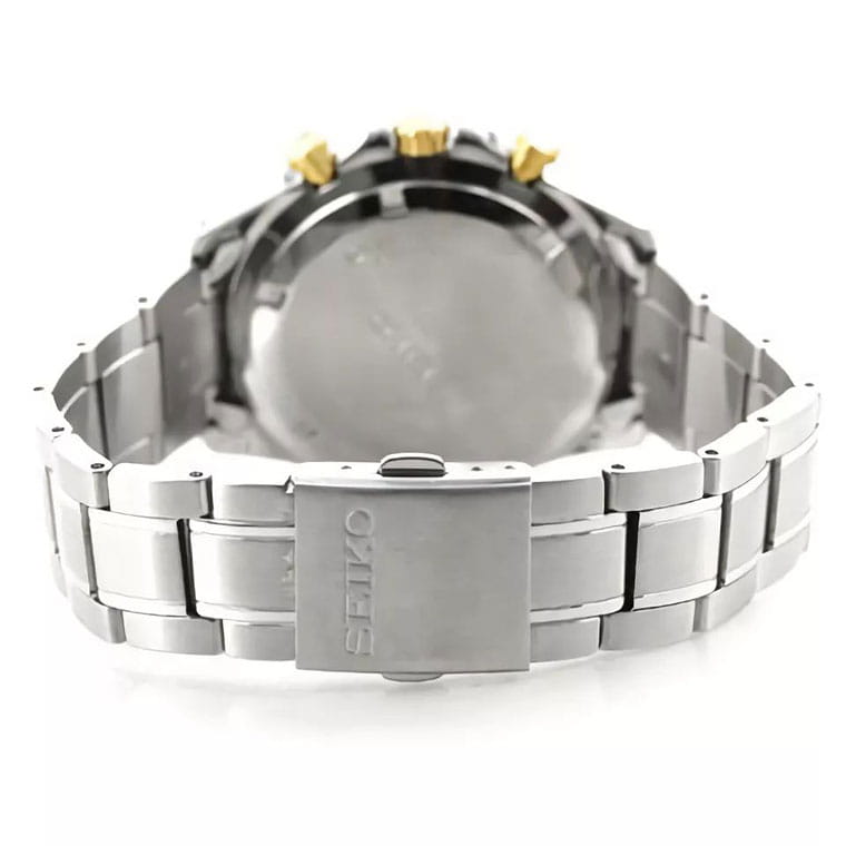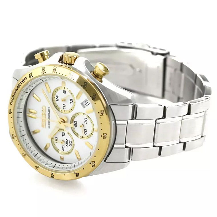 Мужские кварцевые часы-хронограф Seiko — это надёжный и функциональный аксессуар. Корпус диаметром 42 мм выполнен из нержавеющей стали 316L. БезельБезельВнешний ободок, закрепляющий стекло. В спортивных часах так называется поворотное кольцо с делениями на циферблате, выполняет роль таймера – замеряет отрезки времени на шкале. Неподвижный безель – элемент декора. Однонаправленно вращающийся безель на дайверских часах позволяет фиксировать моменты погружения и выныривания на поверхность. с PVD-покрытиемPVDУльтратонкое покрытие наносится в технике вакуумного напыления, сочетает в себе нитрид титана особой прочности со слоем золота или оксида хрома. Несёт в себе декоративную или защитную функцию.. Циферблат оформлен индексами, стрелками и тремя субциферблатами хронографа. Окошко даты расположено в положении между 4 и 5 часов. На циферблате присутствует шкала тахиметраТахиметрРазмеченная шкала, располагается на ободке или безеле часов. Тахиметр позволяет рассчитать скорость на определённом участке пути, расстояние измеряется в километрах или милях.. Стрелки и метки с люминесцентным покрытиемЛюминесцентное покрытиеПозволяет считывать показания времени в темноте. Производители наносят на стрелки, часовые индексы, безель или поверхность циферблата светонакопительный состав, дающий холодное свечение., обеспечивающим хорошую читаемость в темноте. Циферблат защищён прочным закалённым минеральным стеклом Hardlex. Механизм — японское кварцевое движение калибра 8T67 с функциями хронографаХронографФункция позволяет измерять отрезки времени с особой точностью: часы, минуты, секунды. Верным признаком хронографа является наличие на циферблате 3 дополнительных окошек-счётчиков. и секундомераСекундомерСекундоме́р — прибор, способный измерять интервалы времени с точностью до долей секунды. (точность 1/5 сек., время измерения до 12 часов). Заводная головка с защитой обеспечивает повышенную надёжность. Часы оснащены стальным браслетом на тройной раскладной застёжкеРаскладная застёжкаТакой тип застёжки используется только на браслетах из металла. Она никогда не раскрывается полностью, происходит разделение на 2 и более частей. Раскладывающая застёжка снизит вероятность потери часов к минимуму. с фиксатором. Водонепроницаемость 100 м позволяет использовать часы для плавания и повседневного ношения. Идеальный выбор для тех, кто ценит японское качество и универсальный дизайн.