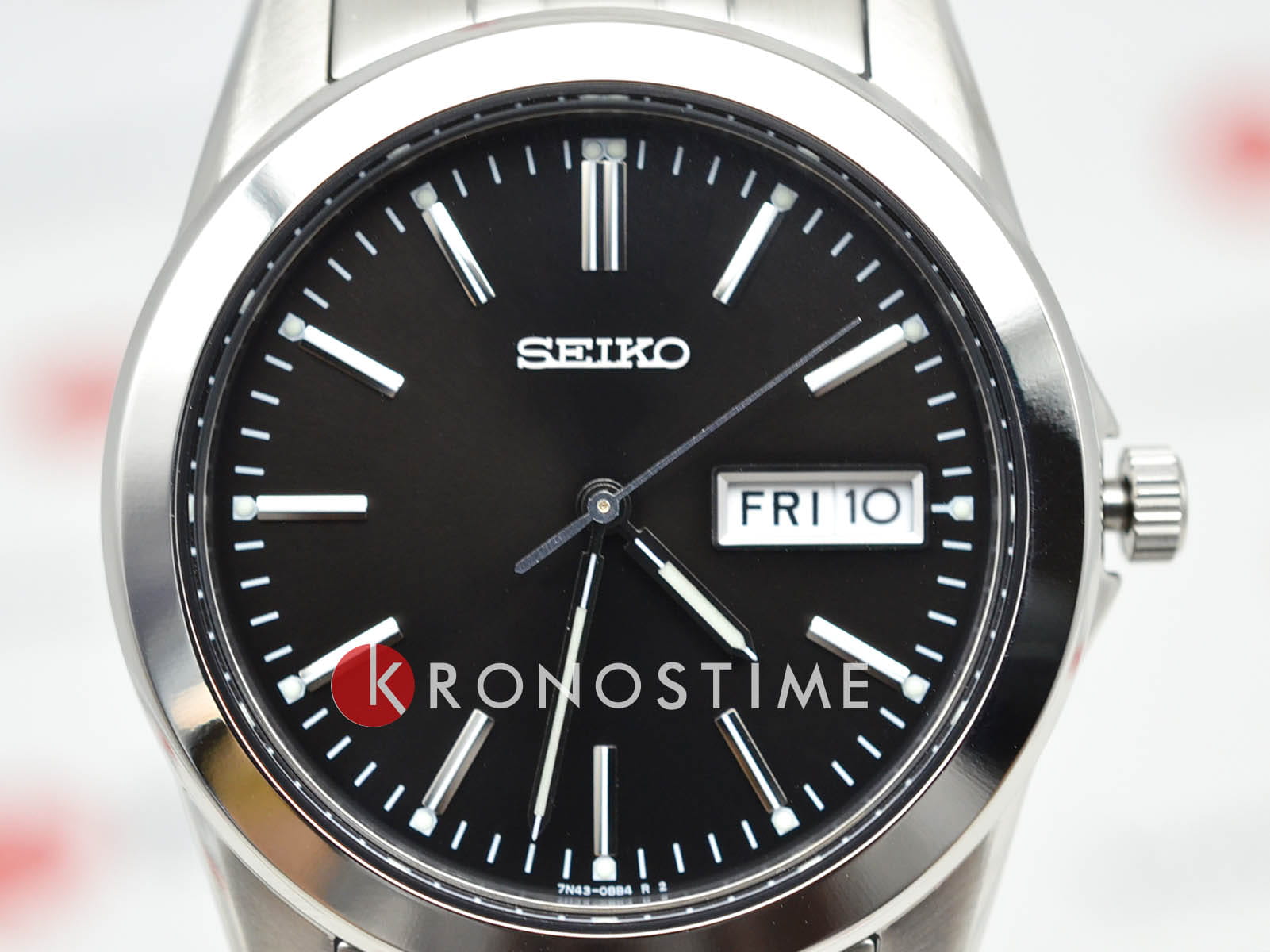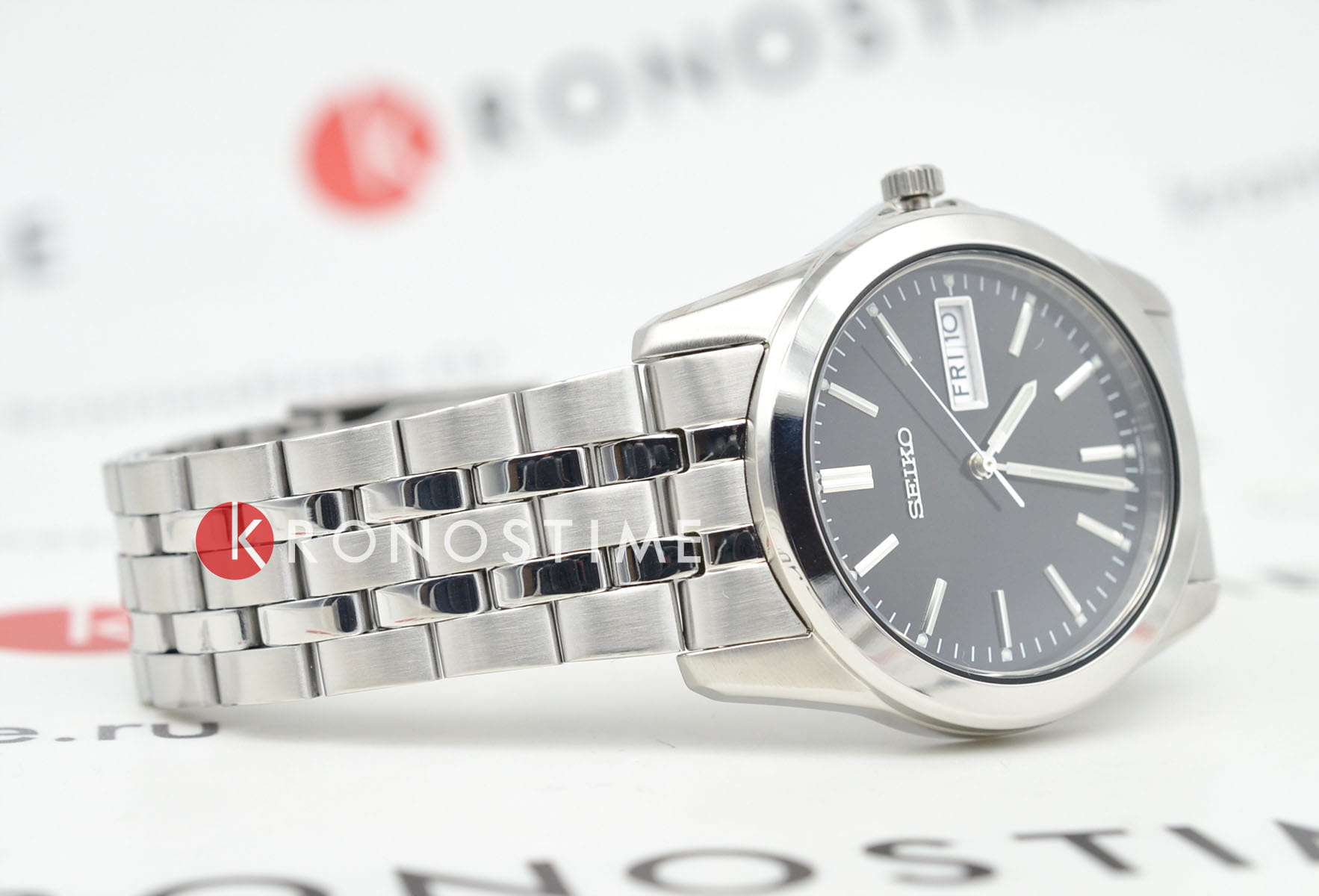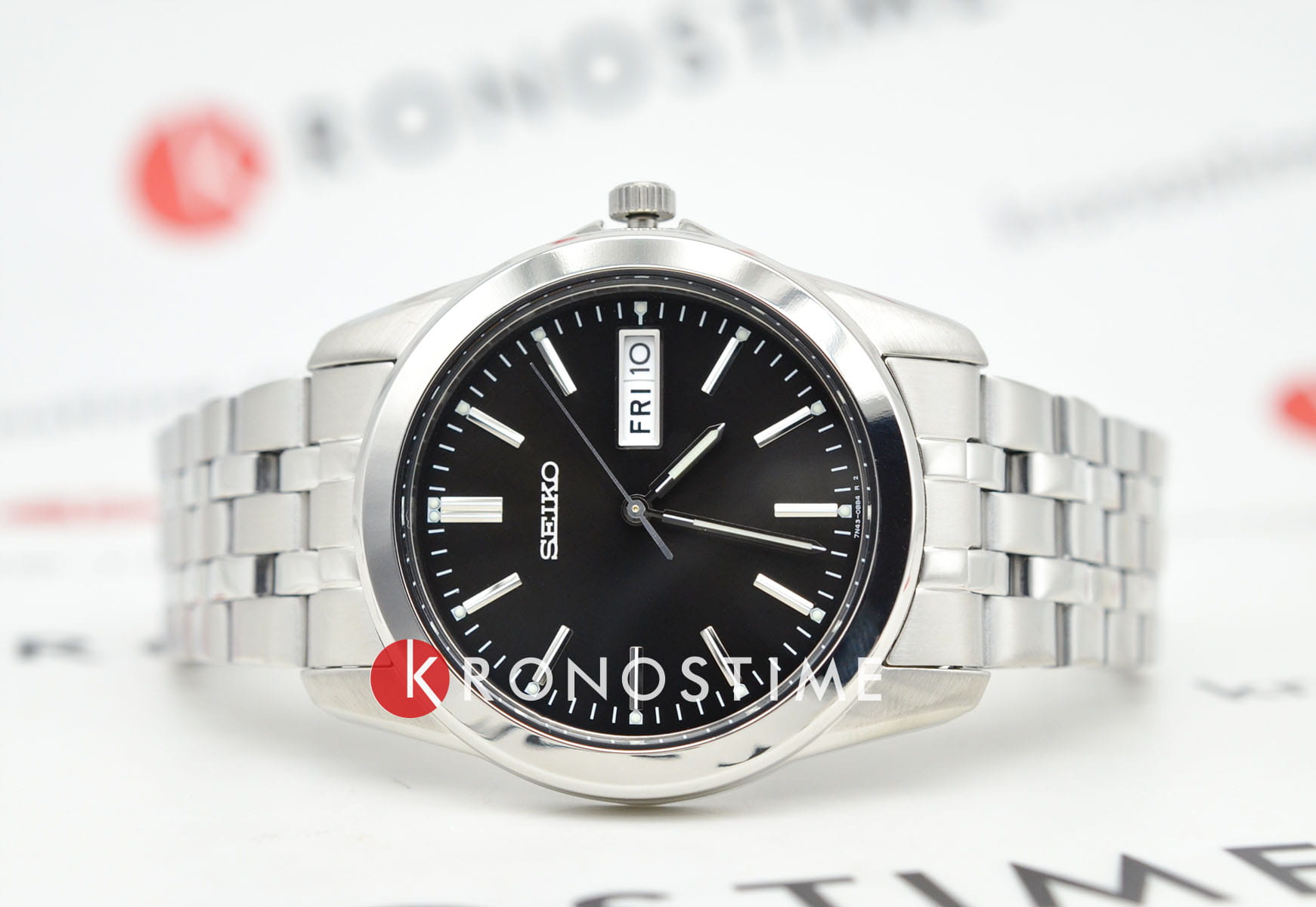 Мужские кварцевые часы Seiko — это элегантный аксессуар в классическом стиле. Корпус размером 38 мм и толщиной 8 мм выполнен из нержавеющей стали. Циферблат чёрного цвета оформлен индексами и стрелками. Указатели дня недели и даты вынесены на отдельные субциферблаты. Стрелки и метки с люминесцентным покрытиемЛюминесцентное покрытиеПозволяет считывать показания времени в темноте. Производители наносят на стрелки, часовые индексы, безель или поверхность циферблата светонакопительный состав, дающий холодное свечение., обеспечивающим хорошую читаемость в темноте. Циферблат защищён прочным защищён минеральным стекломМинеральное стеклоМинеральное стекло представляет собой искусственно выращенный минерал кварца. Такое стекло отличается особой устойчивостью к повреждениям и царапинам. Уступает по некоторым качествам сапфировому стеклу. от компании Seiko. Часы оснащены стальным браслетом с раскладной застёжкойРаскладная застёжкаТакой тип застёжки используется только на браслетах из металла. Она никогда не раскрывается полностью, происходит разделение на 2 и более частей. Раскладывающая застёжка снизит вероятность потери часов к минимуму.. Водонепроницаемость 30 м позволяет использовать часы в повседневных условиях. Идеальный выбор для тех, кто ценит японское качество и лаконичный дизайн.