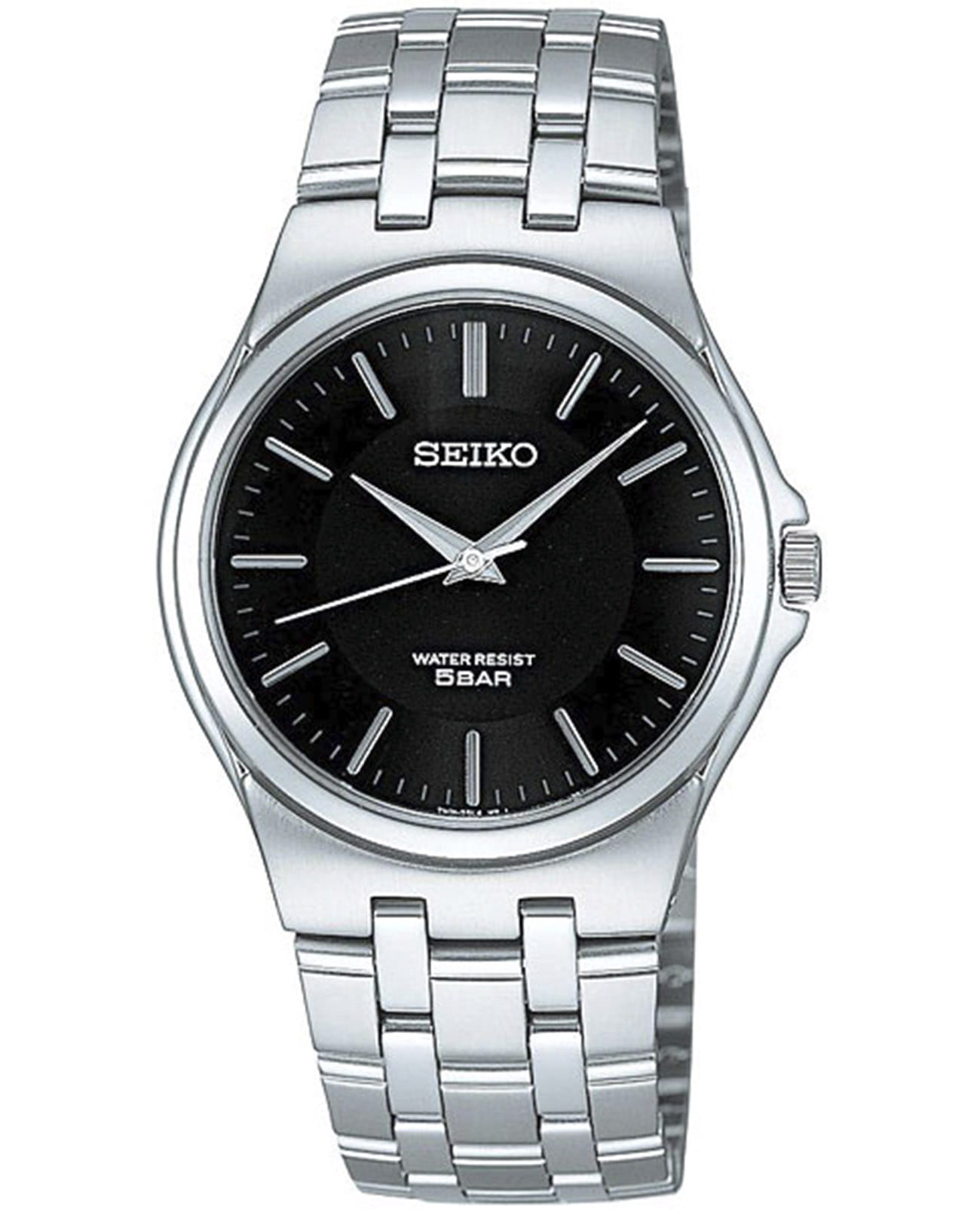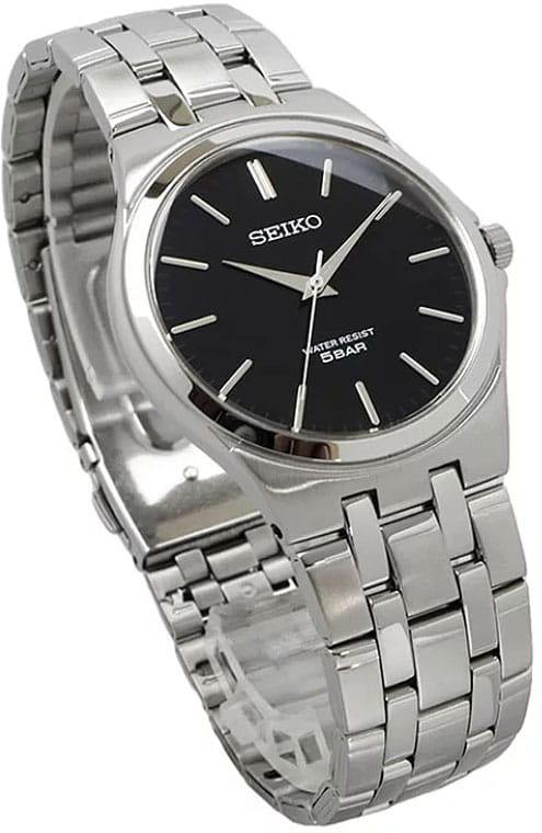 Мужские кварцевые часы Seiko — это надёжный и универсальный аксессуар. Корпус диаметром 36 мм выполнен из нержавеющей стали 316L. Циферблат чёрного цвета оформлен индексами и стрелками, включая центральную секундную стрелку. Циферблат защищён прочным закалённым минеральным стеклом Hardlex минеральным стекломМинеральное стеклоМинеральное стекло представляет собой искусственно выращенный минерал кварца. Такое стекло отличается особой устойчивостью к повреждениям и царапинам. Уступает по некоторым качествам сапфировому стеклу.. Механизм — кварцевый калибр 7N01 с высокой точностью хода (±10–15 сек. в месяц). Часы оснащены стальным браслетом на раскладной застёжкеРаскладная застёжкаТакой тип застёжки используется только на браслетах из металла. Она никогда не раскрывается полностью, происходит разделение на 2 и более частей. Раскладывающая застёжка снизит вероятность потери часов к минимуму. с фиксатором. Водонепроницаемость 50 м позволяет использовать часы в повседневных условиях. Идеальный выбор для тех, кто ценит японское качество и классический дизайн.