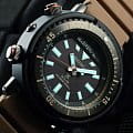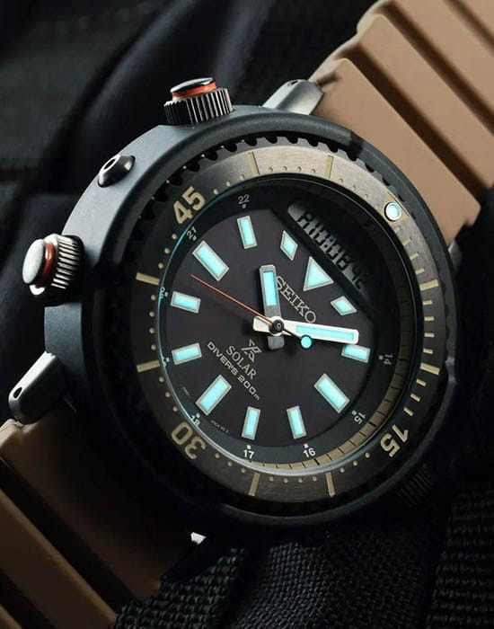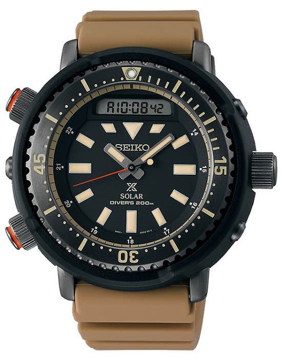 Японские мужские часы Seiko SNJ029P1 из коллекции Prospex стали перевоплощением легендарного хронографаХронографФункция позволяет измерять отрезки времени с особой точностью: часы, минуты, секунды. Верным признаком хронографа является наличие на циферблате 3 дополнительных окошек-счётчиков. 80-х годов, который предпочитал носить актёр Арнольд Шварценеггер. Наручные часы отражают брутальный, спортивный характер. Внешний облик позаимствован у предшественника Seiko H558-5009, выполненный в дайверском стиле. Аксессуар работает за счёт японского кварцевого калибра Seiko H851, получающего энергию за счёт источников света – реализация технологии . При полностью заряженном элементе питания модель проработает 6 месяцев без необходимости подзарядки. Противоударный корпусУдаропрочный корпусМеханизм заключён в корпус, выполненный из современных материалов, устойчивых к ударам, механическим повреждениям и падению с высоты: инновационный пластик, карбон, нержавеющая сталь, титан. имеет двойную конструкцию, где нержавеющая сталь 316L дополнительно защищена полимерными протекторами. Циферблат оснащён минеральным закаленным стеклом Hardlex, прочным и устойчивым к царапинам. Сохраняется водостойкость до 200 метров в соответствии со стандартом ISO 6425. Дисплей подсвечивается светодиодомСветодиодная подсветкаСветодиодная или LED-подсветка обеспечивает появление яркого холодного свечения за счёт LED-элементов - маленьких лампочек. Они потребляют минимальное количество энергии, чаще всего можно встретить 1 светодиод, в нижней части циферблата., стрелки и индексы имеют люминесцентную подсветкуЛюминесцентное покрытиеПозволяет считывать показания времени в темноте. Производители наносят на стрелки, часовые индексы, безель или поверхность циферблата светонакопительный состав, дающий холодное свечение.. Функции: будильник, секундомер, вечный календарьВечный календарьКлассическое часовое усложнение, представляющее собой календарь, рассчитанный на несколько лет вперёд (стандартно – до 2099 года). Определяет текущую дату, день недели, месяц.. Диаметр корпуса: 47,8 мм.