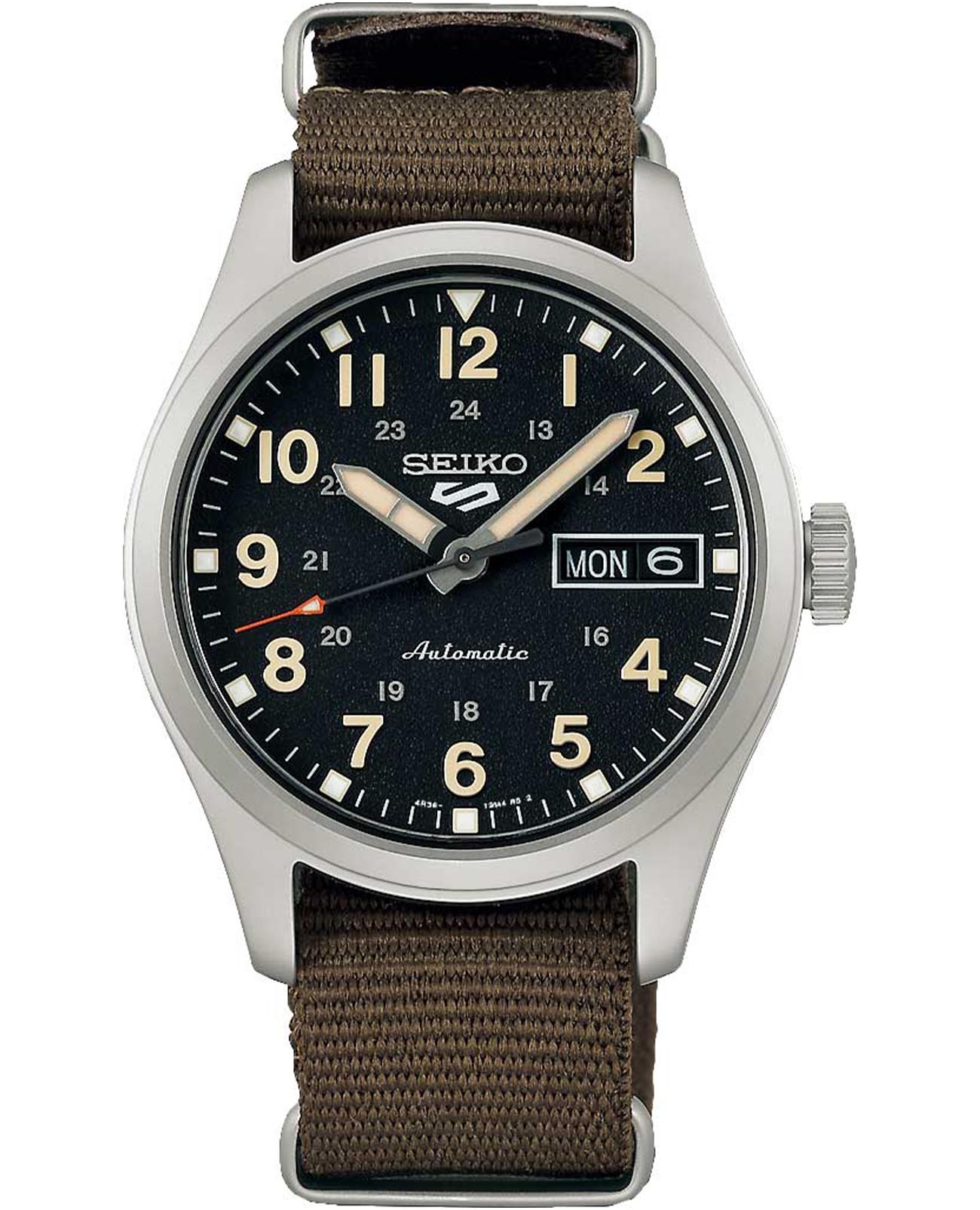Часы Seiko 5 Sports SRPJ85K1. Корпус диаметром 36 мм выполнен из нержавеющей стали, а чёрный циферблат защищён минеральным стекломМинеральное стеклоМинеральное стекло представляет собой искусственно выращенный минерал кварца. Такое стекло отличается особой устойчивостью к повреждениям и царапинам. Уступает по некоторым качествам сапфировому стеклу..