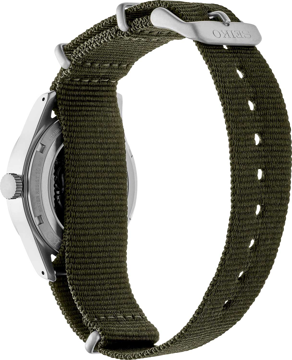 Водозащита 100 метров (10 бар) позволяет использовать часы для плавания и других водных видов спорта. Нейлоновый ремешок с классической пряжкой обеспечивает комфортное ношение и надёжную фиксацию на запястье.