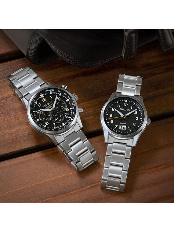 Мужские японские часы Seiko SSB447P1 c хронографомХронографФункция позволяет измерять отрезки времени с особой точностью: часы, минуты, секунды. Верным признаком хронографа является наличие на циферблате 3 дополнительных окошек-счётчиков., кварцевый механизм с высокой точностью. Минеральное стеклоМинеральное стеклоМинеральное стекло представляет собой искусственно выращенный минерал кварца. Такое стекло отличается особой устойчивостью к повреждениям и царапинам. Уступает по некоторым качествам сапфировому стеклу., устойчивое к появлению царапин, обладающее высокой прозрачностью. Класс водозащиты: 100 метров, позволит плавать, нырять и заниматься другими водными видами спорта. Корпус и браслет часов изготовлен из стали. Неподвижный безельБезельВнешний ободок, закрепляющий стекло. В спортивных часах так называется поворотное кольцо с делениями на циферблате, выполняет роль таймера – замеряет отрезки времени на шкале. Неподвижный безель – элемент декора. Однонаправленно вращающийся безель на дайверских часах позволяет фиксировать моменты погружения и выныривания на поверхность. со шкалой тахиметраТахиметрРазмеченная шкала, располагается на ободке или безеле часов. Тахиметр позволяет рассчитать скорость на определённом участке пути, расстояние измеряется в километрах или милях.. Стрелки и метки с люминесцентным покрытиемЛюминесцентное покрытиеПозволяет считывать показания времени в темноте. Производители наносят на стрелки, часовые индексы, безель или поверхность циферблата светонакопительный состав, дающий холодное свечение. LumiBrite. Браслет на раскладной застёжкеРаскладная застёжкаТакой тип застёжки используется только на браслетах из металла. Она никогда не раскрывается полностью, происходит разделение на 2 и более частей. Раскладывающая застёжка снизит вероятность потери часов к минимуму. с кнопками. СекундомерСекундомерСекундоме́р — прибор, способный измерять интервалы времени с точностью до долей секунды.. Окошко даты находится в положении между 4 и 5 часов.