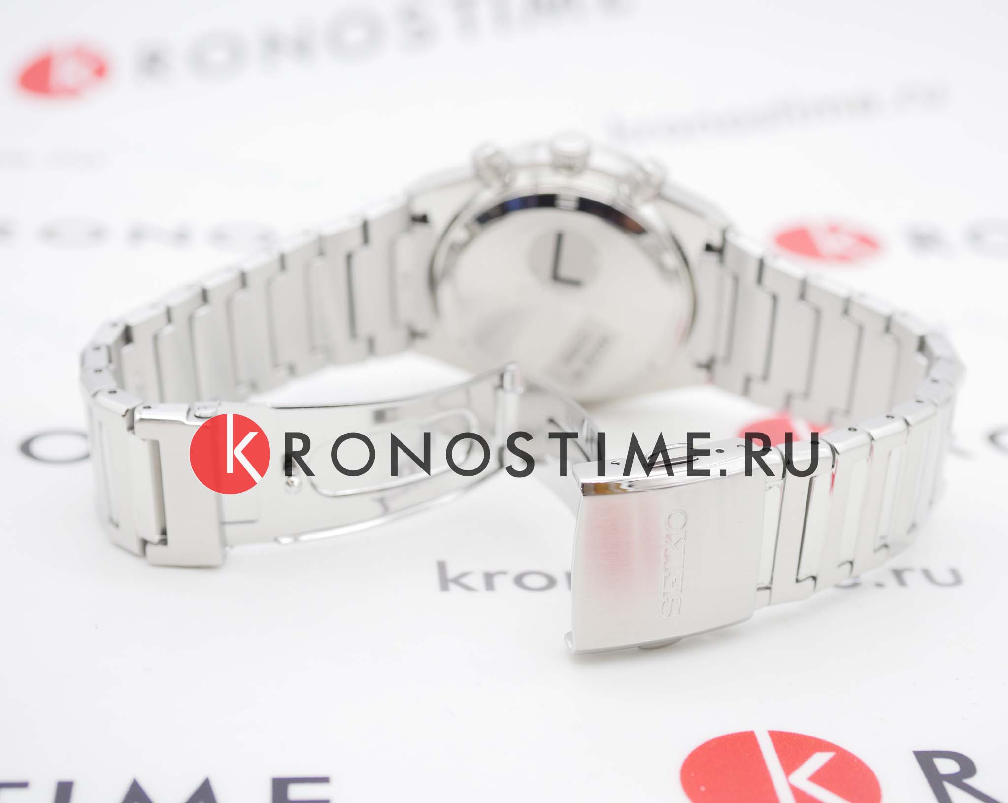 Мужские японские часы Seiko SSB451P1 c хронографомХронографФункция позволяет измерять отрезки времени с особой точностью: часы, минуты, секунды. Верным признаком хронографа является наличие на циферблате 3 дополнительных окошек-счётчиков., кварцевый механизм с высокой точностью. Сапфировое стеклоСапфировое стеклоПрочный и надёжный материал из кристалла сапфира синтетического происхождения, характеризующийся особой твёрдостью и устойчивостью к царапинам и повреждениям., устойчивое к появлению царапин, обладающее высокой прозрачностью. Класс водозащиты: 100 метров, позволит плавать, нырять и заниматься другими водными видами спорта. Корпус и браслет часов изготовлен из стали. Неподвижный безельБезельВнешний ободок, закрепляющий стекло. В спортивных часах так называется поворотное кольцо с делениями на циферблате, выполняет роль таймера – замеряет отрезки времени на шкале. Неподвижный безель – элемент декора. Однонаправленно вращающийся безель на дайверских часах позволяет фиксировать моменты погружения и выныривания на поверхность. со шкалой тахиметраТахиметрРазмеченная шкала, располагается на ободке или безеле часов. Тахиметр позволяет рассчитать скорость на определённом участке пути, расстояние измеряется в километрах или милях.. Стрелки и метки с люминесцентным покрытиемЛюминесцентное покрытиеПозволяет считывать показания времени в темноте. Производители наносят на стрелки, часовые индексы, безель или поверхность циферблата светонакопительный состав, дающий холодное свечение. LumiBrite. Браслет на раскладной застёжкеРаскладная застёжкаТакой тип застёжки используется только на браслетах из металла. Она никогда не раскрывается полностью, происходит разделение на 2 и более частей. Раскладывающая застёжка снизит вероятность потери часов к минимуму. с кнопками. СекундомерСекундомерСекундоме́р — прибор, способный измерять интервалы времени с точностью до долей секунды.. Окошко даты находится в положении между 4 и 5 часов.