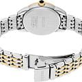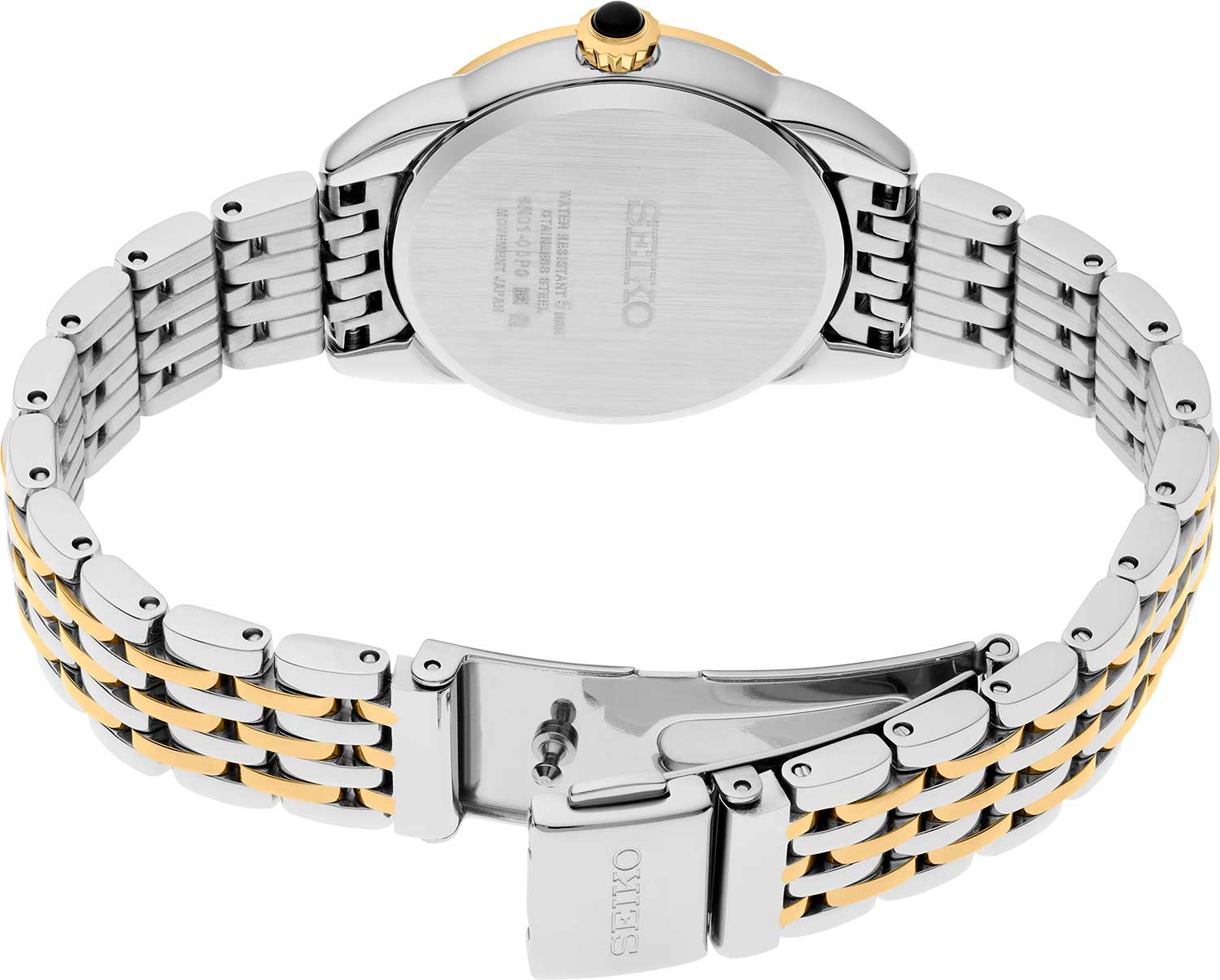 Женские японские часы Seiko Discover More SUR562P1 c кварцевым механизмом с высокой точностью с калибром 6N01. Минеральное стеклоМинеральное стеклоМинеральное стекло представляет собой искусственно выращенный минерал кварца. Такое стекло отличается особой устойчивостью к повреждениям и царапинам. Уступает по некоторым качествам сапфировому стеклу. выпуклое повышенной прочности Hardlex, устойчивое к появлению царапин, обладающее высокой прозрачностью. Водозащита до 5 ATM позволяет не снимать часы при дожде, мытье рук или случайных брызгах. Корпус диаметром 28,7 мм и браслет часов изготовлен из нержавеющей стали с PVDPVDУльтратонкое покрытие наносится в технике вакуумного напыления, сочетает в себе нитрид титана особой прочности со слоем золота или оксида хрома. Несёт в себе декоративную или защитную функцию. покрытием. Циферблат представлен с метками в виде арабских цифр. Браслет с раскладной застёжкойРаскладная застёжкаТакой тип застёжки используется только на браслетах из металла. Она никогда не раскрывается полностью, происходит разделение на 2 и более частей. Раскладывающая застёжка снизит вероятность потери часов к минимуму. с фиксатором. Seiko — это гармония изящного дизайна и технологичной надёжности, компактный и стильный выбор для повседневной классики.